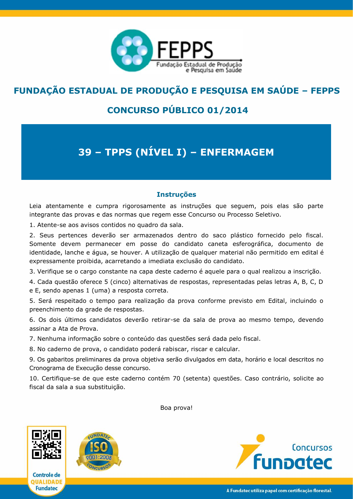 pcimarkpci MjgwNDowMjE0Ojg2YTY6NTE4ZjowMDAxOjAwMDA6ZjFhODpiOWFh:VHVlLCAyNyBNYXkgMjAyNSAwNzozNzo1MyAtMDMwMA== www.pciconcursos.com.br FUNDAÇÃO ESTADUAL DE PRODUÇÃO E PESQUISA EM SAÚDE – FEPPS CONCURSO PÚBLICO 01/2014 39 – TPPS (NÍVEL I) – ENFERMAGEM Instruções Leia atentamente e cumpra rigorosamente as instruções que seguem, pois elas são parte integrante das provas e das normas que regem esse Concurso ou Processo Seletivo. 1. Atente-se aos avisos contidos no quadro da sala. 2. Seus pertences deverão ser armazenados dentro do saco plástico fornecido pelo fiscal. Somente devem permanecer em posse do candidato caneta esferográfica, documento de identidade, lanche e água, se houver. A utilização de qualquer material não permitido em edital é expressamente proibida, acarretando a imediata exclusão do candidato. 3. Verifique se o cargo constante na capa deste caderno é aquele para o qual realizou a inscrição. 4. Cada questão oferece 5 (cinco) alternativas de respostas, representadas pelas letras A, B, C, D e E, sendo apenas 1 (uma) a resposta correta. 5. Será respeitado o tempo para realização da prova conforme previsto em Edital, incluindo o preenchimento da grade de respostas. 6. Os dois últimos candidatos deverão retirar-se da sala de prova ao mesmo tempo, devendo assinar a Ata de Prova. 7. Nenhuma informação sobre o conteúdo das questões será dada pelo fiscal. 8. No caderno de prova, o candidato poderá rabiscar, riscar e calcular. 9. Os gabaritos preliminares da prova objetiva serão divulgados em data, horário e local descritos no Cronograma de Execução desse concurso. 10. Certifique-se de que este caderno contém 70 (setenta) questões. Caso contrário, solicite ao fiscal da sala a sua substituição. Boa prova! pcimarkpci MjgwNDowMjE0Ojg2YTY6NTE4ZjowMDAxOjAwMDA6ZjFhODpiOWFh:VHVlLCAyNyBNYXkgMjAyNSAwNzozNzo1MyAtMDMwMA== www.pciconcursos.com.br LP_NS_V4_2/12/201414:30:27 Execução: Fundatec NÍVEL SUPERIOR 2 LÍNGUA PORTUGUESA Instrução: As questões de números 01 a 10 referem-se ao texto abaixo. Tão óbvio 01 02 03 04 05 06 07 08 09 10 11 12 13 14 15 16 17 18 19 20 21 22 23 24 25 26 27 28 29 30 31 32 33 34 35 36 Sempre tive mais simpatia por simplificar do que por complicar, mas agora isso se intensificou a ponto de eu começar a flertar com o budismo. Lendo alguns livros e assistindo ____ palestras, tenho percebido como o caminho para ser feliz é óbvio. Eu mesma já fui acusada de escrever sobre coisas óbvias, e não tenho como me defender contra isso: escrevo obviedades, sem dúvida. Porém me pergunto, intrigada: por que as obviedades andam tão necessárias? É que normalmente o óbvio fica soterrado .......... camadas e mais camadas de autoboicotes: as pessoas se irritam por besteiras, fazem escolhas idiotas, brigam no trânsito, não se abrem sobre o que sentem, .......... energia ____ toa, desrespeitam o coletivo e são refratárias a tudo que seja simples e fácil, já que a dor, a culpa e o ódio fazem parecer que elas têm uma vida mais profunda. Felicidade é algo que todos desejam e, ao mesmo tempo, renegam, visto que não saberiam lidar com algo que lhes deixaria tão soltos e leves. Com péssimo ibope junto aos intelectuais, a felicidade (que nada tem a ver com .........., mas com paz de espírito) ficou associada ____ superficialidade, enquanto que o sofrimento produz arte e filosofia. Quanto a esse aspecto, óbvio que ser um deprimido é mais charmoso. Pena que isso seja um ........... Ora, filosofia busca ____ consciência, que é chave para a felicidade, e a arte faz um bem danado a mentes atormentadas, que através dela conseguem realizar catarses e se conectar com um mundo que lhes parece hostil. Ou seja, não importa quem ou de que forma, todos querem viver melhor, sem esquecer que esse “melhor” tem sentidos diversos para uns e para outros. Seja qual for o significado de “melhor” pra você, ele é a sua perseguição. Só que alguns escolhem vias cheias de obstáculos e acabam não aproveitando a viagem. O bem-estar vem de onde? Óbvio: da convivência com amigos, de relações saudáveis, de não permitir que frustrações e ressentimentos virem a tônica da vida, de não reagir com exagero diante de insignificâncias, da valorização das miudezas grandiosas do cotidiano, de sentir-se disponível para o novo e o diferente a fim de enriquecer a própria existência, mantendo uma espiritualidade básica que envolva a generosidade, a compaixão, a tolerância (não é obrigatório ter religião pra isso). Mais: de aceitar as mudanças, de trocar de perspectiva quando se estiver obcecado com algo, de buscar a evolução da mente. Inventei a pólvora? Estou dizendo alguma coisa que você já não esteja careca de saber? É tudo tão evidente, tão incontestável, que dá até sono. O que você ainda está fazendo lendo essa página? Acorde e vá pra rua. Aí você sai e cruza com centenas de outros cidadãos para quem o óbvio é uma teoria sem aplicação prática, e que continuam encrencando-se de forma absurda, com o objetivo de voltarem para casa, estressados e sentindo-se vítimas do próprio destino. Charmosos, sem dúvida. Resta saber a que custo pessoal. (Martha Medeiros - ZERO HORA, 06/10/2013 – texto adaptado) QUESTÃO 01 – Assinale a alternativa que completa, correta e respectivamente, as lacunas pontilhadas das linhas 06, 08, 13 e 16. A) sobre – desperdiçam – bobisse – estereótipo B) sobre – desperdissam – bobisse – esteriótipo C) sob – desperdiçam – bobice – esteriótipo D) sob – desperdiçam – bobice – estereótipo E) sobre – desperdiçam – bobisse – esteriótipo QUESTÃO 02 – Assinale a alternativa que completa, correta e respectivamente, as lacunas tracejadas das linhas 02, 08, 13 e 16. A) à – à – a – à B) a – à – à – a C) a – a – a – à D) a – a – à – a E) à – à – à – à pcimarkpci MjgwNDowMjE0Ojg2YTY6NTE4ZjowMDAxOjA
