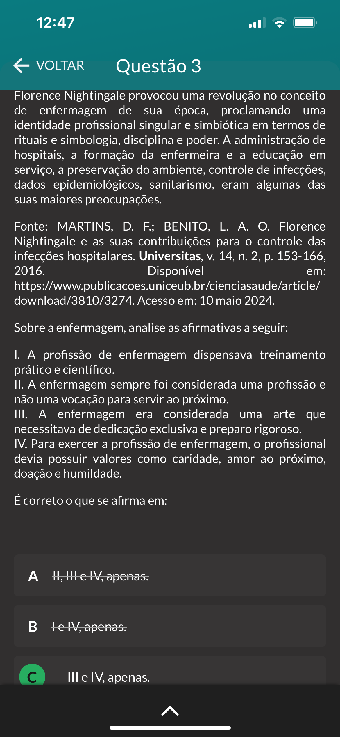 12:47 VOLTAR Questão 3 Florence Nightingale provocou uma revolução no conceito de enfermagem de sua época, proclamando uma identidade profissional singular e simbiótica em termos de rituais e simbologia, disciplina e poder. A administração de hospitais, a formação da enfermeira e a educação em serviço, a preservação do ambiente, controle de infecções, dados epidemiológicos, sanitarismo, eram algumas das suas maiores preocupações. Fonte: MARTINS, D. BENITO, L. A. O. Florence Nightingale e as suas contribuições para controle das infecções hospitalares. Universitas, V. 14, n. 2, p. 153-166, 2016. Disponível em: https://www.publicacoes.uniceub.br/cienciasaude/article/ download/3810/3274. Acesso em: 10 maio 2024. Sobre a enfermagem, analise as afirmativas a seguir: I. A profissão de enfermagem dispensava treinamento prático e científico. II. A enfermagem sempre foi considerada uma profissão e não uma vocação para servir ao próximo. III. A enfermagem era considerada uma arte que necessitava de dedicação exclusiva e preparo rigoroso. IV. Para exercer a profissão de enfermagem, O profissional devia possuir valores como caridade, amor ao próximo, doação e humildade. É correto que se afirma em: A B C III e IV, apenas.