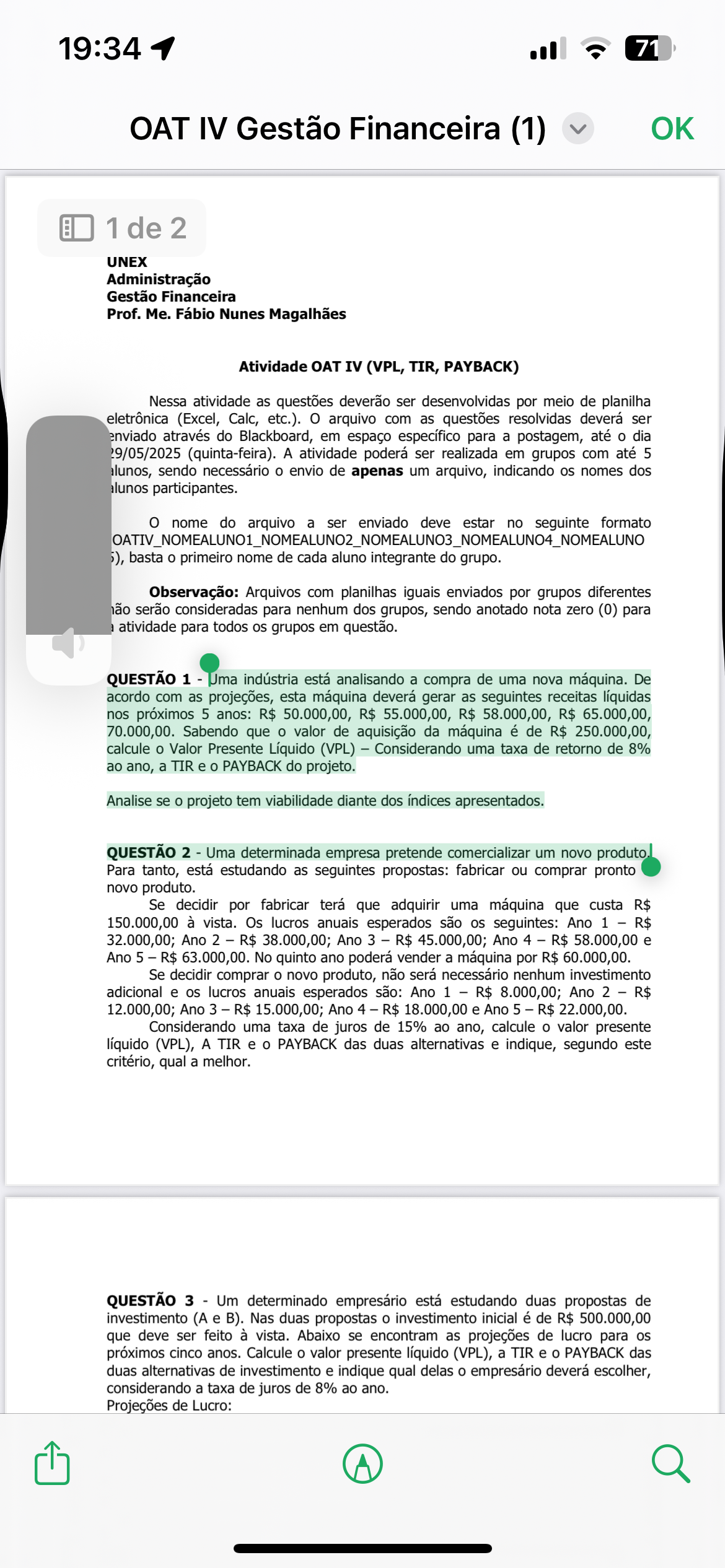19:34 71 OAT IV Gestão Financeira (1) OK 1 de 2 UNEX Administração Gestão Financeira Prof. Me. Fábio Nunes Magalhães Atividade OAT IV (VPL, TIR, PAYBACK) Nessa atividade as questões deverão ser desenvolvidas por meio de planilha eletrônica (Excel, Calc, etc.). o arquivo com as questões resolvidas deverá ser enviado através do Blackboard, em espaço específico para a postagem, até o dia 29/05/2025 (quinta-feira). A atividade poderá ser realizada em grupos com até 5 sendo necessário o envio de apenas um arquivo, indicando os nomes dos participantes. o nome do arquivo a ser enviado deve estar no seguinte formato 5), basta o primeiro nome de cada aluno integrante do grupo. Observação: Arquivos com planilhas iguais enviados por grupos diferentes serão consideradas para nenhum dos grupos, sendo anotado nota zero (0) para atividade para todos os grupos em questão. QUESTÃO 1 - Uma indústria está analisando a compra de uma nova máquina. De acordo com as projeções, esta máquina deverá gerar as seguintes receitas líquidas nos próximos 5 anos: R$ 50.000,00, R$ 55.000,00, R$ 58.000,00, R$ 65.000,00, 70.000,00. Sabendo que o valor de aquisição da máquina é de R$ 250.000,00, calcule o Valor Presente Líquido (VPL) - Considerando uma taxa de retorno de 8% ao ano, a TIR e o PAYBACK do projeto. Analise se o projeto tem viabilidade diante dos índices apresentados. QUESTÃO 2 - Uma determinada empresa pretende comercializar um novo produto Para tanto, está estudando as seguintes propostas: fabricar ou comprar pronto novo produto. Se decidir por fabricar terá que adquirir uma máquina que custa R$ 150.000,00 à vista. Os lucros anuais esperados são os seguintes: Ano 1 - R$ 32.000,00; Ano 2 - - R$ 38.000,00; Ano 3 - R$ 45.000,00; Ano 4 - - R$ 58.000,00 e Ano 5 - R$ 63.000,00. No quinto ano poderá vender a máquina por R$ 60.000,00. Se decidir comprar o novo produto, não será necessário nenhum investimento adicional e os lucros anuais esperados são: Ano 1 - R$ 8.000,00; Ano 2 R$ 12.000,00; Ano 3 R$ 15.000,00; Ano 4 - R$ 18.000,00 e Ano 5 - R$ 22.000,00. Considerando uma taxa de juros de 15% ao ano, calcule o valor presente líquido (VPL), A TIR e o PAYBACK das duas alternativas e indique, segundo este critério, qual a melhor. QUESTÃO 3 - Um determinado empresário está estudando duas propostas de investimento (A e B). Nas duas propostas o investimento inicial é de R$ 500.000,00 que deve ser feito à vista. Abaixo se encontram as projeções de lucro para os próximos cinco anos. Calcule o valor presente líquido (VPL), a TIR e o PAYBACK das duas alternativas de investimento e indique qual delas o empresário deverá escolher, considerando a taxa de juros de 8% ao ano. Projeções de Lucro: