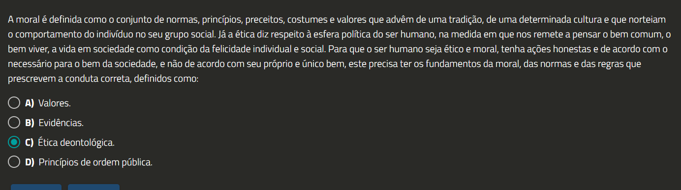 A moral é definida como conjunto de normas, princípios, preceitos, costumes e valores que advêm de uma tradição, de uma determinada cultura e que norteiam comportamento do indivíduo no seu grupo social. Já a ética diz respeito à esfera política do ser humano, na medida em que nos remete a pensar bem comum, bem viver, a vida em sociedade como condição da felicidade individual e social. Para que ser humano seja ético e moral, tenha ações honestas e de acordo com necessário para bem da sociedade, e não de acordo com seu próprio e único bem, este precisa ter os fundamentos da moral, das normas e das regras que prescrevem a conduta correta, definidos como: A) Valores. B) Evidências. C) Ética deontológica. D) Princípios de ordem pública.