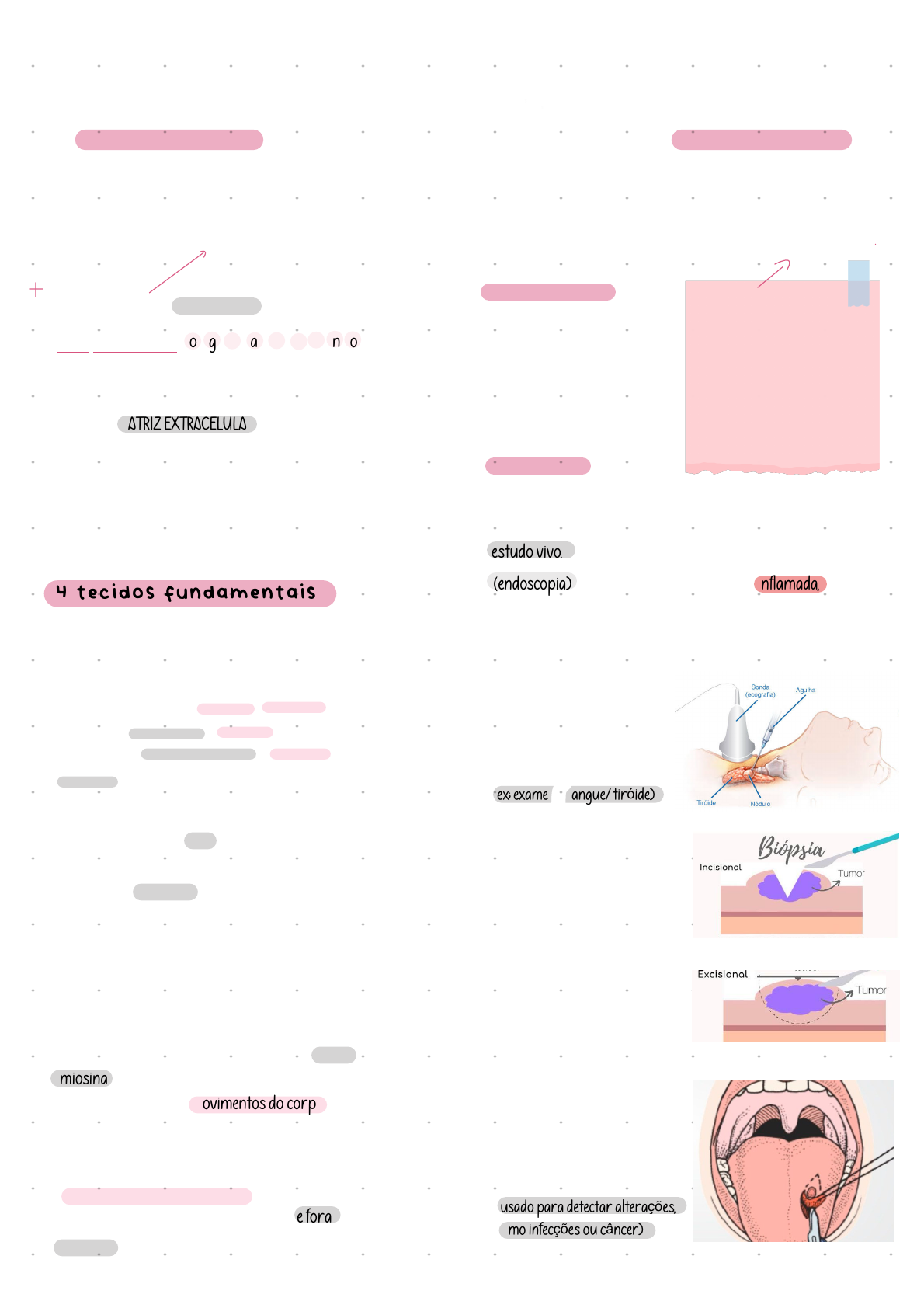 Histologia Macroscópico necropsia Estudo de uma pessoa morta, indentificando a causa. Medico legal Medico cientifico Tecidos Conjunto de células especializadas Matriz extracelular (moléculas). 4 tecidos fundamentais Exemplos de matriz : colágeno e acido hialurônico Tecido Epitelial: capa protetora do corpo, cobre a pele e reveste órgãos, cavidades e vasos sanguíneos. - a função principal é a proteção, absorção de nutrientes ( no intestino), secreção de substâncias ( como suor e saliva) e filtragem (nos rins) Tecido Conjuntivo: - a função principal é unir tecidos, servindo de sustentação e preenchimento para o corpo. - é um tecido orgânico. - é composto por células e matriz extracelular. Tecido Muscular: é um tecido animal que se caracteriza pela capacidade de contração, tambem chamadas de fibras musculares., são alongadas e apresentam grande quantidade de filamentos de proteínas contráteis (como actina e miosina) - é responsavel pelos movimentos do corpo. Tecido Nervoso: (fora da célula) é o principal tecido responsável pela troca rápida de informações dentro do corpo. Sensivel aos estímulos que se origina de fora ou do interior do organismo.. biopsia Exame, através da retirada de um fragmento de tecido vivo,, para se observar no microscópio. estudo vivo. ASPIRATIVA Exame feito por uma agulha de fino calibre, para obter resultados de lesões sólidas ou císticas. (ex; exame de sangue/ tiróide) INCISIVA Tecidos são formados por células que se especializam, mas cada célula tem um ambiente, chamado MATRIZ EXTRACELULAR., preenchendo os espacos vazios, portando nas células não existe espaço vazio, pois é preenchido pela matriz.. A ESPECIALIDADE DO CONJUNTO DE CÉLULAS É A DIFERENCIAÇÃO. Uma parte da lesão é retirada para o estudo anatomopatológico. (uma amostra do tecido) EXCISIVA Toda parte da lesão é retirada,. remoção TOTAL. ex: (verruga, tumor) ESFOLIATIVA Raspar/ esfoliar - Coleta células da superfície de um tecido. ‘’necropsia’’ nekros = cadaver opsis = vista (usado para detectar alterações, como infecções ou câncer) (endoscopia) achar uma regiao vermelha = inflamada, para descobrir a causa é retirada uma pequena parte para analisar no microscópio é um policial,, faz parte do IML (instituto do médico legal) investiga a causa da morte, apenas quando à suspeita, ou sinal de violência. (morte provocada) realiza estudos e ensaios clínicos para melhorar o diagnóstico, tratamento e prevenção de doenças. Fixacao da Amostra Biologica (preservar o tecido) assim que coletar, instantaneamente deve fixar, estabilizando as proteinas e sua ligacoes, preservando a “arquitetura EXISTE DOIS MODOS FÍSICA : baixas temperaturas (nitrogênio liquido) -196° , fazendo com que a celula congele do jeito que ela estava instantaneamente apos a fixacao, acontece a desidratacao (tirar a agua e preservar o tecido) utiliza-se o alcool, ele remove a agua mais entra no lugar dela o material e colocado em uma forma junto com a parafina liquida QUIMICA : formol , alcool , bouin , gendree ) mais utilizado/comum Desidratacao retirada de H2O de concentrações de alcool, ate chegar no alccol absoluto (processo de colocar o alccoo aos poucos ate chegar em 100% de alcool agua e parafina nao se mistura Diafanizacao/clarificacao remover o alcool e substituir por XILOL > PETRÓLEO xilol tem propriedade de clarificar os tecidos DIAFINIZAR Embebicao ou impregnacao substituição do xilol por parafina ocorre em uma estufa 60°C o xilol evapora e a parafina entra no lugar Inclusao envolve a imersão de fragmentos de tecido em parafina líquida, a fim de prepará-los para observação ao microscópio. ◦ Microtomia cortes dos blocos de parafina no aparelho micrótomo cortes muito finos, na espessura de 5 a 7 um 1 um = 1mm/ 1000 Metodo de Coloracao retira-se a parafina Nucleo - DNA ( Acido DesoxirriboNucleico ) Citoplasma - Proteinas ( base ) HEMATOXILINA : ( azul - base ) = ACIDÓFILO EOSINA : ( róseo - acido ) = BASÓFILO nucleo citoplasma acido nao reage com acido, precisa de uma base portanto uma tinta precisa ser base e outra acido Hematoxilina - núcleo Eosina - citoplasma tudo que for ROSA = NUCLEO tudo que for AZUL : CITOPLASMA acidófilo ( gosta de ácido) - CITOPLASMA basófilo ( gosta de base ) - NUCLEO TECIDO EPITELIAL DE REVESTIMENTO especializado em fazer superfícies ( externas e internas ) cavidade oral, pele, falinge, esôfago, uretra, bexiga ◦ é identificado por possuir várias células juntas chamado de CÉLULAS JUSTAPOSTAS ( onde contém atrito, possui mais camadas, tendo mais nucleos LAMINA BASAL limite entre o tecido epitelial e conjuntivo◦ AVASCULAR nao possui vasos sanguíneos, se tivesse os vasos nao impediria das barreiras entrarem ◦ a nutrição ocorre por difusao dos nutrientes, atraves do tecido conjuntivo adjacente ◦ MORFOLOGIA DAS CELULAS as celulas se mantem vivas, pois os vasos saem do tecido conjuntivo, e passam pela lamina basal atraves de difusão ◦ ou colunar para identificar deve- se acompanhar a lamina basal METAPLASTIA reversível, se tirar o estímulo patológico, ele volta a ser como era PARA ACHAR O EPITÉLIO 1° ver o formato do nucleo 2° classificar o numero de camadas UMA unica camada = epitélio simples DUAS ou mais camadas = epitélio estratificado exemplos : epitélio simples colunar / cubico epitélio estratificado colunar / pavimentoso se tiver mais de um formato de nucleo, vai ser considerado o nucleo que estiver na ultima ca,mada ( de baixo p/ cima ) mesmo sendo a celula com menor quantidade se possui camada depois do núcleo ( pele morta ) tem a presença de queratina - se perguntar o orgao do tecido será a pele, pois só na pele encontra-se queratina exemplo : epitélio estratificado pavimentoso queratinizado EXCESSÕES quando as celulas se prendem na lamina basal, encostando nela, e possuem alturas diferentes = PSEUDOESTRATIFICADO se contem cilios, chama -se ciliar, ajuda no