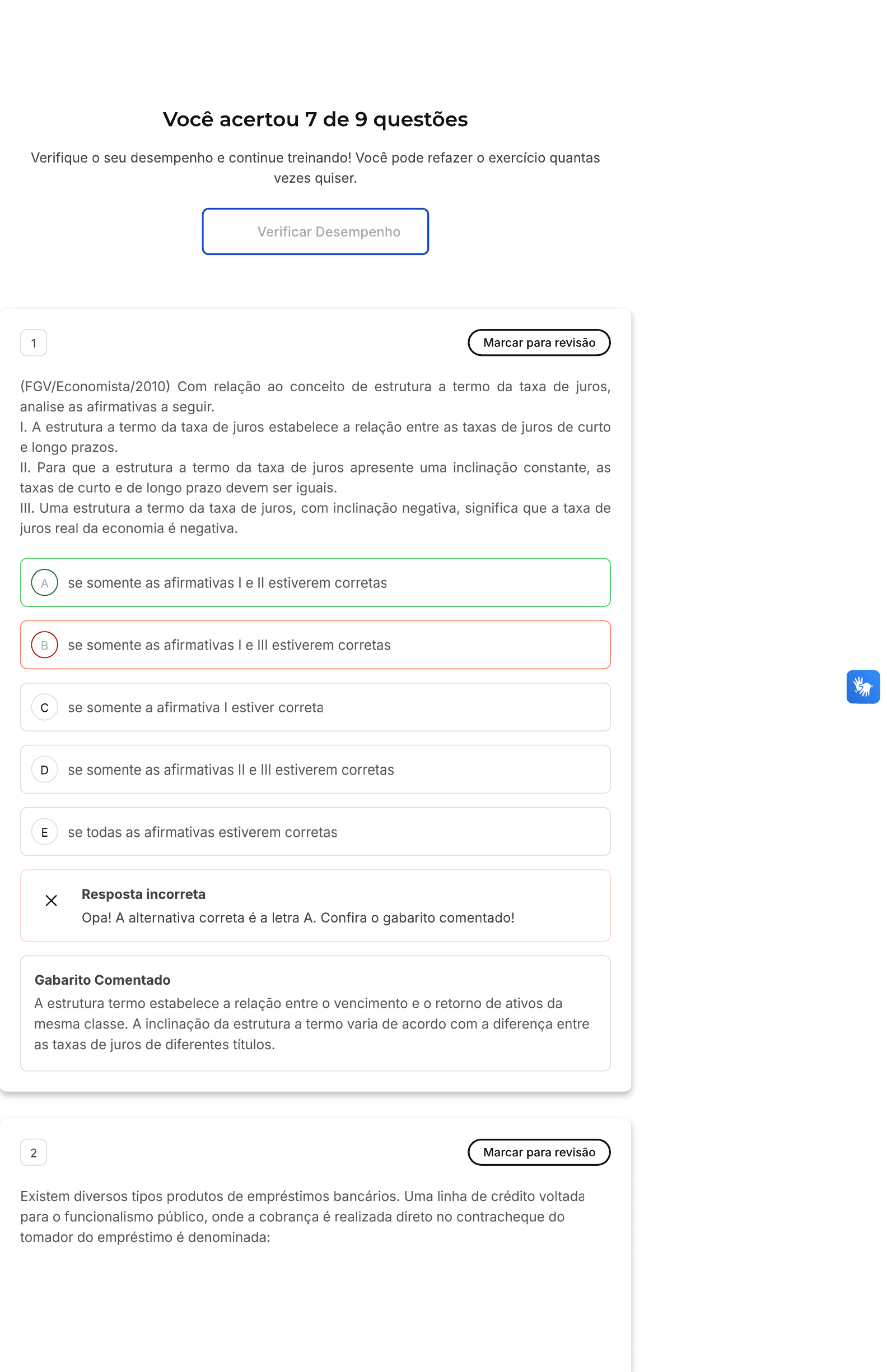 Você acertou 7 de 9 questões Verifique o seu desempenho e continue treinando! Você pode refazer o exercício quantas vezes quiser. Verificar Desempenho 1 Marcar para revisão (FGV/Economista/2010) Com relação ao conceito de estrutura a termo da taxa de juros, analise as afirmativas a seguir. I. A estrutura a termo da taxa de juros estabelece a relação entre as taxas de juros de curto e longo prazos. II. Para que a estrutura a termo da taxa de juros apresente uma inclinação constante, as taxas de curto e de longo prazo devem ser iguais. III. Uma estrutura a termo da taxa de juros, com inclinação negativa, significa que a taxa de juros real da economia é negativa. A se somente as afirmativas e estiverem corretas B se somente as afirmativas e III estiverem corretas C se somente a afirmativa estiver correta D se somente as afirmativas e III estiverem corretas E se todas as afirmativas estiverem corretas X Resposta incorreta Opa! A alternativa correta é a letra A. Confira o gabarito comentado! Gabarito Comentado A estrutura termo estabelece a relação entre o vencimento e o retorno de ativos da mesma classe. A inclinação da estrutura a termo varia de acordo com a diferença entre as taxas de juros de diferentes títulos. 2 Marcar para revisão Existem diversos tipos produtos de empréstimos bancários. Uma linha de crédito voltada para o funcionalismo público, onde a cobrança é realizada direto no contracheque do tomador do empréstimo é denominada:A Empréstimo consignado. B Cheque especial. C Crédito direto ao consumidor. D Financiamento de capital de giro. E Desconto de títulos. Resposta correta Parabéns, você selecionou a alternativa correta. Confira o gabarito comentado! Gabarito Comentado Crédito consignado constitui-se numa linha de crédito destinada a funcionários públicos, com a cobrança sendo realizada diretamente no contracheque do tomador. Nessa modalidade, as taxas cobradas tendem a ser mais baixas devido ao baixo risco de inadimplência. 3 Marcar para revisão que é spread bancário? A É a redução dos limites de crédito ofertados pelos bancos. B É a diferença entra as taxas de câmbio nos mercados oficial e paralelo. É a diferença entre os juros que o banco cobra para emprestar recursos e o que C ele paga para captá-los. D É a diferença entre taxas de curto e longo prazo. E É o valor mínimo de capital exigido pelo Banco Central. Resposta correta Parabéns, você selecionou a alternativa correta. Confira o gabarito comentado! Gabarito Comentado spread bancário é a diferença entre os juros que o banco cobra para emprestar recursos e o que ele paga para captá-los. Essa diferença é uma forma de remuneração do banco pelo serviço de intermediação financeira. spread bancário é um importante indicador da eficiência do sistema financeiro, pois quanto maior o spread, menor a eficiência do sistema. 4 Marcar para revisãomercado financeiro é essencial para a economia brasileira. A importância do mercado financeiro está baseada em: Garantir que haja recursos de poupadores disponíveis para serem demandados A através de instrumentos de financiamento ou empréstimo e assim, possam gerar o crescimento econômico. Garantir que os recursos de deficitários sejam investidos apenas em crescimento B econômico. Garantir que os recursos disponíveis de poupadores sejam utilizados pelos C deficitários para honrar compromissos assumidos e que, apenas após isso, sejam realizados investimentos em crescimento para a economia. Garantir que haja recursos disponíveis para serem utilizados pelos investidores D para melhorarem sua rentabilidade e, consequentemente, aumentarem recursos disponíveis para empréstimos. Garantir que os empréstimos e investimentos captados sejam rentáveis de forma E que as partes interessadas tenham recursos suficientes para garantia do crescimento econômico. Resposta correta você selecionou a alternativa correta. Confira o gabarito comentado! Gabarito Comentado impacto causado pelo mercado financeiro serve para que se garanta que haja recursos disponíveis dos poupadores para que os agentes financeiros possam emprestar e financiar o crescimento econômico. o mercado financeiro é o mecanismo por meio do qual se viabiliza o fluxo de recursos entre os agentes superavitários, ou poupadores, e os agentes deficitários, ou tomadores de recursos. 5 Marcar para revisão A duration foi criada como indicador de finanças empresariais, em 1938, pelo financista Macaulay, mas só difundido na década de 70 e posteriormente aplicado em análises Admita um empréstimo de R$ 50.000,00 pelo prazo de dois anos. A taxa de juro contratada é de 12% ao ano. Para liquidação do empréstimo considerando pagamento do principal ao final de dois anos e juros anualmente, a duration é: A 1,89 ano B 1,47 ano C 1,36 ano D 1,27 ano E 1,12 anoResposta correta Parabéns, você selecionou a alternativa correta. Confira o gabarito comentado! Gabarito Comentado Dado que a taxa de juros é de \(12 \%\), o valor do empréstimo é de R \(\$ 50.000,00\), e o período é de dois anos, vamos calcular: Pagamento de juros no primeiro ano: $$ 50.000 \times 0,12=6.000 $$ Pagamento de juros no segundo ano: $$ 50.000 \times 0,12=6.000 $$ Lista de exercícios Mercados Financeiros T Sair $$ Agora, calculamos o valor presente dos pagamentos de juros e do pagamento do principal: Questão 7 de 9 $$ \begin{gathered} 1 2 3 4 5 P V 1=6000 /(1+0,12)=5.357,14 P V 2=6000 /(1+0,12)^{\wedge} 2=4.777,36 6 7 8 9 P V 2=50000 /(1+0,12)^{\wedge} 2=39.846,91 \text { Duration }=\frac{(5.357,14 \times 1)+(4.777,36 \times 2)+(39.846,91 \times 2)} Corretas (7) Incorretas (2) \end{gathered} Em branco (0) $$ 6 Marcar para revisão O termo em inglês debt, que significa dívida, deu origem ao nome de qual instrumento de dívida negociado no mercado de capitais? A Ações preferenciais. B Ações ordinárias. C Debêntures. D Commercial papers. E Treasury Bonds. Resposta correta Pa