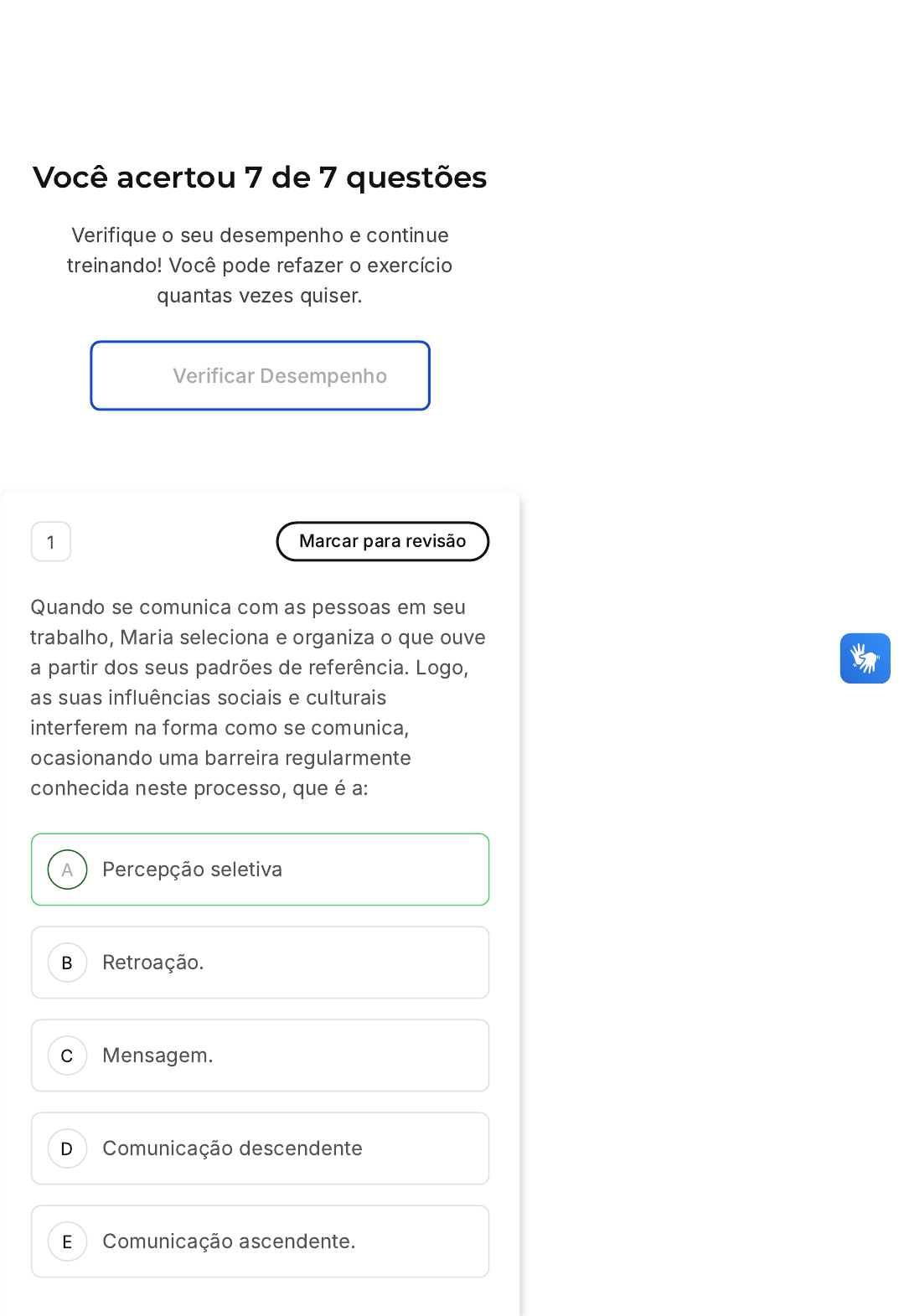 Você acertou 7 de 7 questões Verifique o seu desempenho e continue treinando! Você pode refazer o exercício quantas vezes quiser. Verificar Desempenho A B C D E 1 Marcar para revisão Quando se comunica com as pessoas em seu trabalho, Maria seleciona e organiza o que ouve a partir dos seus padrões de referência. Logo, as suas influências sociais e culturais interferem na forma como se comunica, ocasionando uma barreira regularmente conhecida neste processo, que é a: Percepção seletiva Retroação. Mensagem. Comunicação descendente Comunicação ascendente. Resposta correta Parabéns, você selecionou a alternativa correta. Confira o gabarito comentado! Gabarito Comentado A alternativa correta é a Percepção Seletiva. Este termo se refere à tendência dos receptores de prestar mais atenção nas comunicações que consideram importantes, enquanto aquilo que classificam como desnecessário é ignorado ou "apagado" da memória. Este fenômeno também é conhecido como audição seletiva ou percepção seletiva, pois as pessoas tendem a ouvir apenas o que desejam ou consideram relevante. As influências sociais e culturais de um indivíduo desempenham um papel crucial na determinação do que é considerado importante para ele, influenciando assim a sua percepção seletiva. 2 Marcar para revisão São consideradas diretrizes para um feedback construtivo: I- Reformule a mensagem com suas próprias palavras para que a pessoa perceba que você ouviu e compreendeu o que foi dito; II- Relate a situação usando exemplos genéricos, culpando o outro pelo erro cometido; III- Não fale em seu próprio nome, só reproduza as críticas de outros. A B C D E Apenas o item I. Apenas os itens I e II. Apenas os itens II e III. Apenas os itens I e III. Os itens I, II e III. Resposta correta Parabéns, você selecionou a alternativa correta. Confira o gabarito comentado! Gabarito Comentado A alternativa correta é a que se refere apenas ao item I. Isso porque reformular a mensagem com suas próprias palavras para que a pessoa perceba que você ouviu e compreendeu o que foi dito é uma diretriz importante para um feedback construtivo. Isso demonstra empatia e compreensão, elementos essenciais para um feedback eficaz. Por outro lado, as afirmativas II e III não são consideradas boas práticas para um feedback construtivo. Na afirmativa II, culpar o outro pelo erro cometido usando exemplos genéricos não é uma abordagem construtiva, pois evita a assunção de responsabilidades e pode gerar ressentimentos. Na afirmativa III, reproduzir apenas as críticas de outros, sem falar em seu próprio nome, também não é uma A B prática construtiva, pois pode parecer que você está se esquivando de suas próprias opiniões ou responsabilidades. 3 Marcar para revisão Na organização ALFA Soluções Ltda, o trabalho coletivo e a harmonia necessários para o alcance dos resultados são assuntos constantemente debatidos em reuniões com a direção geral. No entanto, Lourdinha, a telefonista, não concorda e nem adota tal postura em suas relações de trabalho. Ela sempre trata os colegas de forma arrogante e entende que suas opiniões devem prevalecer sobre as opiniões dos demais membros, afinal, ela considera que, por estudar Administração em uma grande universidade, tem mais conhecimento que a maioria. Tal comportamento tem gerado inúmeros conflitos internos e discussões acaloradas com os outros colegas. Devido a esses fatores, recentemente, ela foi encaminhada para um programa de capacitação a fim de que possa melhorar seu comportamento no trabalho. Neste programa, a instrutora pediu-lhe, corretamente, que pratique a escuta ativa, o que significa que Lourdinha deverá sempre falar mais e ouvir menos nas próximas discussões. mantenha as crenças existentes, pois ninguém deve procurar entender uma situação sobre o ponto de vista do outro. C D E reveja sua forma de analisar as coisas, pois o preconceito e o prejulgamento não permitem que as pessoas desenvolvam a capacidade de adaptação e flexibilidade diante de novas situações, impedindo-as de aprender de maneira contínua. fuja das discussões e finja que nada está acontecendo, não há situação pior em um ambiente de trabalho que o conflito, por isso, Lourdinha deverá sempre evitá-lo, em qualquer circunstância. intensifique os conflitos existentes, praticando a escuta ativa e use o poder para tomar decisões quando a situação não se resolver. Resposta correta Parabéns, você selecionou a alternativa correta. Confira o gabarito comentado! Gabarito Comentado A resposta correta é "Reveja sua forma de analisar as coisas, pois o preconceito e o prejulgamento não permitem que as pessoas desenvolvam a capacidade de adaptação e flexibilidade diante de novas situações, impedindo-as de aprender de maneira contínua.". Esta alternativa destaca a importância de Lourdinha rever suas atitudes e preconceitos, que estão gerando conflitos no ambiente de trabalho. O preconceito e o prejulgamento são barreiras para a comunicação efetiva e para o desenvolvimento de uma postura Questão 4 de 7 Corretas (7) Em branco (0) 1 2 3 4 5 6 7 Lista de exercícios Comunicaç… Sair A B C D E adaptativa e flexível diante de novas situações. Ao superar essas barreiras, Lourdinha poderá melhorar suas relações de trabalho e contribuir para um ambiente mais harmonioso e produtivo. 4 Marcar para revisão Muito embora Ana Maria, funcionária da empresa Águas Belas, saiba que diversas barreiras podem dificultar ou distorcer a comunicação eficaz, quando comunica fatos negativos aos seus superiores, ela manipula as informações para que estes a vejam de forma mais favorável. Logo, pode-se dizer corretamente que Ana Maria: pratica a percepção seletiva. utiliza a sensação coletiva. filtra o conteúdo da mensagem. escolhe os canais mais ricos para divulgar as informações. mantém a natureza da informação. Resposta correta Parabéns,