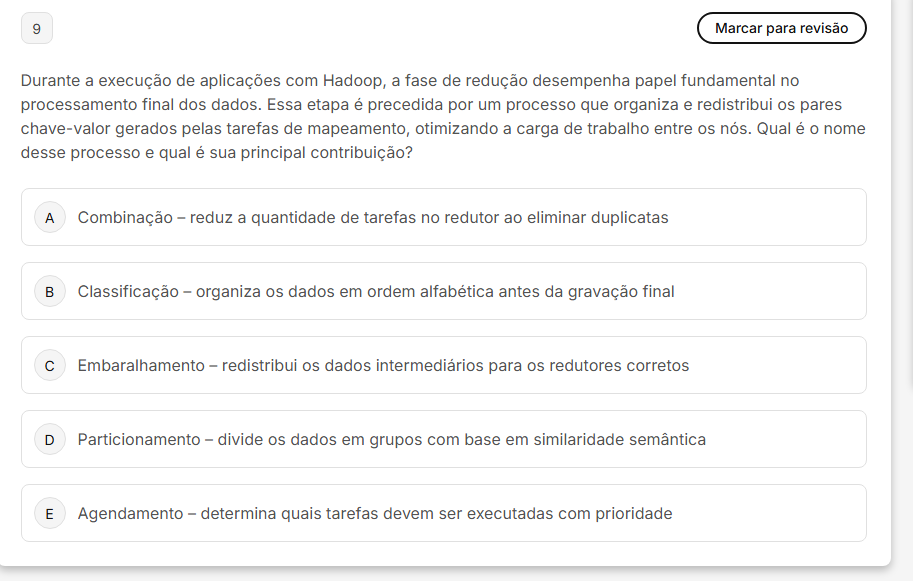 9 Marcar para revisão Durante a execução de aplicações com Hadoop, a fase de redução desempenha papel fundamental no processamento final dos dados. Essa etapa é precedida por um processo que organiza e redistribui os pares chave-valor gerados pelas tarefas de mapeamento, otimizando a carga de trabalho entre os Qual é nome desse processo e qual é sua principal contribuição? A Combinação - reduz a quantidade de tarefas no redutor ao eliminar duplicatas B Classificação - organiza os dados em ordem alfabética antes da gravação final C Embaralhamento - redistribui os dados intermediários para os redutores corretos D Particionamento - divide os dados em grupos com base em similaridade semântica E Agendamento - determina quais tarefas devem ser executadas com prioridade