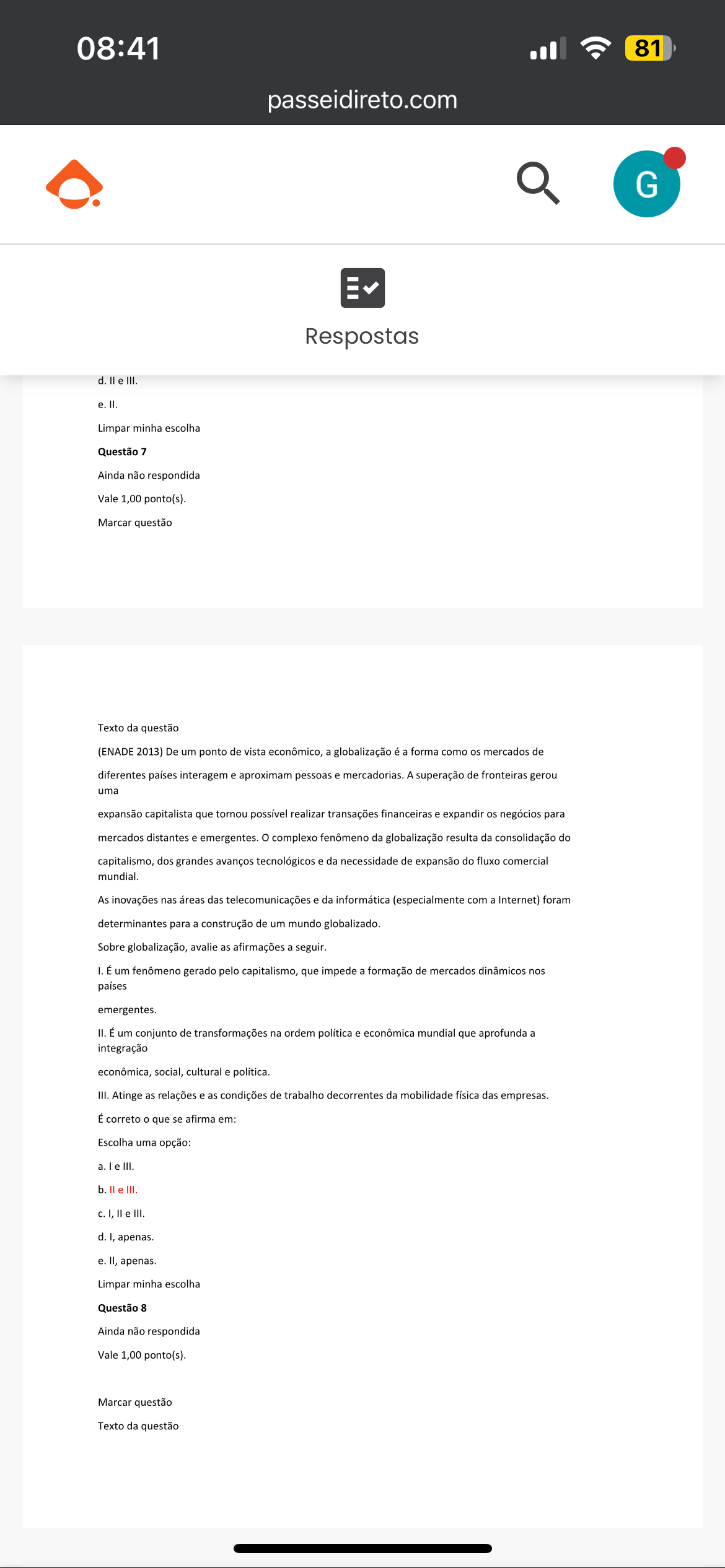 08:41 81 passeidireto.com G Respostas d. III. II. Limpar minha escolha Questão 7 Ainda não respondida Vale 1,00 ponto(s). Marcar questão Texto da questão (ENADE 2013) De um ponto de vista econômico, a globalização é a forma como os mercados de diferentes países interagem e aproximam pessoas e mercadorias. A superação de fronteiras gerou uma expansão capitalista que tornou possível realizar transações financeiras e expandir os negócios para mercados distantes e emergentes. o complexo fenômeno da globalização resulta da consolidação do capitalismo, dos grandes avanços tecnológicos e da necessidade de expansão do fluxo comercial mundial. As inovações nas áreas das telecomunicações e da informática (especialmente com a Internet) foram determinantes para a construção de um mundo globalizado. Sobre globalização, avalie as afirmações a seguir. I. É um fenômeno gerado pelo capitalismo, que impede a formação de mercados dinâmicos nos países emergentes. II. É um conjunto de transformações na ordem política e econômica mundial que aprofunda a integração econômica, social, cultural e política. III. Atinge as relações e as condições de trabalho decorrentes da mobilidade física das empresas. É correto o que se afirma em: Escolha uma opção: a. III. b. III. III. apenas. apenas. Limpar minha escolha Questão 8 Ainda não respondida Vale 1,00 ponto(s). Marcar questão Texto da questão