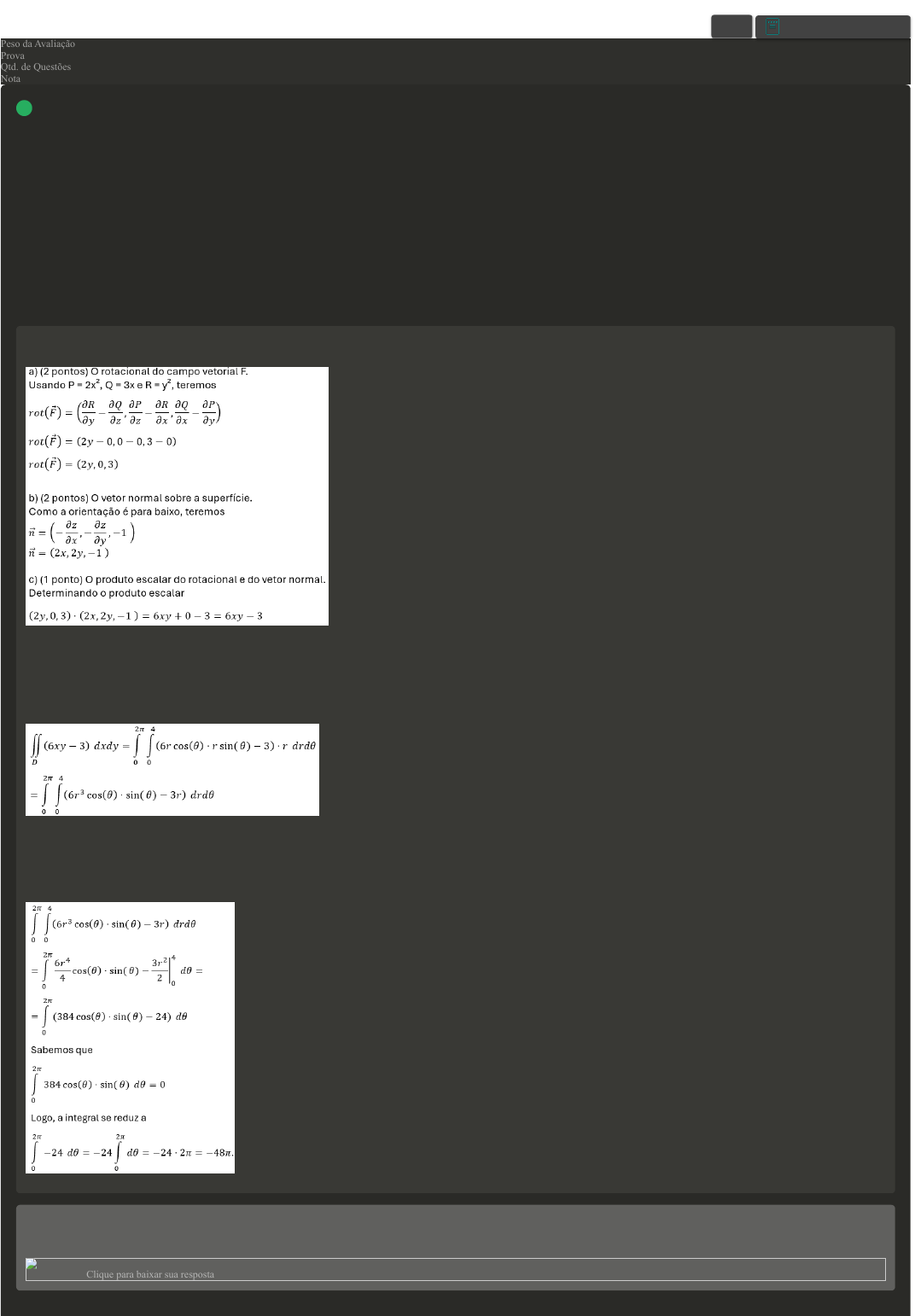 Prova Impressa GABARITO | Avaliação Final (Discursiva) - Individual (Cod.:1024164) Peso da Avaliação 2,00 Prova 98451527 Qtd. de Questões 2 Nota 7,00 O Teorema de Stokes pode ser visto como uma extensão do Teorema de Green, em que a principal diferença reside no número de variáveis envolvidas: enquanto o Teorema de Green se aplica a campos vetoriais bidimensionais, o Teorema de Stokes aborda campos vetoriais tridimensionais, enfatizando a relação entre uma integral de linha ao longo de uma curva fechada e uma integral de superfície sobre a superfície delimitada por essa curva. Dessa forma, para a integral de linha do campo vetorial F(x, y, z) = (2x², 3x, y²) onde C é o paraboloide z = 16 - x² - y² e o plano z = 0 orientado para baixo, determine: a) (2 pontos) O rotacional do campo vetorial F. b) (2 pontos) O vetor normal sobre a superfície. c) (1 ponto) O produto escalar do rotacional e do vetor normal. d) (2 pontos) A montagem da integral dupla usando o resultado do item C e a mudança para coordenadas polares da superfície. e) (3 pontos) A resolução da integral pelo método de Stokes. Observação: apresentar todo o raciocínio e desenvolvimento na resolução da questão. Resposta esperada d) (2 pontos) A montagem da integral dupla usando o resultado do item C e a mudança para coordenadas polares da superfície. Usando o resultado do item C e o fato do bordo da superfície ser uma circunferência de raio igual a 4, podemos aplicar a mudança para coordenadas polares com x = rcos(θ) e y = rsin(θ). Logo, a integral fica assim definida: e) (3 pontos) A resolução da integral pelo método de Stokes. Como todo o desenvolvimento feito até o item D já estrutura a resolução da integral de linha pelo método de Stokes, devemos apenas resolver a integral dupla. Minha resposta Resposta em anexo. resposta_1.pdfClique para baixar sua resposta VOLTAR A+ Alterar modo de visualização 1 09/05/2025, 08:14 Avaliação Final (Discursiva) - Individual about:blank 1/3 Retorno da correção Prezado acadêmico, sua resposta contemplou poucos elementos da questão com base nos materiais disponibilizados. Poderia ter aprofundado mais os conteúdos fundamentais da disciplina, com base em seus estudos. Para determinar o centro de massa de uma região bidimensional com densidade variável, utilizamos os momentos Mx e My. Esses momentos são calculados separadamente e são dados por: Em que δ(x, y) é a função densidade da massa e R é a região de integração. A massa total M é então calculada como: O centro de massa (x, y) é então obtido por: Esses cálculos permitem encontrar a posição média da massa na região. Fonte: SILVA, F. J.; GARCIA, M. P. Introdução ao Cálculo de Várias Variáveis. 2. ed. São Paulo: Editora Blucher, 2015. Considere então uma chapa R, definida no plano XY, pela imagem a seguir: Sabendo que a sua função densidade é descrita por δ(x, y) = 2xy², determine: a) (3 pontos) A massa da chapa. b) (3 pontos) O momento em x. c) (3 pontos) O momento em y. d) (1 ponto) As coordenadas x e y para o centro de massa. Observação: lembre-se de apresentar todo o desenvolvimento e simplificar as frações. Resposta esperada 2 09/05/2025, 08:14 Avaliação Final (Discursiva) - Individual about:blank 2/3 Minha resposta Resposta em anexo resposta_2.pdfClique para baixar sua resposta Retorno da correção Prezado acadêmico, sua resposta contemplou poucos elementos da questão com base nos materiais disponibilizados. Poderia ter aprofundado mais os conteúdos fundamentais da disciplina, com base em seus estudos. Imprimir 09/05/2025, 08:14 Avaliação Final (Discursiva) - Individual about:blank 3/3