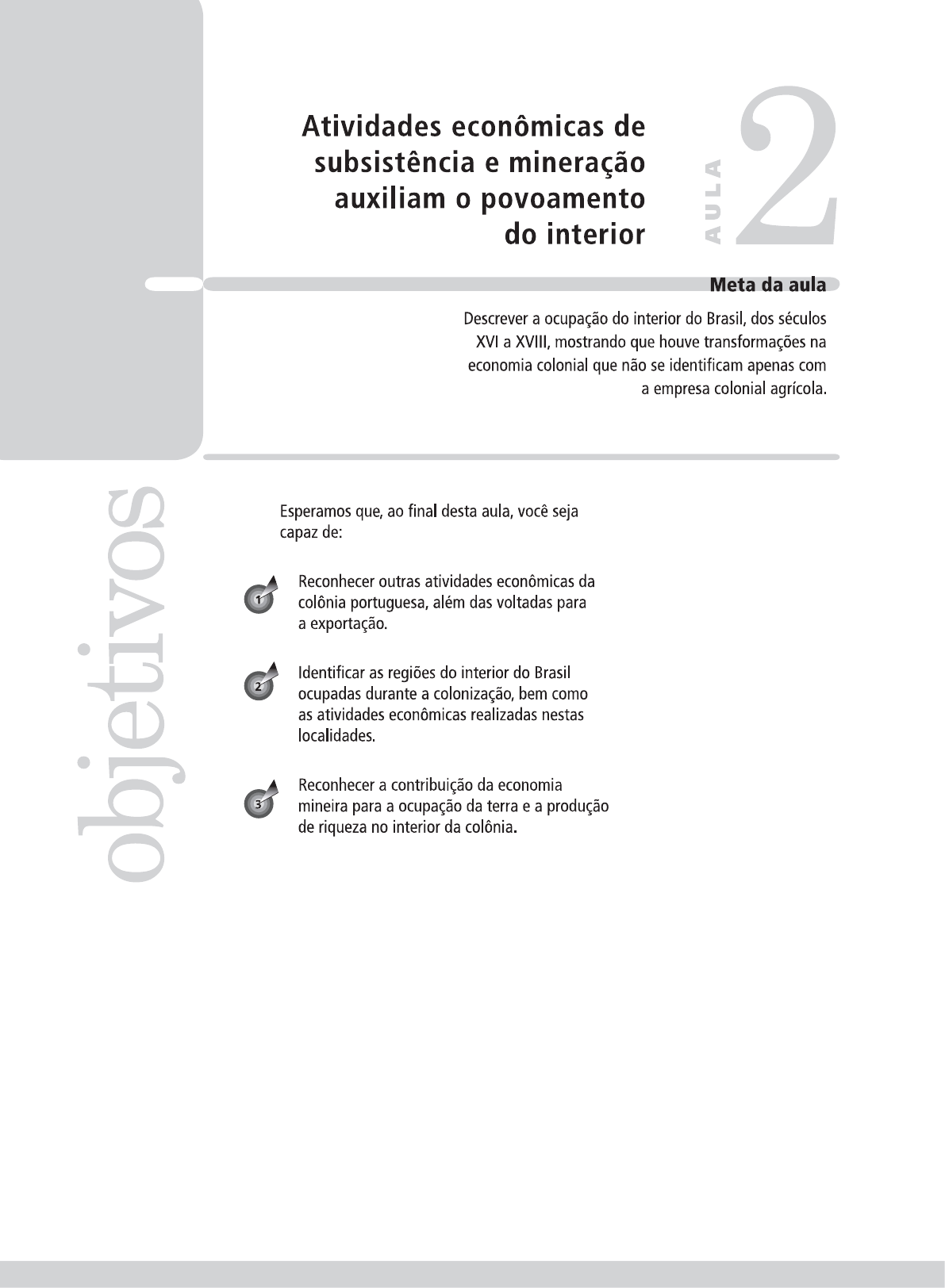 Atividades econômicas de subsistência e mineração auxiliam o povoamento 2 do interior A Meta da aula Descrever a ocupação do interior do Brasil, dos séculos XVI a XVIII, mostrando que houve transformações na economia colonial que não se identificam apenas com a empresa colonial agrícola. Esperamos que, ao final desta aula, você seja capaz de: Reconhecer outras atividades econômicas da 1 colônia portuguesa, além das voltadas para a exportação. Identificar as regiões do interior do Brasil 2 ocupadas durante a colonização, bem como as atividades econômicas realizadas nestas Reconhecer a contribuição da economia 3 mineira para a ocupação da terra e a produção de riqueza no interior da colônia.Formação Econômica do Brasil Atividades econômicas de subsistência e mineração auxiliam o povoamento do interior INTRODUÇÃO Você vai aprofundar ainda mais seu conhecimento sobre a dinâmica da colonização para a coroa portuguesa, situando-a no contexto da expansão mercantil proporcionada pelas grandes navegações, nesta segunda aula, você verá que, a partir do século XVII, o interior da colônia foi ocupado pelos colonos que não exploraram a monocultura para exportação, mas atividades destinadas à própria subsistência ou ao mercado interno. Sugerimos, para complemento de sua leitura, a introdução do trabalho A Lei de Terras de 1850, de Carlos Ignacio Pinto, estudante de História da Universidade de São Paulo (USP), no Carlos Ignacio faz um histórico da ocupação portuguesa no Brasil, dos séculos XVI a XVIII. Vale a pena dar uma olhada, para relembrar o conteúdo da Aula 1. A Lei de Terras de 1850 Carlos Ignacio Pinto carlos@klepsidra.net Segundo Ano História/USP lei1850.doc - 60KB Todas as terras produtivas estão tomadas em um país que é quase deserto (Relatório de Gonçalves Chaves do ano de 1822) Introdução primeiro critério de distribuição do solo da colônia portuguesa na América foi o regime de concessão de sesmarias. Este ordenamento jurídico do território foi, antes de mais nada, uma transposição da norma reguladora do processo de distribuição de terras em Portugal para os solos coloniais. Sob este ponto, é preciso ressaltar que o interesse primordial do processo de colonização portuguesa estava aliado à extensiva exploração do território, com o intuito de campear recursos minerais, principalmente o ouro. Em um primeiro momento, esse propósito da coroa foi completamente frustrado, pois durante todo o século XVI não houve a ocorrência de descoberta de metais preciosos nos solos coloniais americanos de possessão portuguesa. Desde o princípio, a empresa colonial percebeu que a colônia poderia produzir outros tipos de riquezas que não a exploração mineral. Data do ano de 1557 a instalação do primeiro engenho de produção de açúcar no Brasil; os portugueses, que dominavam plenamente a técnica 30 CEDERJde plantio da cana e fabrico do açúcar, devido às suas possessões nas 2 ilhas do Atlântico, introduziram e incentivaram a produção da cana, que possuía grande valor comercial. Na colônia portuguesa, os séculos XVI e XVII marcaram que a professora Vera Lúcia Amaral Ferlini denomina de civilização do uma economia baseada plenamente no cultivo da cana-de- açúcar e no trabalho artesanal de produção do próprio açúcar por meio dos engenhos. Nesse período, o incentivo agrícola foi dado à produção em larga escala para abastecer mercado europeu. Não havia o interesse de construir na colônia uma produção agrícola de pequeno porte e caráter diversificado, pois elemento norteador das políticas européias era o mercado europeu. Assim, a colonização do século XVI foi fiel ao seu sentido original de "colonização de caráter absolutamente sem incentivo à pequena propriedade. A partir do século XVIII, ocorre uma mudança nessa política econômica, com um enorme crescimento da colônia: junto a um grande ciclo migratório, verificou-se uma ampliação da economia devido, principalmente, à descoberta das Minas Gerais. O ciclo do ouro foi capaz de dinamizar novos setores da economia, como o de produção de alimentos e do tráfico interno de mão-de-obra. A reivindicação pela terra tornou-se mais difusa, e a política de doação por meio de sesmarias fazia-se insuficiente às novas necessidades sociais A confusa situação de ocupação de território ditada pela debilidade da Lei de Sesmarias aumentou ainda mais no final do século XVIII, quando ocorreu a decadência da mineração e houve que alguns autores denominaram como um renascimento da atividade agrícola. Nesse contexto, vamos incluir também a mineração, importante para a ocupação do interior do país, além de ter sido uma atividade de grande relevância para gerar excedentes - apropriados por Portugal. Segundo Roberto Simonsen (apud SILVA, 1990), os instrumentos econômicos que serviram como base para a expansão para interior foram a busca por metais preciosos e especiarias, a caça aos indígenas - para suprir a falta de mão-de-obra africana - e a criação de gado Nesta aula, analisaremos como cada uma dessas estratégias contribuiu para povoamento do interior da colônia. CEDERJ 31Formação Econômica do Brasil Atividades econômicas de subsistência e mineração auxiliam o povoamento do interior BUSCA POR METAIS PRECIOSOS E APRESAMENTO DE ÍNDIOS: os BANDEIRANTES AMPLIARAM os DOMÍNIOS PORTUGUESES NA AMÉRICA Antes de falarmos de expansão territorial, vale a pena retomar alguns tópicos vistos na Aula 1. Um deles é Tratado de Tordesilhas que, em 1494, determinou que recém-descoberto continente americano fosse dividido entre Portugal e Espanha. Segundo Dias (1990, p. 25), Constituíam uma espécie de expedição armada que Conforme a cláusula fundamental do diploma (o Tratado de desbravava os sertões a fim de escravizar Tordesilhas), as duas monarquias estabeleciam uma linha de indígenas ou descobrir dema