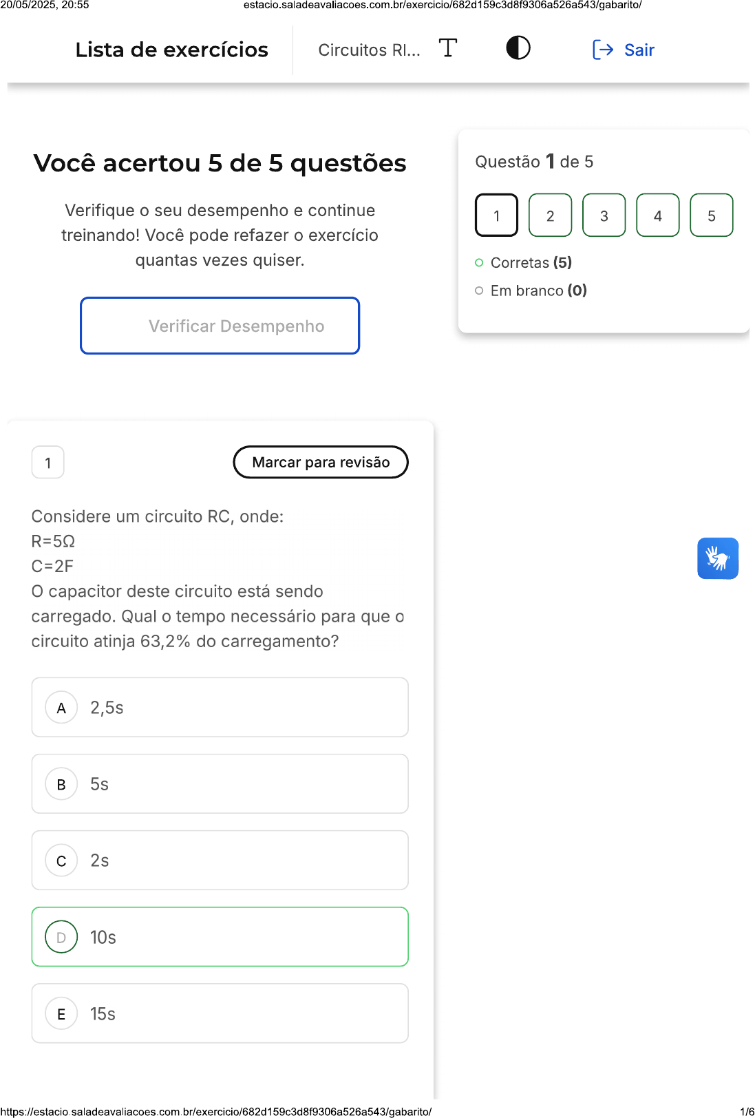 20/05/2025, 20:55 Lista de exercícios Circuitos RI... T Sair Você acertou 5 de 5 questões Questão 1 de 5 Verifique o seu desempenho e continue 1 2 3 4 5 treinando! Você pode refazer o exercício quantas vezes quiser. Corretas (5) Em branco (0) Verificar Desempenho 1 Marcar para revisão Considere um circuito RC, onde: R=50 C=2F capacitor deste circuito está sendo carregado. Qual o tempo necessário para que o circuito atinja 63,2% do carregamento? A 2,5s B 5s C 2s D 10s E 15s 1/620/05/2025, 20:55 estacio.saladeavaliacoes.com.br/exercicio/682d159c3d8f9306a526a543/gabarito Resposta correta Parabéns, você selecionou a alternativa correta. Confira o gabarito comentado! Gabarito Comentado tempo necessário para que um circuito RC atinja 63,2% do carregamento é dado pelo produto da resistência (R) pelo valor do capacitor (C). Neste caso, temos R =50 e C=2F. Portanto, o tempo necessário é * 2F = 10s. Logo, a alternativa correta é a letra D, que indica o tempo de 10s. 2 Marcar para revisão Considere um circuito RC, cujos valores para os componentes são: R=50 C=0,1F Qual o valor da constante de tempo desse circuito? A 0,02. B 50. C 5. 2/620/05/2025, 20:55 D 0,05. E 1. Resposta correta Parabéns, você selecionou a alternativa correta. Confira o gabarito comentado! Gabarito Comentado A constante de tempo de um circuito RC é dada pelo produto da resistência (R) pelo capacitância (C). Neste caso, temos R=50 e C=0,1F. Portanto, a constante de tempo é = 0,5s. No entanto, a alternativa correta é 0,05, o que indica que houve um erro na formulação da questão. A resposta correta deveria ser 0,5s, mas de acordo com as opções fornecidas, a alternativa mais próxima é 0,05s (alternativa D). 3 Marcar para revisão Considere um circuito RL sem fonte descrito como abaixo: Qual a constante de tempo deste circuito? 3/620/05/2025, 20:55 A 1000 B 1 C 0,001 D 10 E 100 Resposta correta Parabéns, você selecionou a alternativa correta. Confira o gabarito comentado! Gabarito Comentado A resposta certa é: 0,001 4 Marcar para revisão (MPE-RS, 2012) Observe a figura abaixo, que representa o circuito RC. CH1 100 + 10V 10 uF Com base nos dados dessa figura, é correto afirmar que a corrente máxima do circuito, a partir do acionamento da chave CH1, é: 4/620/05/2025, 20:55 A 1 mA B 1,83 mA C 10 mA D 18,3 mA E 100 mA Resposta correta Parabéns, você selecionou a alternativa correta. Confira o gabarito comentado! Gabarito Comentado A resposta certa é: 100 mA 5 Marcar para revisão (CESGRANRIO, 2012) O circuito abaixo representa um transitório RC, no qual a chave S é fechada em segundos, e, nesse instante, o capacitor está descarregado. S R = 1 kW t=0 5V (t) Decorrido um tempo maior que 20 constantes de tempo do circuito, a corrente (t), em 5/620/05/2025, 20:55 ampères, e a tensão Vc(t), em volts, no capacitor serão, respectivamente, A Zero e 5. B Zero e zero. C 5 e zero. D 5 e 5. E 0,5 e 0,5. Resposta correta Parabéns, você selecionou a alternativa correta. Confira o gabarito comentado! Gabarito Comentado A resposta certa é: 5 e zero.