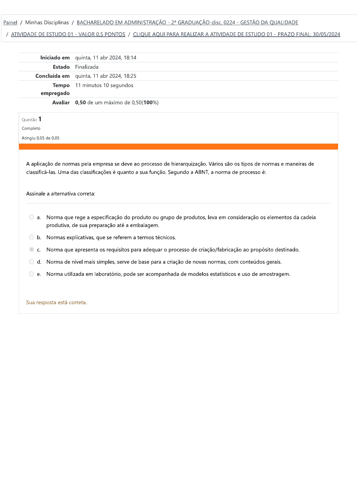 Painel / Minhas Disciplinas / BACHARELADO EM ADMINISTRAÇÃO GRADUAÇÃO-disc 0224 GESTÃO DA QUALIDADE / ATIVIDADE DE ESTUDO 01 - VALOR 0,5 PONTOS / CLIQUE AQUI PARA REALIZAR A ATIVIDADE DE ESTUDO 01 PRAZO FINAL: 30/05/2024 Iniciado em quinta, 11 abr 2024, 18:14 Estado Finalizada Concluída em quinta, 11 abr 2024, 18:25 Tempo 11 minutos 10 segundos empregado Avaliar 0,50 de um máximo de 0,50(100%) Questão 1 Completo Atingiu 0,05 de 0,05 A aplicação de normas pela empresa se deve ao processo de hierarquização. Vários são os tipos de normas e maneiras de classificá-las. Uma das classificações é quanto a sua função. Segundo a ABNT, a norma de processo é: Assinale a alternativa correta: a. Norma que rege a especificação do produto ou grupo de produtos, leva em consideração os elementos da cadeia produtiva, de sua preparação até a embalagem. b. Normas explicativas, que se referem a termos técnicos. C. Norma que apresenta os requisitos para adequar o processo de criação/fabricação ao propósito destinado. d. Norma de nível mais simples, serve de base para a criação de novas normas, com conteúdos gerais. e. Norma utilizada em laboratório, pode ser acompanhada de modelos estatísticos e uso de amostragem. Sua resposta está correta.Questão 2 Completo Atingiu 0,05 de 0,05 (ADAPTADO, PG-DF 2010) A Associação Brasileira de Normas Técnicas (ABNT) é o Fórum Nacional de Normalização. As Normas Brasileiras (NBR), cujo conteúdo é de responsabilidade dos Comitês Brasileiros (ABNT/CB) e dos Organismos de Normalização Setorial (ABNT/ONS), são elaboradas por Comissões de Estudo (CE), formadas por representantes dos setores envolvidos, delas fazendo parte: produtores, consumidores e neutros (universidades, laboratórios e outros). São vários os tipos de normas e uma das classificações é quanto a sua função. Segundo a ABNT, a norma básica é: Assinale a alternativa correta: a. Norma de nível básico e referem-se à execução de serviços. b. Norma de nível mais simples, serve de base para a criação de novas normas, com conteúdos gerais C. Normas explicativas de nível mais complexo e referem-se a termos técnicos. d. Norma de nível mais complexo, serve de base para a criação de novas normas, com conteúdos gerais. e. Normas explicativas de nível mais simples e referem-se a termos técnicos. Sua resposta está correta. Questão 3 Completo Atingiu 0,05 de 0,05 Cada organização, de acordo com sua política, seus objetivos e suas metas, define normas e padrões para o desenvolvimento de seus negócios. Essas normas se encontram em qual parte da Pirâmide? Assinale a alternativa correta: a. No centro da pirâmide. b. No topo da pirâmide C. Fora da pirâmide hierárquica. d. Acima da base da pirâmide. e. Na base da pirâmide. Sua resposta está correta.Questão 4 Completo Atingiu 0,05 de 0,05 Os impactos da normalização são notórios e podem ser caracterizados segundo a ótica da economia, da produção e do consumo. Uma empresa que pretende ampliar suas atividades, utiliza a normalização como fator de crescimento, pois as normas certificam que os produtos possuem os requisitos mínimos exigidos pelos consumidores. Pode-se afirmar que são impactos na economia: a. Equilíbrio entre oferta e procura juntamente com uma produção regular e de qualidade. b. Equilíbrio entre oferta e procura sem a necessidade de manter uma produção regular. C. Equilíbrio entre oferta e procura garantindo uma produção regular e sem a necessidade de se preocupar com a qualidade. d. Oferta maior que a procura, pois dessa maneira garante uma produção regular. e. Procura maior que a oferta para manter os preços mais elevados para consumidor. Sua resposta está correta. Questão 5 Completo Atingiu 0,05 de 0,05 Utilizamos e ouvimos diariamente a palavra norma, onde sempre associamos como uma regra, uma imposição feita a nós ou à empresa. Porém quando se trata de certificação, o conceito é diferente. Sendo assim, o termo "norma técnica" é utilizado em relação a: Assinale a alternativa correta: a. Publicações que incluem padrões, códigos de prática, especificações, recomendações, métodos de testes, nomenclaturas, entre outros. b. Documento que reflete a obrigatoriedade dos parâmetros para a consolidação de uma tecnologia. C. Descrição das características de um equipamento ou de um programa permitindo seu funcionamento. d. Projetos para a execução de cálculos, obras, serviços ou instalações. e. Normas particulares elaboradas visando o uso individual. Sua resposta está correta.Questão 6 Completo Atingiu 0,05 de 0,05 Os desperdícios assumem diferentes formas, porém, mencionar e quantificar desperdícios não é tarefa fácil durante o processamento de um produto. São os principais pontos de desperdícios em uma empresa: Assinale a alternativa correta. a. Matéria prima, salários e prevenção. b. Revisão de tempo de espera e transporte. C. Auditorias, matéria prima, prevenção. d. Matéria prima, tempo de espera e transporte. e. Auditorias, inspeções e logística. Sua resposta está correta. Questão 7 Completo Atingiu 0,05 de 0,05 A cada ano, observa-se que as organizações estão cada vez mais preocupadas na satisfação do seu cliente e busca vantagens competitivas por um diferencial no mercado. As empresas com certificação oferecem ao cliente, padrões de qualidade e segurança diferenciados. Sendo assim, a normalização tem impacto indireto sobre a economia, a produção e o consumo. Baseado nessas considerações, pode-se afirmar que os impactos no consumo são sentidos com: Assinale a alternativa correta. a. Preço justo com garantia de qualidade. b. Preço justo, no entanto, com pouca ou nenhuma garantia da qualidade. C. Preço acima do mercado sem a garantia da qualidade. d. Preço mais alto que o mercado, com produtos de qualidade, mas sem garantia. e. Qualidade e preços de mercado não importam. consumo a
