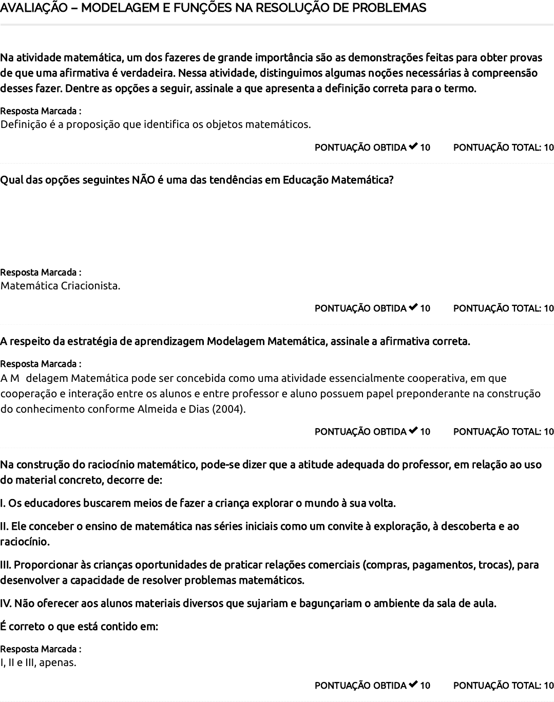 AVALIAÇÃO – MODELAGEM E FUNÇÕES NA RESOLUÇÃO DE PROBLEMAS PONTUAÇÃO TOTAL: 10PONTUAÇÃO OBTIDA 10 Na atividade matemática, um dos fazeres de grande importância são as demonstrações feitas para obter provas de que uma afirmativa é verdadeira. Nessa atividade, distinguimos algumas noções necessárias à compreensão desses fazer. Dentre as opções a seguir, assinale a que apresenta a definição correta para o termo. Resposta Marcada : Definição é a proposição que identifica os objetos matemáticos. PONTUAÇÃO TOTAL: 10PONTUAÇÃO OBTIDA 10 Qual das opções seguintes NÃO é uma das tendências em Educação Matemática? Resposta Marcada : Matemática Criacionista. PONTUAÇÃO TOTAL: 10PONTUAÇÃO OBTIDA 10 A respeito da estratégia de aprendizagem Modelagem Matemática, assinale a afirmativa correta. Resposta Marcada : A Modelagem Matemática pode ser concebida como uma atividade essencialmente cooperativa, em que cooperação e interação entre os alunos e entre professor e aluno possuem papel preponderante na construção do conhecimento conforme Almeida e Dias (2004). PONTUAÇÃO TOTAL: 10PONTUAÇÃO OBTIDA 10 Na construção do raciocínio matemático, pode-se dizer que a atitude adequada do professor, em relação ao uso do material concreto, decorre de: I. Os educadores buscarem meios de fazer a criança explorar o mundo à sua volta. II. Ele conceber o ensino de matemática nas séries iniciais como um convite à exploração, à descoberta e ao raciocínio. III. Proporcionar às crianças oportunidades de praticar relações comerciais (compras, pagamentos, trocas), para desenvolver a capacidade de resolver problemas matemáticos. IV. Não oferecer aos alunos materiais diversos que sujariam e bagunçariam o ambiente da sala de aula. É correto o que está contido em: Resposta Marcada : I, II e III, apenas. PONTUAÇÃO TOTAL: 10PONTUAÇÃO OBTIDA 10 Sobre a utilidade do conhecimento matemático no cotidiano, analise as assertivas abaixo. I. As grandezas e as medidas estão presentes em quase todas as atividades realizadas pela sociedade, dessa forma, desempenham papel importante no currículo. II. Só é possível trabalhar com situações do cotidiano depois de os conhecimentos matemáticos envolvidos nessas situações terem sido amplamente estudados pelos alunos. III. Embora as situações do cotidiano sejam fundamentais para conferir significados a muitos conteúdos a serem estudados, é importante considerar que esses significados podem ser explorados com as questões internas da própria Matemática. É correto o que está contido em: Resposta Marcada : I e III, apenas. PONTUAÇÃO TOTAL: 10PONTUAÇÃO OBTIDA 10 Pode-se dizer que a modelagem matemática é uma interação entre a realidade e a matemática que permite expressar uma situação real através de um modelo matemático. Ou seja, modelagem matemática consiste na arte (ou tentativa) de descrever matematicamente um fenômeno e, para tanto, são necessários alguns procedimentos. A respeito desses procedimentos, não está entre eles: Resposta Marcada : Publicação do modelo. PONTUAÇÃO TOTAL: 10PONTUAÇÃO OBTIDA 10 Quando o Professor de matemática elabora suas aulas voltadas para as soluções de problemas NÃO está correto: Resposta Marcada : Usar palavras chaves para determinar as operações a utilizar. PONTUAÇÃO TOTAL: 10PONTUAÇÃO OBTIDA 0 Considere as afirmativas abaixo: Afirmativa A: a situação-problema é o ponto de partida da atividade matemática. Afirmativa B: o problema é um exercício, em que o aluno aplica uma fórmula ou um processo operatório. Afirmativa C: a resolução de problemas é uma atividade a ser desenvolvida como aplicação de aprendizagens realizadas. De acordo com os Parâmetros Curriculares Nacionais do Ensino Fundamental, ao tratar da resolução de problemas no processo de ensino e aprendizagem de matemática, estariam corretas: Resposta Marcada : Todas as três afirmativas. 90 / 100 PONTUAÇÃO TOTAL: 10PONTUAÇÃO OBTIDA 10 “Resolução de Problemas” é uma alternativa para o ensino de Matemática, que vem sendo discutida e implementada ao longo dos últimos anos. Dentre as alternativas, assinale a que não traduz corretamente as idéias veiculadas sobre essa questão. Resposta Marcada : A metodologia de “Resolução de Problemas” pressupõe que se considere que o mais importante não é a atividade matemática em si mesma, mas sim os resultados, definições, propriedades e demonstrações. PONTUAÇÃO TOTAL: 10PONTUAÇÃO OBTIDA 10 A Resolução de Problemas é uma habilitação prática como, digamos, o é a natação. Adquirimos qualquer habilitação por imitação ou prática”. Diante dos conhecimentos sobre a temática, assinale a afirmativa correta. Resposta Marcada : Na resolução de problemas, o aluno é protagonista em seu processo de aprendizagem, enquanto o professor o estimula a encontrar a solução para os problemas desafiadores, ou seja, há uma intrínseca relação com o fazer matemático, ao criar hipóteses, fazer conjecturas, transformando-se no próprio investigador. Total