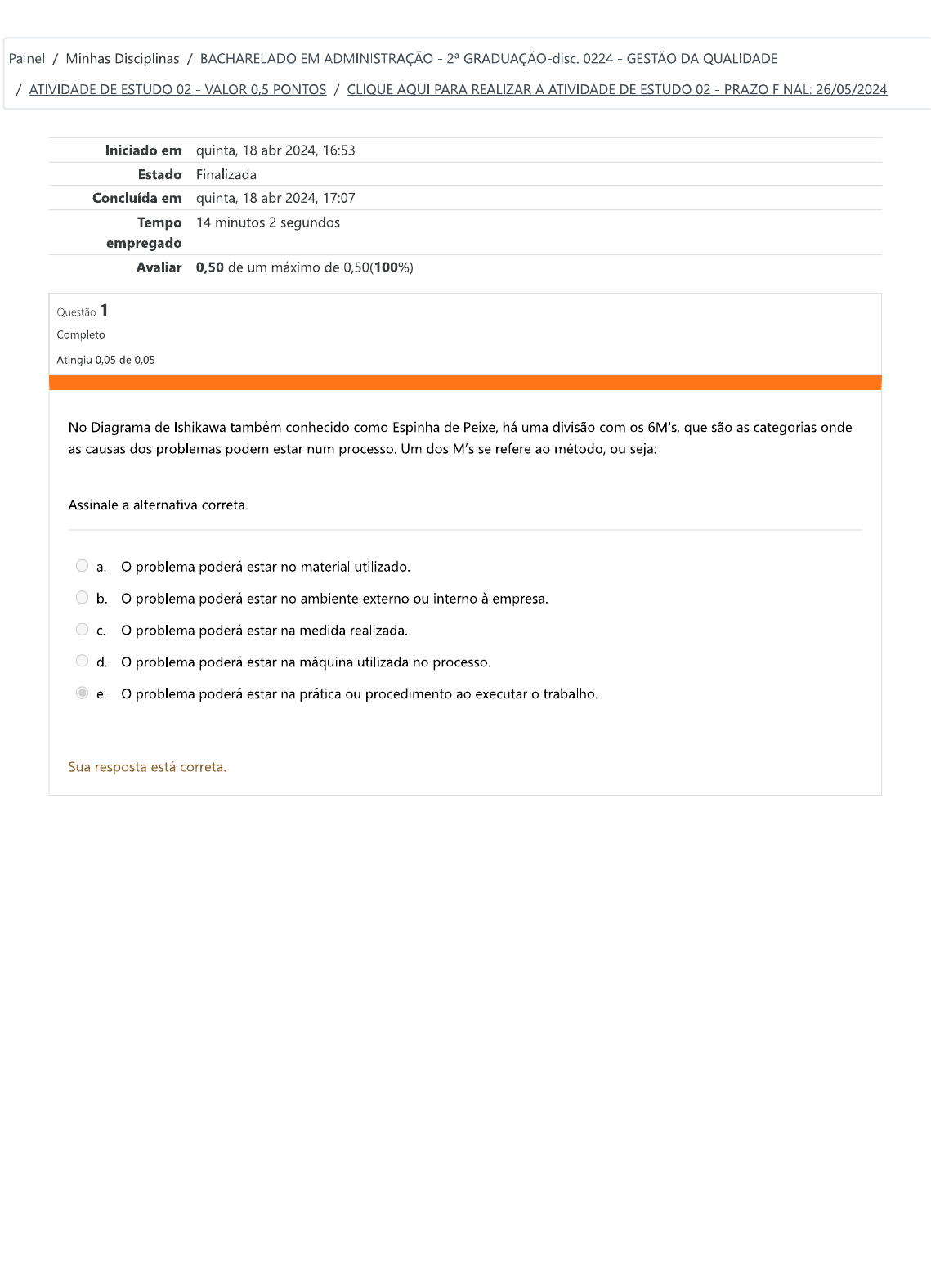Painel / Minhas Disciplinas / BACHARELADO EM ADMINISTRAÇÃO - GRADUAÇÃO-disc 0224 - GESTÃO DA QUALIDADE / ATIVIDADE DE ESTUDO 02 - VALOR 0,5 PONTOS / CLIQUE AQUI PARA REALIZAR A ATIVIDADE DE ESTUDO 02 - PRAZO 26/05/2024 Iniciado em quinta, 18 abr 2024, 16:53 Estado Finalizada Concluída em quinta, 18 abr 2024, 17:07 Tempo 14 minutos 2 segundos empregado Avaliar 0,50 de um máximo de 0,50(100%) Questão 1 Completo Atingiu 0,05 de 0,05 No Diagrama de Ishikawa também conhecido como Espinha de Peixe, há uma divisão com os 6M's, que são as categorias onde as causas dos problemas podem estar num processo. Um dos M's se refere ao método, ou seja: Assinale a alternativa correta. a. problema poderá estar no material utilizado. b. problema poderá estar no ambiente externo ou interno à empresa. C. problema poderá estar na medida realizada. d. problema poderá estar na máquina utilizada no processo. e. problema poderá estar na prática ou procedimento ao executar o trabalho. Sua resposta está correta.Questão 2 Completo Atingiu 0,05 de 0,05 A metodologia da ferramenta DMAIC, utiliza uma divisão de cinco fases focada no processo do Seis Sigma. As cinco fases se referem a: Definir (Define), Medir (Measure), Analisar (Analyse), Melhorar (Improve) e controlar (Control). Na primeira etapa Definir: Assinale a alternativa correta. a. Visa controlar o processo mediante ao uso de sistemas de controle, buscando garantir a identificação dos desvios e suas correções, para evitar defeitos de processo. b. Ocorre a retirada controlada de produtos mediante variáveis de processos a serem examinadas. C. Busca analisar e atualizar dados de processos e determina-los mediante o efeito da causa raiz e impactos que correspondem ao desempenho proposto para a produção. d. Determina o desempenho e a execução momentânea, focada no mapeamento, elaboração de matriz causa e efeito entre outros. e. Definem-se os objetivos, oportunidades, o projeto, os processos-chave, bem como os participantes. Sua resposta está correta. Questão 3 Completo Atingiu 0,05 de 0,05 DMAIC e sua filosofia de trabalho, visam absorver e retirar o erro contido no processo em questão, para isso, o Seis Sigma atua como uma ferramenta contida no Lean Manufacturing (manufatura enxuta), beneficiando os pontos fortes de cada organização. Uma das etapas do DMAIC, consiste em observar e atualizar dados de processos e determina-los mediante ao efeito da causa raiz e impactos que correspondem ao desempenho proposto para a produção. Essa etapa se refere a (ao): Assinale a alternativa correta. a. Controlar (Control). b. Melhorar (Improve). C. (Measure). d. Definir e. Analisar (Analyse). Sua resposta está correta.Questão 4 Completo Atingiu 0,05 de 0,05 programa 5s tem sido desenvolvido de forma eficaz e participativa nas empresas, através de princípios de fácil compreensão e capacidade de apresentar resultados expressivos, por isso cada vez mais as organizações investem na aplicação do mesmo. Nesse contexto um dos "S" se refere ao Seiton e pode-se afirmar que esse senso: Assinale a alternativa correta. a. Define a importância de eliminar a sujeira, resíduos ou mesmo objetos estranhos ou desnecessários ao ambiente. b. É definido pelo cumprimento e comprometimento pessoal para com todas as etapas do programa. C. Significa utilizar materiais, ferramentas, equipamentos, dados, etc. com equilíbrio e bom senso. d. É traduzido na fixação de padrões de cores, formas, iluminação, localização, placas, etc. e. Pode ser interpretado como a importância de se ter todas as coisas disponíveis de maneira que possam ser acessadas e utilizadas imediatamente. Sua resposta está correta. Questão 5 Completo Atingiu 0,05 de 0,05 DMAIC, é peça chave para colocar em prática projetos do Seis Sigma, já que ele irá ajudar a equipe a escolher o caminho certo, com uma melhor visão dos dados e o que fazer em seguida. A ferramenta DMAIC utiliza uma divisão de cinco fases, focada no processo do Seis Sigma. As cinco fases se referem a: Definir (Define), Medir (Measure), Analisar (Analyse), Melhorar (Improve) e Controlar (Control). A etapa controlar se refere a: Assinale a alternativa correta. a. Analisar os dados medidos na etapa anterior e assim ter um cenário claro do estado atual do processo. b. Priorizar as causas raiz e então implementar um plano de ação para colocar em prática as melhorias. C. Avaliar os resultados e impactos das melhorias que forem implantadas. d. Definir qual é o problema que você visa resolver e tudo que é esperado do projeto. e. Monitorar e controlar os resultados das melhorias implementadas e definir controles que irão manter estes resultados. Sua resposta está correta.Questão 6 Completo Atingiu 0,05 de 0,05 5W2H é usado em situações variadas, que vão desde programar uma viagem até o planejamento estratégico dentro de uma empresa, contribuindo assim, para que todos os envolvidos entendam com clareza quais são as etapas a serem seguidas, quem são os responsáveis por cada uma delas e quando cada atividade deve ser finalizada. A sigla 5W2H se refere a perguntas, sendo uma delas o When (quando) cuja resposta: Assinale a alternativa correta. a. Determinará o período ou tempo em que algo será resolvido ou realizado. b. Determinará a quantia gasta com a resolução ou realização de algo. C. Será o local onde deve-se resolver o problema. d. Explicará por que serão executadas tais ações. e. Deve-se definir um objetivo, ou seja, o que será feito para que algo seja resolvido ou realizado. Sua resposta está correta. Questão 7 Completo Atingiu 0,05 de 0,05 A origem e introdução da ferramenta Seis Sigma, ocorreu na empresa Motorola na década de 80, pelo engenheiro Bill Smith. Tudo começou em 1981, quando o engenheiro John Young, CEO da Hewlett Packard (HP) idealizou uma ferramenta que possibilitasse a melhoria da produção no controle de qualidade. Essa ferramenta era chamada de: As