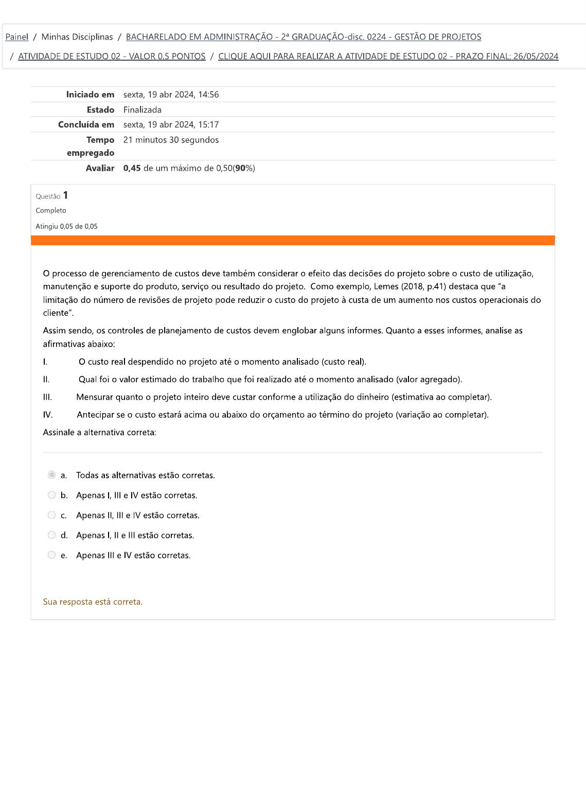 Painel / Minhas Disciplinas / BACHARELADO EM ADMINISTRAÇÃO GRADUAÇÃO-disc 0224 - GESTÃO DE PROJETOS / ATIVIDADE DE ESTUDO 02 - VALOR 0,5 PONTOS / CLIQUE AQUI PARA REALIZAR A ATIVIDADE DE ESTUDO 02 PRAZO FINAL: 26/05/2024 Iniciado em sexta, 19 abr 2024, 14:56 Estado Finalizada Concluída em sexta, 19 abr 2024, 15:17 Tempo 21 minutos 30 segundos empregado Avaliar 0,45 de um máximo de 0,50(90%) Questão 1 Completo Atingiu 0,05 de 0,05 O processo de gerenciamento de custos deve também considerar o efeito das decisões do projeto sobre o custo de utilização, manutenção e suporte do produto, serviço ou resultado do projeto. Como exemplo, Lemes (2018, p.41) destaca que "a limitação do número de revisões de projeto pode reduzir o custo do projeto à custa de um aumento nos custos operacionais do cliente". Assim sendo, os controles de planejamento de custos devem englobar alguns informes. Quanto a esses informes, analise as afirmativas abaixo: I. O custo real despendido no projeto até o momento analisado (custo real). II. Qual foi o valor estimado do trabalho que foi realizado até o momento analisado (valor agregado). III. quanto o projeto inteiro deve custar conforme a utilização do dinheiro (estimativa ao completar). IV. Antecipar se o custo estará acima ou abaixo do orçamento ao término do projeto (variação ao completar). Assinale a alternativa correta: a. Todas as alternativas estão corretas. b. Apenas I, III e IV estão corretas. C. Apenas II, III e IV estão corretas. d. Apenas I, e III estão corretas. e. Apenas III e IV estão corretas. Sua resposta está correta.Questão 2 Completo Atingiu 0,05 de 0,05 objetivo final deste processo é a obtenção de um diagrama de rede completo, compreendendo todas as atividades do projeto e suas diversas inter-relações. Tal afirmação se refere a que processo? Assinale a alternativa correta: a. Controle de Mudança do escopo. b. Decomposição de atividades. C. Definição de cronograma. d. Sequenciamento das atividades. e. Estimativa de duração das atividades. Sua resposta está correta. Questão 3 Completo Atingiu 0,05 de 0,05 É o montante de custos orçados para o trabalho agendado a ser realizado, acrescido da quantidade, do nível de esforço ou do esforço distribuído agendado para ser realizado em um determinado período de tempo. Tal afirmação se refere a (o): a. custo orçado do trabalho realizado (COTR). b. custo orçado do trabalho agendado (COTA). C. custo real do trabalho realizado (CRTR). d. custo orçado do trabalho previsto (COTP). e. custo real do trabalho previsto (CRTP) Sua resposta está correta.Questão 4 Completo Atingiu 0,05 de 0,05 a Estrutura Analítica do Projeto (EAP), é a principal entrada para a definição da atividade; ela define as entregas do projeto e sua decomposição em "pacotes de trabalho", fornecendo assim uma visão estruturada das entregas do projeto e é um ótimo instrumento para alinhar o entendimento do projeto e integrar todas as áreas. Não obstante, quanto ao processo de definição de atividades, analise as afirmativas abaixo: I. Podemos dizer que há entradas neste processo (Atualizações do cronograma; Ações corretivas; Lições aprendidas). II. Como técnicas e ferramentas, destaca-se a decomposição e modelos (templates). III. A decomposição, dentro do contexto do processo da definição de atividade, a decomposição envolve subdividir os pacotes de trabalho do projeto em componentes menores e mais manejáveis para fornecer melhor controle do gerenciamento. IV. Por fim, como saídas da definição das atividades, destaca-se listas de atividades, detalhamento do suporte, e atualizações na EAP. Assinale a alternativa correta: a. Apenas II, III e IV estão corretas. b. Todas as alternativas estão corretas. C. Apenas I, e IV estão corretas. d. Apenas III e IV estão corretas. e. Apenas I, e III estão corretas. Sua resposta está correta.Questão 5 Completo Atingiu 0,00 de 0,05 Executar um projeto sem gerenciar frequentemente os custos é um processo que pode comprometer o seu Dessa forma, realizar revisões constantes previne que as estimativas fujam descontroladamente da previsão inicial, pois é mais fácil adequar um sobrecusto pequeno do que um sobrecusto descomedido. Neste sentido, quanto aos custos de conformidade, analise as afirmativas abaixo: I. Treinamentos. II. Retrabalho. III. Descarte. IV. Documentação de processos. Assinale a alternativa correta: a. Todas as alternativas estão corretas. b. Apenas I, e III estão corretas. C. Apenas III e IV estão corretas. d. Apenas I, III e IV estão corretas. e. Apenas e III estão corretas. Sua resposta está incorreta.Questão 6 Completo Atingiu 0,05 de 0,05 Outro aspecto importante com relação ao gerenciamento de custos diz respeito aos orçamentos. orçamento não pode ser considerado simplesmente como uma visão do plano. Deste modo, analise as afirmativas abaixo: I. Orçar os custos é igual a estimar seus valores. orçamento precisa ser validado ao longo da execução do projeto como uma forma de controle de custos, para que os eventuais problemas sejam identificados o mais cedo possível e para que a solução possa ser antecipada, evitando danos graves ao orçamento. III. processo de orçamentação pode ser traduzido na agregação dos custos estimados de atividades individuais ou pacotes de trabalho para estabelecer uma linha de base dos custos. IV. Um orçamento pode ser definido como a expressão quantitativa de um plano de ação e de ajuda à coordenação e implementação. Assinale a alternativa correta: a. Apenas II, III e IV estão corretas. b. Todas as alternativas estão corretas. C. Apenas I, e III estão corretas. d. Apenas I, III e IV estão corretas. e. Apenas III e IV estão corretas. Sua resposta está correta.Questão 7 Completo Atingiu 0,05 de 0,05 processo de estimar a duração das atividades de acordo com o PMI (2017) é "obter avaliações quantitativas do número pr