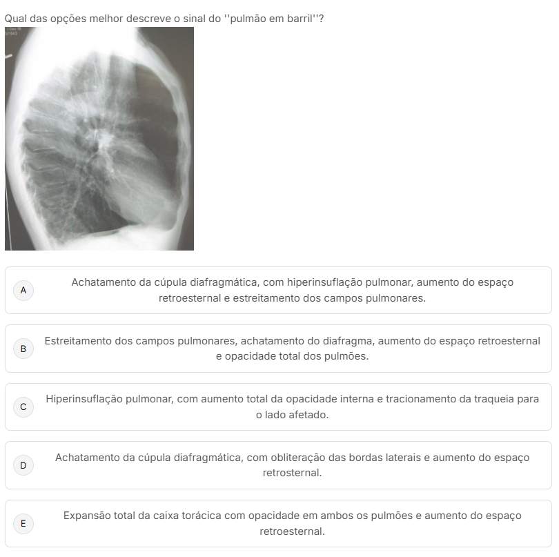 memor descreve O do em A Achatamento da cúpula diafragmática, com hiperinsuflação pulmonar, aumento do espaço retroesternal e estreitamento dos campos pulmonares. Estreitamento dos campos pulmonares, achatamento do diafragma, aumento do espaço retroesternal B e opacidade total dos C Hiperinsuflação pulmonar, com aumento total da opacidade interna e tracionamento da traqueia para lado afetado. D Achatamento da cúpula diafragmática, com obliteração das bordas laterais e aumento do espaço retrosternal. Expansão total da caixa torácica com opacidade em ambos os pulmões e aumento do espaço E