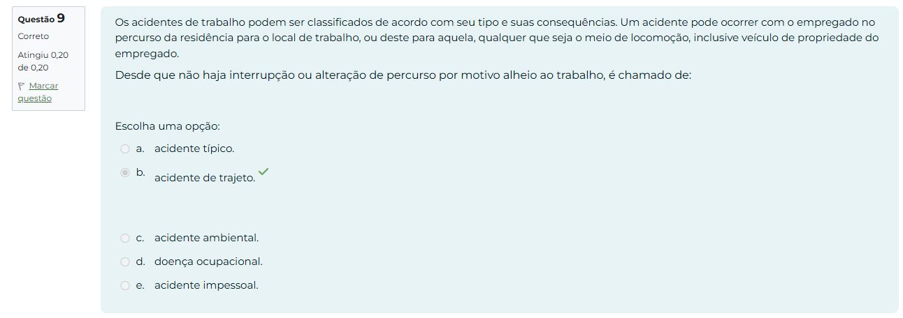 Questão 9 Os acidentes de trabalho podem ser classificados de acordo com seu tipo e suas consequências. Um acidente pode ocorrer com empregado no Correto percurso da residência para local de trabalho, ou deste para aquela, qualquer que seja meio de locomoção, inclusive veículo de propriedade do Atingiu 0,20 empregado. de 0,20 Desde que não haja interrupção ou alteração de percurso por motivo alheio ao trabalho, é chamado de: P Marcar questão Escolha uma opção: a. acidente típico. b. acidente de trajeto. C. acidente d. doença ocupacional. e. acidente impessoal.