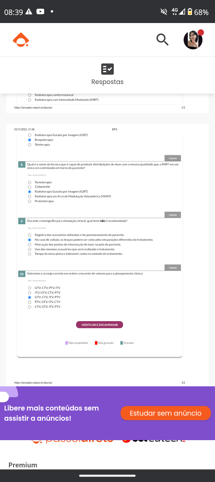 Respostas Radioterapia conformacional Radioterapia com Intensidade Modulada (IMRT) https://simulado estacio 2/3 21:48 EPS Radioterapia por Imagem (IGRT) Braquiterapia Teleterapia 1 8 Qual nome da técnica que é capaz de produzir distribuições de dose com a mesma qualidade que a IMRT em um único arco otimizado em torno do paciente? Tomoterapia Cyberknife Radioterapia Guiada por Imagem (IGRT) Radioterapia em Arco de Modulação Volumétrica (VMAT) Protonterapia 1 ponto 9. Durante a tomografia para simulação virtual, qual item não é recomendado? (Ret Registro dos acessórios utilizados e do posicionamento do paciente. No caso de os braços podem ser colocados em posições diferentes do Marcação dos pontos de intersecção do laser na pele do paciente. Uso dos mesmos acessórios que será realizado o Tampo da mesa plana como na unidade de 1 10 Selecione o arranjo correto em ordem crescente de volume para planejamento (Ret CTV, ITV ITV. GTV. PTV GTV. CTV. PTV ITV. CTV GTV. ITV. PTV VERIFICAR E ENCAMINHAR Não respondida Não gravada Gravada https://simulado estacio br/alunos/ 3/3 Libere mais conteúdos sem Estudar sem anúncio assistir a anúncios! Premium