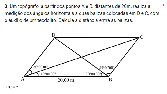 3. Um a partir dos pontos A e B, distantes de 20m, realiza a * medição dos ângulos horizontais a duas balizas colocadas em D e C, com auxílio de um teodolito. Calcule a distância entre as balizas. D C 85°00'00" A 20,00 m B DC =?