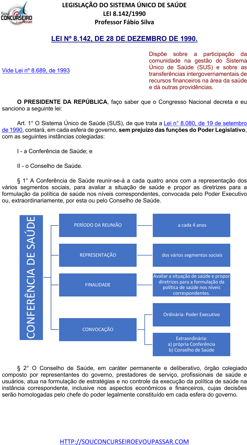 LEGISLAÇÃO DO SISTEMA ÚNICO DE SAÚDE LEI 8.142/1990 Professor Fábio Silva HTTP://SOUCONCURSEIROEVOUPASSAR.COM LEI Nº 8.142, DE 28 DE DEZEMBRO DE 1990. Vide Lei nº 8.689, de 1993 Dispõe sobre a participação da comunidade na gestão do Sistema Único de Saúde (SUS) e sobre as transferências intergovernamentais de recursos financeiros na área da saúde e dá outras providências. O PRESIDENTE DA REPÚBLICA, faço saber que o Congresso Nacional decreta e eu sanciono a seguinte lei: Art. 1° O Sistema Único de Saúde (SUS), de que trata a Lei n° 8.080, de 19 de setembro de 1990, contará, em cada esfera de governo, sem prejuízo das funções do Poder Legislativo, com as seguintes instâncias colegiadas: I - a Conferência de Saúde; e II - o Conselho de Saúde. § 1° A Conferência de Saúde reunir-se-á a cada quatro anos com a representação dos vários segmentos sociais, para avaliar a situação de saúde e propor as diretrizes para a formulação da política de saúde nos níveis correspondentes, convocada pelo Poder Executivo ou, extraordinariamente, por esta ou pelo Conselho de Saúde. § 2° O Conselho de Saúde, em caráter permanente e deliberativo, órgão colegiado composto por representantes do governo, prestadores de serviço, profissionais de saúde e usuários, atua na formulação de estratégias e no controle da execução da política de saúde na instância correspondente, inclusive nos aspectos econômicos e financeiros, cujas decisões serão homologadas pelo chefe do poder legalmente constituído em cada esfera do governo. CO N FE RÊ N CI A DE S AÚ DE PERÍODO DA REUNIÃO a cada 4 anos REPRESENTAÇÃO dos vários segmentos sociais FINALIDADE Avaliar a situação de saúde e propor diretrizes para a formulação da política de saúde nos níveis correspondentes. CONVOCAÇÃO Ordinária: Poder Executivo Extraordinária: a) própria Conferência b) Conselho de Saúde Thayná Bindá - 04076314298 LEGISLAÇÃO DO SISTEMA ÚNICO DE SAÚDE LEI 8.142/1990 Professor Fábio Silva HTTP://SOUCONCURSEIROEVOUPASSAR.COM § 3° O Conselho Nacional de Secretários de Saúde (Conass) e o Conselho Nacional de Secretários Municipais de Saúde (Conasems) terão representação no Conselho Nacional de Saúde. CO N SE LH O D E SA Ú DE FUNÇÃO em caráter permanente e deliberativo ORGÃO COLEGIADO composto por Representantes do Governo Prestadores de Serviço Profissionais de saúde Usuários ATUAÇÃO atua na formulação de estratégias e no controle da execução da política de saúde na instância correspondente, inclusive nos aspectos econômicos e financeiros DECISÕES Homologadas pelo Chefe do Poder legalmente constituído em cada esfera do governo. CONFERÊNCIAS DE SAÚDE e CONSELHOS DE SAÚDE Terão sua organização e normas de funcionamento definidas em regimento próprio Aprovadas pelo respectivo conselho. REPRESENTAÇÃO DOS USUÁRIOS NOS CONSELHOS DE SAÚDE E CONFERÊNCIAS Será paritária em relação ao conjuntos dos demais segmentos. Terão representação no CONSELHO NACIONAL DE SAÚDE Conselho Nacional de Secretários de Saúde (CONASS) Conselho Nacional de Secretários Municipais de Saúde (CONASEMS) Thayná Bindá - 04076314298 LEGISLAÇÃO DO SISTEMA ÚNICO DE SAÚDE LEI 8.142/1990 Professor Fábio Silva HTTP://SOUCONCURSEIROEVOUPASSAR.COM § 4° A representação dos usuários nos Conselhos de Saúde e Conferências será paritária em relação ao conjunto dos demais segmentos. § 5° As Conferências de Saúde e os Conselhos de Saúde terão sua organização e normas de funcionamento definidas em regimento próprio, aprovadas pelo respectivo conselho. Art. 2° Os recursos do Fundo Nacional de Saúde (FNS) serão alocados como: I - despesas de custeio e de capital do Ministério da Saúde, seus órgãos e entidades, da administração direta e indireta; II - investimentos previstos em lei orçamentária, de iniciativa do Poder Legislativo e aprovados pelo Congresso Nacional; III - investimentos previstos no Plano Qüinqüenal do Ministério da Saúde; IV - cobertura das ações e serviços de saúde a serem implementados pelos Municípios, Estados e Distrito Federal. Parágrafo único. Os recursos referidos no inciso IV deste artigo destinar-se-ão a investimentos na rede de serviços, à cobertura assistencial ambulatorial e hospitalar e às demais ações de saúde. Art. 3° Os recursos referidos no inciso IV do art. 2° desta lei serão repassados de forma regular e automática para os Municípios, Estados e Distrito Federal, de acordo com os critérios previstos no art. 35 da Lei n° 8.080, de 19 de setembro de 1990. Recursos do Fundo Nacional de Saúde (FNS) serão alocados I - despesas de custeio e de capital do Ministério da Saúde, seus órgãos e entidades, da administração direta e indireta; II - investimentos previstos em lei orçamentária, de iniciativa do Poder Legislativo e aprovados pelo Congresso Nacional; III - investimentos previstos no Plano Qüinqüenal do Ministério da Saúde; IV - cobertura das ações e serviços de saúde a serem implementados pelos Municípios, Estados e Distrito Federal. Thayná Bindá - 04076314298 LEGISLAÇÃO DO SISTEMA ÚNICO DE SAÚDE LEI 8.142/1990 Professor Fábio Silva HTTP://SOUCONCURSEIROEVOUPASSAR.COM § 1° Enquanto não for regulamentada a aplicação dos critérios previstos no art. 35 da Lei n° 8.080, de 19 de setembro de 1990, será utilizado, para o repasse de recursos, exclusivamente o critério estabelecido no § 1° do mesmo artigo. (Vide Lei nº 8.080, de 1990) § 2° Os recursos referidos neste artigo serão destinados, pelo menos setenta por cento, aos Municípios, afetando-se o restante aos Estados. § 3° Os Municípios poderão estabelecer consórcio para execução de ações e serviços de saúde, remanejando, entre si, parcelas de recursos previstos no inciso IV do art. 2° desta lei. Art. 4° Para receberem os recursos, de que trata o art. 3° desta lei, os Municíp