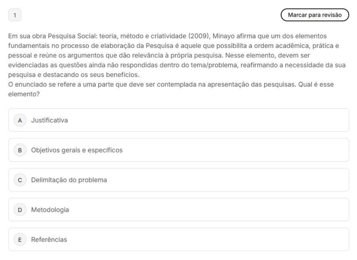 1 Marcar para revisão Em sua obra Pesquisa Social: teoria, método e criatividade (2009), Minayo afirma que um dos elementos fundamentais no processo de elaboração da Pesquisa é aquele que possibilita a ordem acadêmica, prática e pessoal e reúne os argumentos que dão relevância à própria pesquisa. Nesse elemento, devem ser evidenciadas as questões ainda não respondidas dentro do tema/problema, reafirmando a necessidade da sua pesquisa e destacando os seus benefícios. o enunciado se refere a uma parte que deve ser contemplada na apresentação das pesquisas. Qual é esse elemento? A Justificativa B Objetivos gerais e específicos C Delimitação do problema D Metodologia E Referências2 Marcar para revisão o plágio, além de ser considerado uma prática antiética na pesquisa também é criminalizado, em razão da violação do direito autoral. Qual é a importância de citar as fontes de informação em um trabalho científico? A Não há necessidade de citar as fontes de informação, uma vez que trabalho é original. B As citações são importantes apenas para evitar o plágio. C As citações são importantes para fortalecer os argumentos do autor do trabalho. D As citações são importantes apenas para dar crédito a trabalhos anteriores. As citações são importantes para apresentar as fontes de informação usadas e permitir a verificação E e reprodução do trabalho.3 Marcar para revisão Apresenta-se como elemento obrigatório. Reúne as informações sobre todas as fontes de consulta citadas durante o trabalho, permitindo a identificação de cada obra. Deve conter as seguintes informações das obras citadas, organizadas por ordem alfabética: autor, título da obra, edição, local, editora e data de publicação. Quando houver informação adicional, deve estar evidenciada (volume, total de páginas). Para consultas via internet, deve-se indicar também endereço e a data de acesso do documento. A descrição acima define qual elemento? A Referência. B Glossário. C Apêndice. D E Prólogo.4 Marcar para revisão Maria Cecília Minayo entende que a teoria representa "conhecimentos que foram construídos cientificamente sobre determinado assunto, por outros estudiosos que o abordaram antes de nós e lançam luz sobre a nossa pesquisa". (MINAYO, Maria Cecília de Sousa (Org.) Pesquisa Social: teoria, método e criatividade. 28. ed. Vozes, 2009, p. 16.) Qual a função da teoria em uma pesquisa de acordo com ela? A Elaborar um discurso floreado, independente do volume de informações. B Desconectar as informações e ideias já existentes. Evidenciar o objeto de investigação, delimitar o problema, organizar os dados e conduzir a análise dos C dados. D Ser a única base para a produção de novos conhecimentos. E Impedir que pesquisador possa inovar em sua área de atuação.5 Marcar para revisão Um artigo é um trabalho que pode ser elaborado tanto como uma revisão de um trabalho já existente quanto para um tema inédito e original. Para garantir que os tópicos principais, opcionais e obrigatórios estejam presentes no artigo, a Associação Brasileira de Normas Técnicas publicou qual norma? A NBR 6022. B ABNT 2260. C NBR 3044. D NBR 9062. E NBR 1010.6 Marcar para revisão A tese consiste em um grande esforço de sistematização de uma pesquisa ou, pelo menos, dos pontos principais. Espera-se que ela apresente um alto grau de autonomia, seja original e contribua significativamente para avanço do conhecimento de sua área. Assinale a alternativa que apresenta a característica esperada de uma tese: A Exaustão. B Brevidade. C Reflexões prolixas. D Extensão de páginas em detrimento da profundidade da análise. E Repetição de experiências anteriores.7 Marcar para revisão Os artigos científicos são a produção mais comum no meio acadêmico, como resultado de um processo de pesquisa. E há muitos motivos para sua produção. Assinale a alternativa que apresenta um motivo mais coerente com outra forma de produção acadêmica que o artigo: A Registrar os resultados de uma pesquisa. B Refutar um erro presente no campo de estudo. C Dar visibilidade a uma questão que se revela secundária na pesquisa. D Discutir, de maneira inovadora, uma questão antiga. E Apresentar inovações ou descobertas significativas para a ciência.8 Marcar para revisão Os resumos consistem em um recurso cuja exigência pelo uso é universal. Desse modo, verificamos seu emprego não só em fichamentos e resenhas acadêmicas, mas também nos elementos pré-textuais de artigos científicos e trabalhos de conclusão. Devido à sua múltipla utilização, a NBR 6028 (ABNT, 2003b) prevê a existência de resumos indicativos e informativos. Assinale a alternativa que contempla, exclusivamente, as características do resumo informativo: A Presença de palavras-chave. B Referência à metodologia. C Necessidade de leitura do texto completo. D Referência aos objetivos. E Dispensa da leitura do texto completo.9 Marcar para revisão A respeito da produção de trabalhos acadêmicos e mais especificamente sobre a técnica de fichamento, analise as afirmativas abaixo e responda: I. Não existe uma maneira "correta" de se fazer um fichamento. II. Referência bibliográfica é o último tópico a ser registrado em um fichamento III. Referência bibliográfica, resumo indicativo e citações devem, necessariamente, estar presentes em qualquer fichamento IV. Citações podem ser feitas livremente em um texto acadêmico, não existindo um regramento específico a respeito disso A e III estão corretas. B I, II, III e IV estão corretas. C e III estão corretas. D II e IV estão corretas. E e IV estão corretas.10 Marcar para revisão Ao liderar uma equipe para desenvolver um projeto beneficente com orçamento limitado, você precisa decidir como distribuir os recursos disponíveis. As opções envolvem parcerias locais, voluntariado e campanhas online de financiamento. Pergunta: Qual 