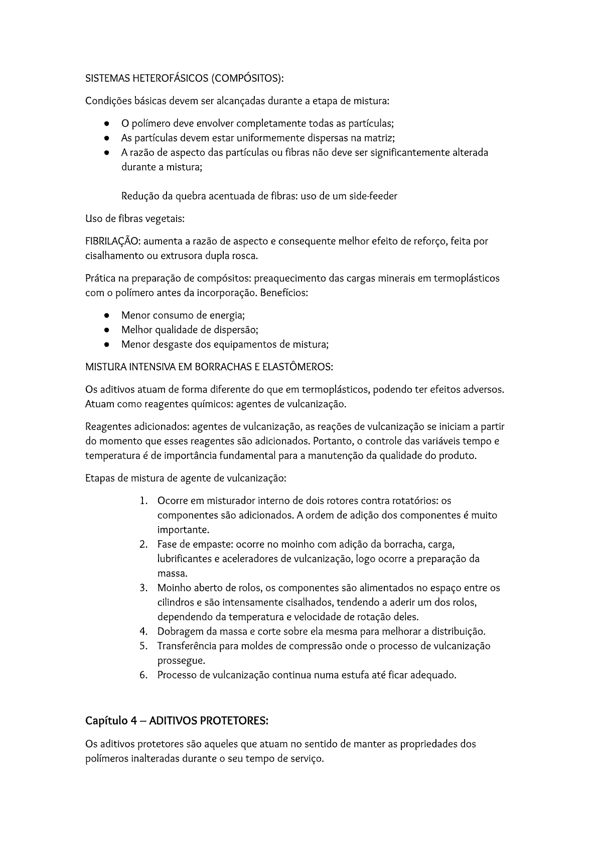 SISTEMAS HETEROFÁSICOS (COMPÓSITOS): Condições básicas devem ser alcançadas durante a etapa de mistura: O polímero deve envolver completamente todas as partículas; As partículas devem estar uniformemente dispersas na matriz; A razão de aspecto das partículas ou fibras não deve ser significantemente alterada durante a mistura; Redução da quebra acentuada de fibras: uso de um side-feeder Uso de fibras vegetais: FIBRILAÇÃO: aumenta a razão de aspecto e consequente melhor efeito de reforço, feita por cisalhamento ou extrusora dupla rosca. Prática na preparação de compósitos: preaquecimento das cargas minerais em termoplásticos com o polímero antes da incorporação. Benefícios: Menor consumo de energia; Melhor qualidade de dispersão; Menor desgaste dos equipamentos de mistura; MISTURA INTENSIVA EM BORRACHAS E ELASTÔMEROS: Os aditivos atuam de forma diferente do que em termoplásticos, podendo ter efeitos adversos. Atuam como reagentes químicos: agentes de vulcanização. Reagentes adicionados: agentes de vulcanização, as reações de vulcanização se iniciam a partir do momento que esses reagentes são adicionados. Portanto, o controle das variáveis tempo e temperatura é de importância fundamental para a manutenção da qualidade do produto. Etapas de mistura de agente de vulcanização: 1. Ocorre em misturador interno de dois rotores contra rotatórios: os componentes são adicionados. A ordem de adição dos componentes é muito importante. 2. Fase de empaste: ocorre no moinho com adição da borracha, carga, lubrificantes e aceleradores de vulcanização, logo ocorre a preparação da massa. 3. Moinho aberto de rolos, os componentes são alimentados no espaço entre os cilindros e são intensamente cisalhados, tendendo a aderir um dos rolos, dependendo da temperatura e velocidade de rotação 4. Dobragem da massa e corte sobre ela mesma para melhorar a distribuição. 5. Transferência para moldes de compressão onde o processo de vulcanização prossegue. 6. Processo de vulcanização continua numa estufa até ficar adequado. Capítulo 4 ADITIVOS PROTETORES: Os aditivos protetores são aqueles que atuam no sentido de manter as propriedades dos polímeros inalteradas durante o seu tempo de serviço.Exemplos: antioxidantes, estabilizante, foto estabilizantes. REAÇÕES DE DEGRADAÇÃO QUIMICA: Fragilização, alteração de cor, perda de brilho e transparência, fissuramento Degradação: qualquer reação química que altera de forma indesejável a qualidade de interesse de um material polimérico ou de um composto. Estabilização; operação que inibe o processo de degradação. ETAPAS DE DEGRADAÇÃO: 1. Iniciação: está sempre relacionada ao rompimento de uma ligação química covalente e a formação de radicais livres. De um modo geral a degradação se inicia com a quebra homolitica das ligações C-C ou C-H formando dois radicais livres. A presença de carbonos terciários torna o polímero mais ao processo de iniciação. Ex: Polipropileno menos estável que o polietileno de alta densidade. 2. Propagação: Pode de duas formas: Reticulação: no caso do polietileno com ausência de oxigênio predomina reticulação. Cisão-B: no polipropileno com o carbono terciário predomina a cisão-B. Quebra por hidrolise: não existe aditivação suficiente e a prevenção se resume a um rígido controle de secagem. 3. Terminação: continuação das reações auto catalíticas de oxidação. PROCESSO DE OXIDAÇÃO: Compreende três etapas: iniciação, propagação e terminação. Na iniciação forma-se o radical peroxila, na propagação esse radical interage com outra cadeia ou outro segmento na mesma cadeia polimérica, formando um hidroperoxido. A terminação poderá ocorrer pela recombinação de dois radicais livres ou também pela reação de dois radicais peroxila formando uma molécula de água. Polímeros Halogenados: mecanismo de degradação é diferente para, por exemplo, PVC, PVA. Ocorre a formação de uma ligação dupla na cadeia polimérica C-C e a liberação de uma molécula de ácido. Sendo a propagação da reação catalisada pela presença do ácido e formação de uma sequência de ligações duplas conjugadas. Degradação fotoquímica: Ocorre com a presença de uma molécula ou ligação química em um estado atômico excitado gerado pela absorção de luz ou pela energia liberada em reações químicas. Cromóforo: grupo químico responsável pela absorção de luz. Intrínsecos e extrínsecos.Grupos químicos comuns para sofrer degradação fotoquímica: ligações duplas C-C conjugadas, os anéis aromáticos, ligações C-O, e os peróxidos O-O. Trata-se de um processo localizado na superfície do produto. Agente de con pode inibir ou aceleran degradação fotoquímica. ANTIOXIDANTES: Estabilizantes primários: atuam diretamente na eliminação de radicais livres que reagem com o oxigênio formando hidroperóxidos. Mais comuns: derivados no fenol e com diferentes substituintes na posição para. Possuem alta massa molar para reduzir coeficiente de difusão, para aumentar sua compatibilidade com o polímero. O controle do coeficiente de difusão é importante para reduzir as perdas para o ambiente e por lixiviação, sua permanência na massa polimérica. Migrações para superfície podem ser necessárias, por isso existe misturas dos estabilizantes. Lembre-se o processo oxidativo ocorre na superfície. Exemplos de estabilizantes primários: Vitamina E: usada como estabilizante para alimentos com a vantagem de ser atóxica, pode ser inclusa no consumo de bebidas e alimentos. Usada em poliolefinas. Aminas: Bom estabilizante primário, porem tóxicos. Estabilizantes secundários: atuam na desativação ou degradação de hidroperóxidos. O uso de estabilizantes primários retarda a velocidade de degradação, mas não a elimina nem mesmo temporariamente. Transforma o hidro peróxido em produtos menos reativos e termicamente 