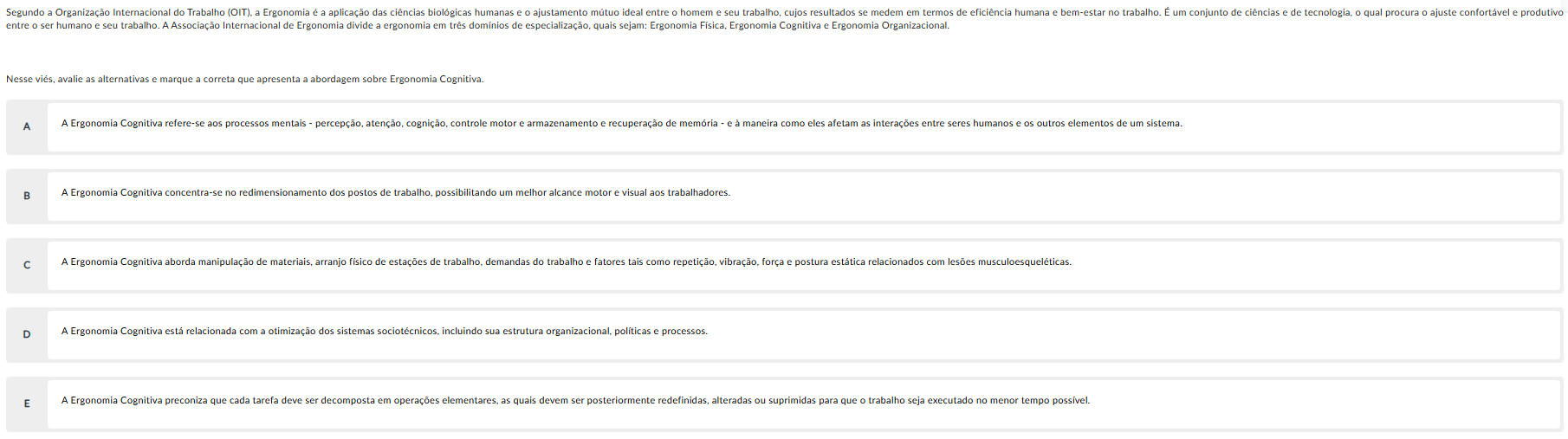 Segundo a Organização Internacional do Trabalho (OIT). a Ergonomia é a aplicação das ciências biológicas humanas e o ajustamento ideal entre homem e seu cujos resultados se medem em termos de eficiência humana e bem-estar no trabalho. É um conjunto de ciências e de tecnologia, qual procura ajuste confortável e produtivo entre o ser humano e seu trabalho. A Associação Internacional de Ergonomia divide a ergonomia em três domínios de quais sejam: Ergonomia Ergonomia Cognitiva e Ergonomia Organizacional. Nesse avalie as alternativas e marque a correta que apresenta a abordagem sobre Ergonomia Cognitiva. A A Ergonomia Cognitiva refere-se aos processos mentais percepção. controle motor e armazenamento e recuperação de e à maneira como eles afetam as interações entre seres humanos e os outros elementos de um B A Ergonomia Cognitiva concentra-se no redimensionamento dos postos de trabalho. possibilitando um melhor alcance motor e visual aos trabalhadores A Ergonomia Cognitiva aborda manipulação de arranjo físico de estações de demandas do trabalho e fatores tais como força e postura estática relacionados com lesões D A Ergonomia Cognitiva está relacionada com a otimização dos sistemas incluindo sua estrutura organizacional, políticas e processos. E A Ergonomia Cognitiva preconiza que cada tarefa deve ser decomposta em operações elementares, as quais devem ser posteriormente redefinidas, alteradas ou suprimidas para que trabalho seja executado no menor tempo possível.