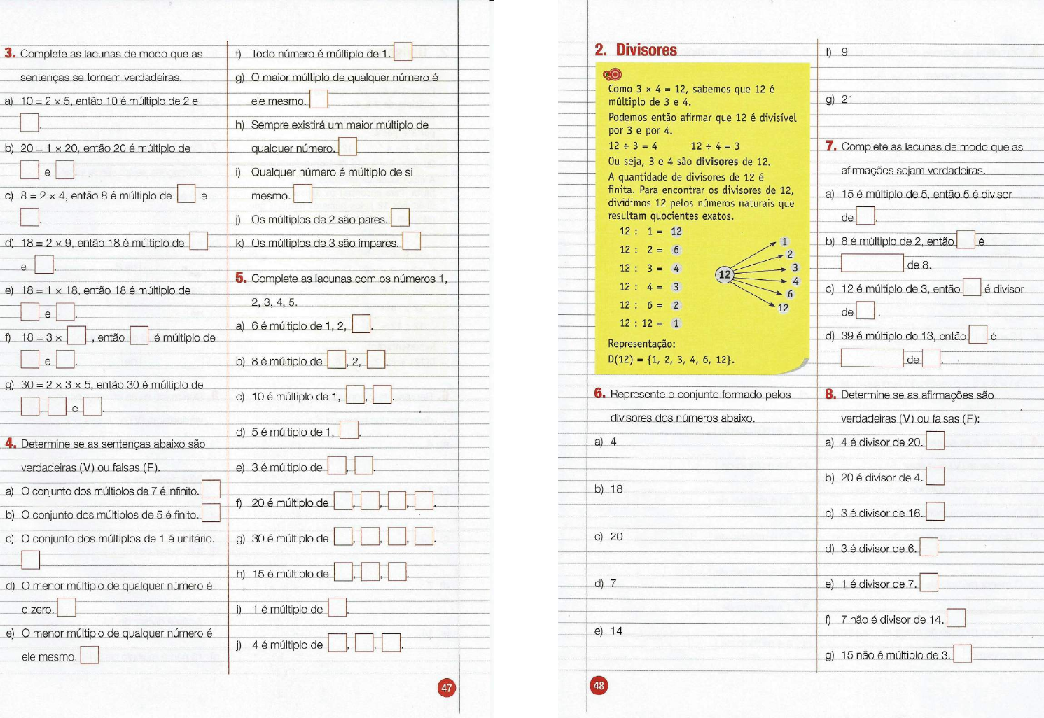 3. Complete as lacunas de modo que as f) Todo número é múltiplo de 1. 2. Divisores f) 9 sentenças se tornem verdadeiras. g) maior múltiplo de qualquer número é Como 3 x 4 = 12, sabemos que a) 10 = 2 5, então 10 é múltiplo de 2 e ele mesmo. múltiplo de 3 e 4. g) 21 Podemos então afirmar que 12 é divisível h) Sempre existirá um maior múltiplo de 4. b) 20 = 1 20, então 20 é múltiplo de qualquer 7. Complete as lacunas de modo que as Ou seja, 3 e 4 são divisores de 12. e i) Qualquer número é múltiplo de si afirmações sejam verdadeiras. A quantidade de divisores de 12 é finita. Para encontrar os divisores de 12, c) 8 = 2 4, então 8 é múltiplo de e mesmo. a) 15 é múltiplo de 5, então 5 é divisor dividimos 12 pelos números naturais que j) Os múltiplos de 2 são pares. resultam quocientes exatos. de d) 18 = 2 9, então 18 é múltiplo de k) Os múltiplos de 3 são 1 b) múltiplo de 2, então é 12 2 = 6 2 e 12 3 = 4 3 de 8. 5. Complete as lacunas com os números 1, 12 4 e) 18 = 1 18, então 18 é múltiplo de 12 4 = 3 c) 12 é múltiplo de 3, então é divisor 6 2, 3, 4, 5. 12 6 = 2 12 e de a) múltiplo de 1, 2, 12 12 = 1 f) 18=3x então é múltiplo de d) múltiplo de 13, então é Representação: e b) é múltiplo de 2. D(12) = {1, 2, 3, 4, 6, 12}. de g) 30 = 2 3 5, então 30 é múltiplo de c) 10 é múltiplo de 1, 6. Represente o conjunto formado pelos 8. Determine se as afirmações são e divisores dos números verdadeiras (V) ou falsas (F): d) 5 é múltiplo de 1, 4. Determine se as sentenças abaixo são a) 4 a) 4 é divisor de 20. verdadeiras (V) ou falsas e) múltiplo de b) é divisor de 4. a) conjunto dos múltiplos de infinito. b) 18 f) 20 é múltiplo de b) conjunto dos múltiplos de 5 é finito. c) divisor de 16. c) O conjunto dos múltiplos de 1 é unitário. g) 30 é múltiplo de c) 20 d) divisor de 6. h) 15 é múltiplo de d) menor múltiplo de qualquer número é d) 7 e) divisor de 7. zero. i) 1 é múltiplo de f) 7 não é divisor de 14. e) O menor múltiplo de qualquer número é e) 14 j) 4 é múltiplo de ele mesmo. g) 15 não é múltiplo de 3. 47 48