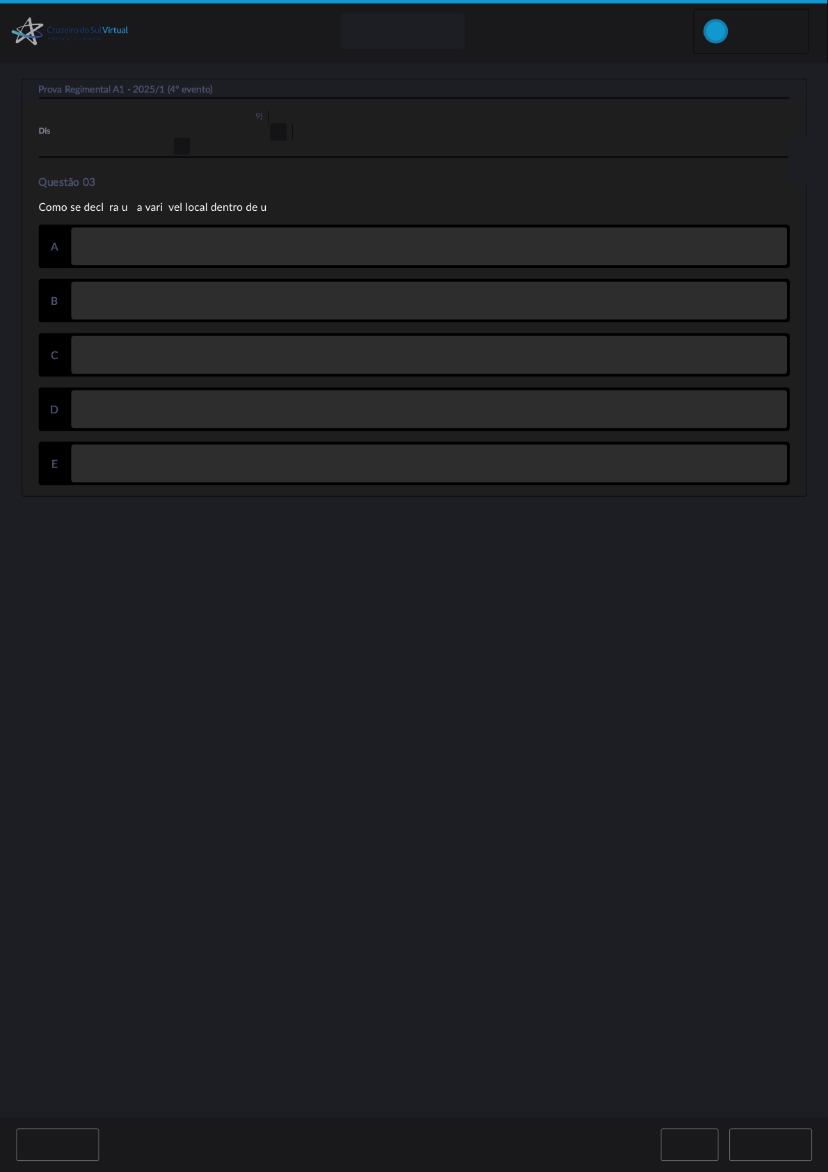 Prova Regimental A1 - 2025/1 (4º evento) Questão 03 Como se declara uma variável local dentro de uma função em Shell Script? A B C D E Curso: ENGENHARIA DE SOFTWARE (BACHARELADO) (119) Disciplina: MODELAGEM DE PROCESSOS E SISTEMAS (2975); +1 Turma: Turma_001 (2050727_2975); +1 Usando a palavra-chave local antes do nome da variável. Declarando a variável fora da função antes de usá-la dentro. Não é possível declarar variáveis locais dentro de funções em Shell Script. Usando a palavra-chave global antes do nome da variável. Variáveis dentro de funções são locais por padrão, sem necessidade de declaração especial. Raylson Iglesias 16_3386047503:55:17 RI Anterior 3/16 Próximo