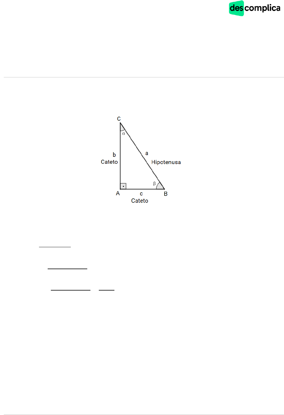 Matemática Trigonometria Teoria Trigonometria no triângulo retângulo Consideramos um triângulo retângulo 𝐴𝐵𝐶. Podemos definir algumas relações que envolvem os ângulos do triângulo retângulo. São elas: o seno, o cosseno e a tangente. Definimos essas linhas (ou razões) trigonométricas da seguinte forma: • 𝑆𝑒𝑛𝑜 = 𝑐𝑎𝑡𝑒𝑡𝑜 𝑜𝑝𝑜𝑠𝑡𝑜 ℎ𝑖𝑝𝑜𝑡𝑒𝑛𝑢𝑠𝑎 • Cosseno = 𝑐𝑎𝑡𝑒𝑡𝑜 𝑎𝑑𝑗𝑎𝑐𝑒𝑛𝑡𝑒 ℎ𝑖𝑝𝑜𝑡𝑒𝑛𝑢𝑠𝑎 • Tangente = 𝑐𝑎𝑡𝑒𝑡𝑜 𝑜𝑝𝑜𝑠𝑡𝑜 𝑐𝑎𝑡𝑒𝑡𝑜 𝑎𝑑𝑗𝑎𝑐𝑒𝑛𝑡𝑒 = seno cosseno Matemática Ângulos notáveis Os ângulos de 30°, 45° e 60° aparecem em diversos exercícios, uma vez que eles estão associados a polígonos regulares muito estudados, como o triângulo, quadrado e hexágono. Assim, devemos memorizar os valores das razões trigonométricas referentes a esses ângulos. Lei dos cossenos Em qualquer triângulo, o quadrado de um dos lados é igual à soma dos quadrados dos outros dois lados, menos o dobro do produto desses dois lados pelo cosseno do ângulo formado entre eles. Ou seja: 𝑎² = 𝑏² + 𝑐² − 2𝑏 ∙ 𝑐 ∙ 𝑐𝑜𝑠Â 𝑏2 = 𝑎² + 𝑐² − 2𝑎 ∙ 𝑐 ∙ cos �̂� 𝑐2 = 𝑎² + 𝑏² − 2𝑎 ∙ 𝑏 ∙ cos �̂� 𝟑𝟎° 𝟒𝟓° 𝟔𝟎° 𝒔𝒆𝒏 1 2 √2 2 √3 2 𝒄𝒐𝒔 √3 2 √2 2 1 2 𝒕𝒈 √3 3 1 √3 Matemática Lei dos senos Seja um triângulo qualquer, com lados a, b e c, que são os lados opostos aos ângulos A, B e C, respectivamente. O quociente entre a medida de cada lado e o seno do ângulo oposto a este lado é uma constante igual a 2r, em que r é o raio da circunferência circunscrita ao triângulo, isto é: 𝑎 𝑠𝑒𝑛Â = 𝑏 𝑠𝑒𝑛�̂� = 𝑐 𝑠𝑒𝑛�̂� = 2𝑟 Círculo Trigonométrico Considere uma circunferência de raio = 1 e centro (0,0). Essa circunferência é chamada de círculo trigonométrico. Matemática Linhas trigonométricas no ciclo Á partir do ciclo trigonométrico, definem-se as principais linhas trigonométricas: seno, cosseno e tangente, da seguinte maneira: Percebemos que o sinal do seno, cosseno e tangente de um ângulo mudam de acordo com o quadrante em que o ângulo se encontra. 1º Quadrante 2º Quadrante 3º Quadrante 4º Quadrante Seno + + - - Cosseno + - - + Tangente + - + - Relações Trigonométricas Analisando o círculo, podemos deduzir algumas relações. Dentre elas, se destaca a relação fundamental: 𝑠𝑒𝑛2(𝛼) + 𝑐𝑜𝑠2(𝛼) = 1 Operações com arcos Soma e subtração do arco seno 𝑠𝑒𝑛(𝑎 + 𝑏) = 𝑠𝑒𝑛(𝑎) ∙ cos(𝑏) + 𝑠𝑒𝑛(𝑏) ∙ cos (𝑎) 𝑠𝑒𝑛(𝑎 − 𝑏) = 𝑠𝑒𝑛(𝑎) ∙ cos(𝑏) − 𝑠𝑒𝑛(𝑏) ∙ cos (𝑎) Para ajudar a gravar: “Minha terra tem palmeiras onde canta o sabiá, seno a, cosseno b, seno b, cosseno a” Soma e subtração do arco cosseno cos(𝑎 + 𝑏) = cos(𝑎) ∙ cos(𝑏) − 𝑠𝑒𝑛(𝑎) ∙ 𝑠𝑒𝑛(𝑏) cos(𝑎 − 𝑏) = cos(𝑎) ∙ cos(𝑏) + 𝑠𝑒𝑛(𝑎) ∙ 𝑠𝑒𝑛(𝑏) Para ajudar a gravar: “Coça a, coça b troca sem saber” ou “Coça-coça, senta-senta” Matemática Soma e subtração do arco tangente 𝑡𝑔(𝑎 + 𝑏) = 𝑡𝑔(𝑎) + 𝑡𝑔(𝑏) 1 − 𝑡𝑔(𝑎) ∙ 𝑡𝑔(𝑏) 𝑡𝑔(𝑎 − 𝑏) = 𝑡𝑔(𝑎) − 𝑡𝑔(𝑏) 1 + 𝑡𝑔(𝑎) ∙ 𝑡𝑔(𝑏) Para ajudar a gravar: “Tem gente que ama, tem gente que ama e beija” Arcos duplos • cos(2𝑎) = 1 − 2 ∙ 𝑠𝑒𝑛²(𝑎) • 𝑠𝑒𝑛(2𝑎) = 2 ∙ 𝑠𝑒𝑛(𝑎) ∙ cos (𝑎) • 𝑡𝑔(2𝑎) = 2∙𝑡𝑔(𝑎) 1−𝑡𝑔²(𝑎) Função seno A função seno é definida como 𝑓: ℝ → ℝ, tal que 𝒇(𝒙) = 𝒔𝒆𝒏𝒙. Ou seja, associa cada numero real 𝑥 ao seu seno. A função seno é crescente no primeiro e quarto quadrantes e descrescente no segundo e terceiro quadrantes. Com relação à simetria, a função seno é uma função ímpar, ou seja: 𝑠𝑒𝑛(−𝑥) = −𝑠𝑒𝑛(𝑥) Matemática Função cosseno A função cosseno é definida como 𝑓: ℝ → ℝ tal que 𝒇(𝒙) = 𝒄𝒐𝒔𝒙. Ou seja, associa cada número real 𝑥 ao seu coseno. A função cosseno é decrescente no primeiro e segundo quadrantes e crescente no terceiro e quarto quadrantes. Com relação à simetria, a função seno é uma função par, ou seja: 𝑐𝑜𝑠 (−𝑥) = 𝑐𝑜𝑠 (𝑥) Funções Trigonométricas Compostas Podemos inserir constantes que somam, subtraem, multiplicam ou dividem elementos da lei de formação de uma função trigonométrica. Essas operações podem alterar o período e a imagem da função. Sendo 𝑎, 𝑏, 𝑐 e 𝑑 as constantes reais, podemos escrever 𝑓(𝑥) = 𝑎 + 𝑏 ∙ 𝑠𝑒𝑛(𝑐𝑥 + 𝑑) ou 𝑓(𝑥) = 𝑎 + 𝑏 ∙ 𝑐𝑜𝑠(𝑐𝑥 + 𝑑) • Constantes multiplicativas provocam movimento de mola no gráfico, esticando-o ou comprimindo. • Constantes de soma provocam movimento de translação no gráfico, “arrastando” todos seus pontos. • Se as constantes são externas ao seno ou cosseno, esse movimento é vertical. • Se as constante são internas ao seno ou cosseno, esse movimento é horizontal. Matemática Exercícios de fixação 1. Calcule o valor de 𝑥 e 𝑦 nas figuras abaixo, utilizando seus conhecimentos sobre razões trigonométricas de ângulos notáveis: a) b) 2. Dois lados de um terreno de forma triangular medem 15 m e 10 m, formando um ângulo de 60 graus, conforme a figura abaixo: O comprimento do muro necessário para cercar o terreno, em metros, é: a) 5(5 + √15) b) 5(5 + √5) c) 5(5 + √13) d) 5(5 + √11) e) 5(5 + √7) 3. O ângulo de 179° se encontra em qual quadrante? a) primeiro b) segundo c) terceiro d) quarto Matem