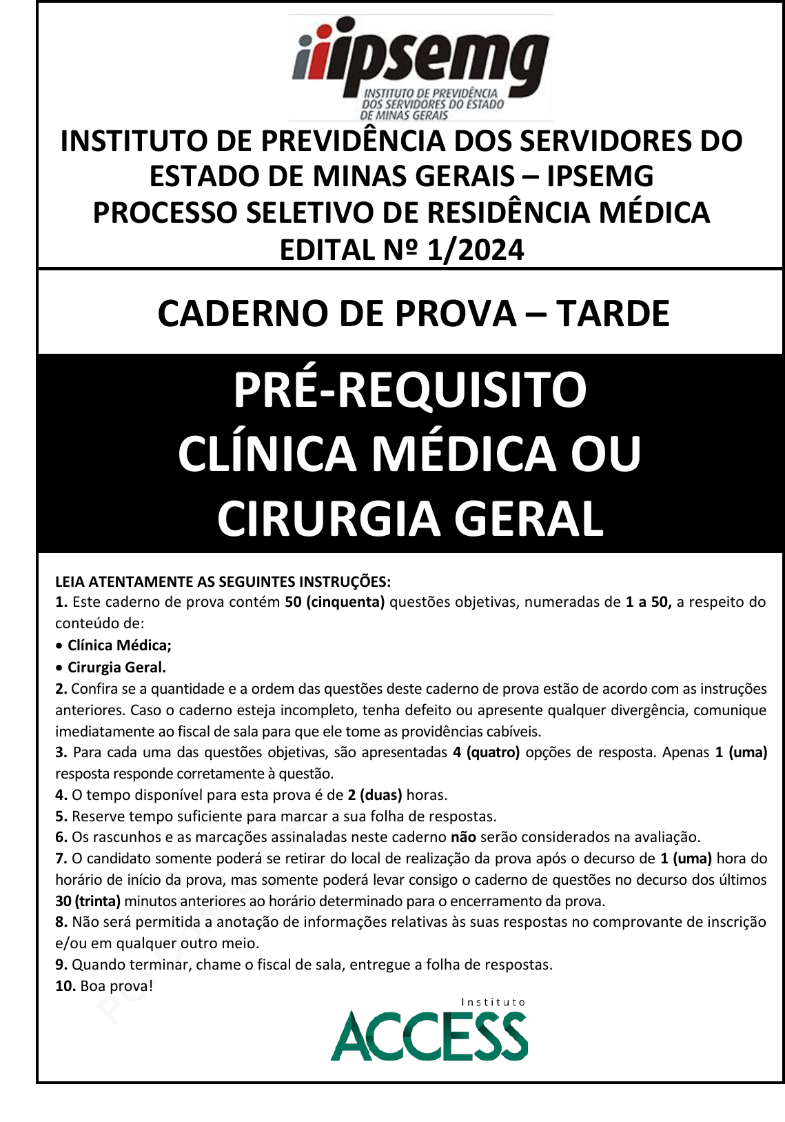 pcimarkpci MDAwMDowMDAwOjAwMDA6MDAwMDowMDAwOmZmZmY6YmIyNTo0YzA0:U2F0LCAzMSBNYXkgMjAyNSAxMzozODoyOCAtMDMwMA== www.pciconcursos.com.br INSTITUTO DE PREVIDÊNCIA DOS SERVIDORES DO ESTADO DE MINAS GERAIS – IPSEMG PROCESSO SELETIVO DE RESIDÊNCIA MÉDICA EDITAL Nº 1/2024 CADERNO DE PROVA – TARDE PRÉ-REQUISITO CLÍNICA MÉDICA OU CIRURGIA GERAL LEIA ATENTAMENTE AS SEGUINTES INSTRUÇÕES: 1. Este caderno de prova contém 50 (cinquenta) questões objetivas, numeradas de 1 a 50, a respeito do conteúdo de: • Clínica Médica; • Cirurgia Geral. 2. Confira se a quantidade e a ordem das questões deste caderno de prova estão de acordo com as instruções anteriores. Caso o caderno esteja incompleto, tenha defeito ou apresente qualquer divergência, comunique imediatamente ao fiscal de sala para que ele tome as providências cabíveis. 3. Para cada uma das questões objetivas, são apresentadas 4 (quatro) opções de resposta. Apenas 1 (uma) resposta responde corretamente à questão. 4. O tempo disponível para esta prova é de 2 (duas) horas. 5. Reserve tempo suficiente para marcar a sua folha de respostas. 6. Os rascunhos e as marcações assinaladas neste caderno não serão considerados na avaliação. 7. O candidato somente poderá se retirar do local de realização da prova após o decurso de 1 (uma) hora do horário de início da prova, mas somente poderá levar consigo o caderno de questões no decurso dos últimos 30 (trinta) minutos anteriores ao horário determinado para o encerramento da prova. 8. Não será permitida a anotação de informações relativas às suas respostas no comprovante de inscrição e/ou em qualquer outro meio. 9. Quando terminar, chame o fiscal de sala, entregue a folha de respostas. 10. Boa prova! pcimarkpci MDAwMDowMDAwOjAwMDA6MDAwMDowMDAwOmZmZmY6YmIyNTo0YzA0:U2F0LCAzMSBNYXkgMjAyNSAxMzozODoyOCAtMDMwMA== www.pciconcursos.com.br pcimarkpci MDAwMDowMDAwOjAwMDA6MDAwMDowMDAwOmZmZmY6YmIyNTo0YzA0:U2F0LCAzMSBNYXkgMjAyNSAxMzozODoyOCAtMDMwMA== www.pciconcursos.com.br PROCESSO SELETIVO DE RESIDÊNCIA MÉDICA – INSTITUTO DE PREVIDÊNCIA DOS SERVIDORES DO ESTADO DE MINAS GERAIS – IPSEMG PRÉ-REQUISITO CLÍNICA MÉDICA OU CIRURGIA GERAL (TARDE) Página 3 CLÍNICA MÉDICA Questão 1 Paciente de 63 anos com histórico de diabetes mellitus tipo 2 é admitido com quadro de dor precordial associada a sudo- rese e náuseas. ECG revela infradesnível de ST em derivações anteriores. Qual é a conduta inicial mais indicada? (A) Administração de nitroglicerina sublingual. (B) Realização de cateterismo cardíaco imediato. (C) Anticoagulação e terapia antiplaquetária. (D) Início de corticoides intravenosos. Questão 2 Homem de 57 anos, hipertenso, apresenta cefaleia súbita e in- tensa acompanhada de náuseas. Ao exame físico, encontra-se com pressão arterial de 180/110 mmHg e rigidez de nuca. O exame mais adequado para o diagnóstico inicial é: (A) Ressonância magnética do crânio. (B) Tomografia computadorizada de crânio sem contraste. (C) Punção lombar. (D) Ultrassonografia doppler de vasos intracranianos. Questão 3 Paciente de 56 anos apresenta perda de peso, tosse produ- tiva e sudorese noturna há dois meses. O exame de imagem revela infiltrado pulmonar em lobo superior direito. O pró- ximo passo diagnóstico é: (A) Tomografia computadorizada de tórax. (B) Prova tuberculínica (PPD). (C) Baciloscopia de escarro. (D) Teste sorológico para HIV. Questão 4 Homem de 45 anos é admitido com história de etilismo crônico e icterícia. Apresenta distensão abdominal e edema de membros inferiores. O exame físico revela circulação colateral abdominal e hepatoesplenomegalia. O exame mais indicado para confirmar a etiologia e gravidade da doença hepática é: (A) Ressonância magnética de abdome. (B) Biópsia hepática. (C) Elastografia hepática. (D) Ultrassonografia com doppler de abdome. Questão 5 Mulher de 30 anos, previamente saudável, apresenta quadro súbito de dor torácica pleurítica e dispneia. No exame físico, observa-se taquipneia e diminuição de murmúrio vesicular em hemitórax direito. O diagnóstico mais provável e o exame de imagem inicial são: (A) Pneumonia; radiografia de tórax. (B) Pneumotórax; tomografia computadorizada de tórax. (C) Pneumotórax; radiografia de tórax. (D) Derrame pleural; ultrassonografia de tórax. Questão 6 Homem de 60 anos, com história de hipertensão e dia- betes, é admitido com quadro de tontura e fraqueza mus- cular progressiva. Exames laboratoriais revelam hipoca- lemia importante. A condição mais provável que justifica o quadro é: (A) Hipoparatireoidismo. (B) Síndrome de Cushing. (C) Feocromocitoma. (D) Doença de Addison. Questão 7 Mulher de 38 anos apresenta queixa de poliúria, polidipsia e perda de peso. Exames laboratoriais revelam glicemia de jejum de 250 mg/dL e HbA1c de 9%. Qual é a orientação inicial mais indicada? (A) Início de metformina e acompanhamento ambulatorial. (B) Insulinoterapia e controle rigoroso de glicemia. (C) Dieta hipoglicídica e observação. (D) Aumento da ingestão hídrica e restrição de sódio. Questão 8 Paciente de 60 anos com DPOC apresenta episódios de exacerbação com tosse e secreção purulenta. O exame laboratorial confirma aumento de leucócitos e PCR ele- vado. O antibiótico de escolha para este paciente é: (A) Amoxicilina. (B) Ceftriaxona. (C) Ciprofloxacina. (D) Azitromicina. Questão 9 Homem de 45 anos é atendido com quadro de fraqueza muscular progressiva e ptose palpebral bilateral. Exame de eletroneuromiografia sugere bloqueio de transmissão neu- romuscular. O diagnóstico mais provável é: (A) Síndrome de Guillain-Barré. (B) Miastenia gravis. (C) Esclerose lateral amiotrófica. (D) Polineuropatia desmielinizante. Questão 10 Homem de 28 anos é admitido com quadro de febre, dor abdominal e diarreia sanguinolenta. Exame endoscópico revela inflamação contínua do cólon. O diagnóstico mais provável é: (A) Doença