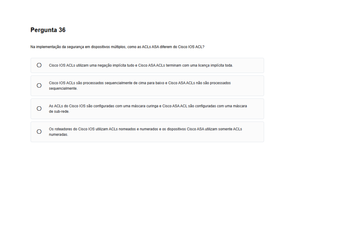 Pergunta 36 Na implementação da segurança em dispositivos como as ACLs ASA diferem do Cisco IOS ACL? Cisco IOS ACLs utilizam uma negação tudo e Cisco ASA ACLs terminam com uma licença toda. Cisco IOS ACLs são processados sequencialmente de cima para baixo e Cisco ASA ACLs não são processados sequencialmente. As ACLs do Cisco IOS são configuradas com uma máscara curinga e Cisco são configuradas com uma máscara de Os roteadores do Cisco IOS utilizam ACLs nomeados e numerados e os dispositivos Cisco ASA utilizam somente ACLs