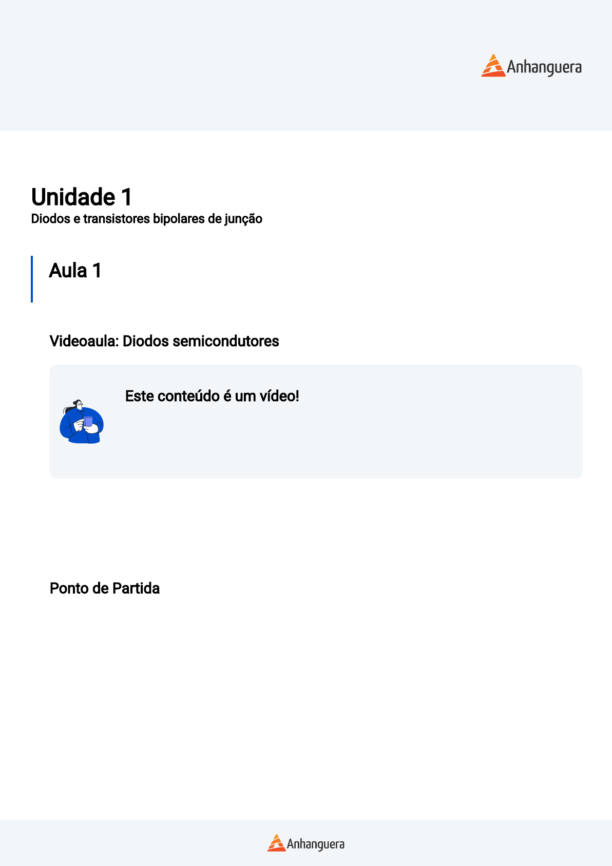 Disciplina ELETRÔNICA ANALÓGICA E INDUSTRIAL Unidade 1 Diodos e transistores bipolares de junção Aula 1 Diodos Semicondutores Videoaula: Diodos semicondutores Este conteúdo é um vídeo! Para assistir este conteúdo é necessário que você acesse o AVA pelo computador ou pelo aplicativo. Você pode baixar os vídeos direto no aplicativo para assistir mesmo sem conexão à internet. Você verá agora um vídeo resumo com os principais conceitos estudados na aula: o que são semicondutores e como esses semicondutores unidos formam o diodo; curvas características dos diodos; um detalhamento maior sobre o diodo zener; e as informações importantes de uma folha de dados. Ponto de Partida Olá, estudante! Nesta aula, conheceremos o mais simples dos dispositivos semicondutores, o diodo. Os diodos são utilizados amplamente em diversos equipamentos e circuitos eletrônicos e, por isso, é importante que qualquer pro�ssional do ramo da eletrônica esteja familiarizado com ele. Para entender como os diodos (assim como os transistores, que serão objeto de estudo mais à frente) funcionam, você precisa conhecer os materiais denominados semicondutores, já que suas propriedades contribuíram muito para que a eletrônica tenha avançado ao longo dos anos. Por exemplo, você sabia que o LED é um diodo? Dentre essa e outras aplicações, o diodo pode ser visto sendo aplicado, por exemplo, em carregadores de bateria de celular, atuando na conversão da Disciplina ELETRÔNICA ANALÓGICA E INDUSTRIAL corrente alternada para corrente contínua. Então, é devido a sua importância que, ao longo desta aula, vamos nos aprofundar nesse incrível dispositivo. Vamos Começar! Conceituando os diodos semicondutores No ensino médio, você sem dúvida estudou em química a chamada unidade básica da matéria, o átomo. É a partir dela que começamos o nosso estudo sobre os materiais semicondutores. Na representação do átomo de cobre, visto na Figura 1, é possível identi�car a existência de apenas um elétron na sua última camada (camada de valência), levando em consideração a regra do octeto teorizada por Gilbert Newton Lewis (1875 – 1946), a qual postula que os átomos com oito elétrons em sua camada de valência atingem a estabilidade química. Aprendemos, no estudo da química, que, quando isso não ocorre, os átomos buscam essa estabilidade por meio das ligações químicas compartilhando elétrons livres com outros átomos. Figura 1 | Átomo de cobre. - Fonte: adaptada pelo autor a partir de Schuler (2013, p. 26). Quadro 1 | De�nição de materiais condutores e isolantes Os elétrons livres são aqueles que estão sob a atuação pouca intensa da força eletrostática de atração do núcleo do átomo; assim, chamamos de materiais Disciplina ELETRÔNICA ANALÓGICA E INDUSTRIAL condutores aqueles que possibilitam a movimentação de elétrons facilmente em seu interior. Esses elétrons livres podem ser conduzidos quando é aplicada uma diferença de potencial. Por outro lado, chamamos de materiais isolantes aqueles formados por átomos cujos elétrons da camada de valência estão fortemente sob a atuação da força eletrostática de atração do núcleo do átomo. Portanto, há pouquíssimos elétrons livres; mesmo com a ação de uma diferença de potencial, não há condução. Fonte: elaborado pelo autor. Assim, segundo Boylestad (2013), materiais semicondutores são uma classe especial de elementos cuja condutividade está entre a de um bom condutor e a de um isolante. No entanto, apenas após o processo denominado dopagem (por meio do qual são adicionados outros materiais, chamados de “impurezas”), esses semicondutores poderão ser utilizados na construção de diodos, transistores, etc. A partir da dopagem, os semicondutores podem assumir duas formas distintas, denominadas semicondutores tipo p e semicondutores tipo n. O seu uso mais básico é a construção de diodos: um material tipo p é posicionado de um lado, e outro tipo n do outro lado, conforme mostra a Figura 2. Figura 2 | Semicondutores tipo p e tipo n (a). Junção pn demonstrando a criação de íons (b). - Fonte: adaptada pelo autor a partir de Malvino e Bates (2016, pp. 38-39). Segundo Malvino e Bates (2016), a junção é a borda onde as regiões do tipo p e do tipo n se encontram, e o diodo de junção é outro nome dado para um cristal pn. A palavra diodo é uma Disciplina ELETRÔNICA ANALÓGICA E INDUSTRIAL contração de “dois eletrodos”; di signi�ca “dois”. Uma vez que o diodo formado é um cristal inteiriço, os elétrons livres movem-se através da junção. Alguns destes elétrons livres atravessam a junção, preenchendo algumas lacunas do cristal. Isso resulta em uma região denominada camada de depleção, como pode ser visto na Figura 3. Figura 3 | Camada de depleção do diodo. - Fonte: Schuler (2013 p. 42). O diodo é um dispositivo com dois terminais, projetado para operar conduzindo corrente em apenas um sentido, do terminal denominado anodo (+) para o outro terminal denominado catodo (-). É diferente de um resistor, que conduz a corrente em qualquer sentido. Chamamos diodo ideal aquele que, quando submetido a uma polarização direta (do anodo para o catodo) age como um condutor perfeito, com tensão igual a zero através dele. Consequentemente, quando o diodo é invertido, ele age como um isolante perfeito, sem passagem de corrente. No entanto, o diodo ideal é apenas teórico, ou seja, ele não é real. O diodo real, diferentemente do ideal, possui uma barreira de potencial, uma região onde um máximo de potencial impede uma partícula carregada eletricamente de atravessar de um lado para o outro. Para diodos de silício, a condução se dá a partir de uma tensão de 0,7 volts; para diodos de germânio, 0,3 volts; considerando a temperatura ambiente (25ºC). Dentre os tipos diferentes de diodos e suas diversas aplicações em circuitos eletrônicos, alguns dos mais impo