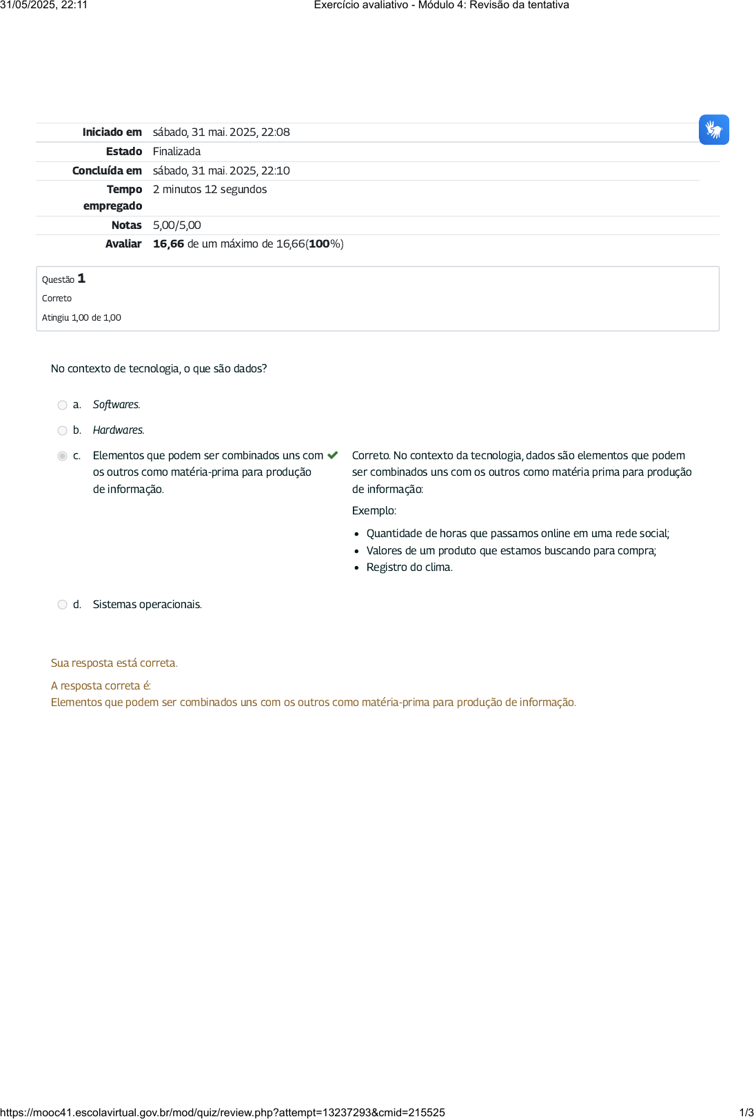 Iniciado em sábado, 31 mai. 2025, 22:08 Estado Finalizada Concluída em sábado, 31 mai. 2025, 22:10 Tempo empregado 2 minutos 12 segundos Notas 5,00/5,00 Avaliar 16,66 de um máximo de 16,66(100%) Questão 1 Correto Atingiu 1,00 de 1,00 No contexto de tecnologia, o que são dados? a. Softwares. b. Hardwares. c. Elementos que podem ser combinados uns com os outros como matéria-prima para produção de informação. Correto. No contexto da tecnologia, dados são elementos que podem ser combinados uns com os outros como matéria prima para produção de informação: Exemplo: Quantidade de horas que passamos online em uma rede social; Valores de um produto que estamos buscando para compra; Registro do clima. d. Sistemas operacionais. Sua resposta está correta. A resposta correta é: Elementos que podem ser combinados uns com os outros como matéria-prima para produção de informação. 31/05/2025, 22:11 Exercício avaliativo - Módulo 4: Revisão da tentativa https://mooc41.escolavirtual.gov.br/mod/quiz/review.php?attempt=13237293&cmid=215525 1/3 Questão 2 Correto Atingiu 1,00 de 1,00 Questão 3 Correto Atingiu 1,00 de 1,00 Indique uma circunstância de vazamento de dados: a. Um colaborador acessou informações restritas apenas com autorização e seguindo as políticas de segurança. b. Um hacker coletou informações pessoais de clientes de um banco, sem permissão, e as divulgou on-line. Correto. O vazamento de dados é quando informações confidenciais ou privadas de uma pessoa, empresa ou organização são acidentalmente ou intencionalmente expostas ao público ou a pessoas não autorizadas. c. Um sistema de backup foi ativado automaticamente para restaurar dados após uma falha de servidor. d. Um usuário alterou sua senha de forma segura após um aviso de política de segurança da empresa. Sua resposta está correta. A resposta correta é: Um hacker coletou informações pessoais de clientes de um banco, sem permissão, e as divulgou on-line. É um dos riscos de quando misturamos dados corporativos com dados pessoais: a. Phishing. Correto. Clicando em um link contaminado por um phishing você pode contaminar seu email pessoal e corporativo. b. Ter uma conta separada. c. Ter um perfil separado para o trabalho. d. Alertas e notificações. Sua resposta está correta. A resposta correta é: Phishing. 31/05/2025, 22:11 Exercício avaliativo - Módulo 4: Revisão da tentativa https://mooc41.escolavirtual.gov.br/mod/quiz/review.php?attempt=13237293&cmid=215525 2/3 Questão 4 Correto Atingiu 1,00 de 1,00 Questão 5 Correto Atingiu 1,00 de 1,00 Ao criar um login de acesso, como evitar uma senha preguiçosa (fraca)? a. Usar palavras não encontradas em dicionário e combinar números aleatórios, sem sequência ou significado pessoal. Correto. Recomenda-se criar senhas fortes, que não sejam palavras encontradas em dicionário e que não possuam uma sequência de número previsíveis. Para números, evitar sequências ou aqueles que possuam relação direta com você, como sua data de aniversário ou placa de seu carro. b. Criar senha com uma data de nascimento conhecida do usuário. c. Criar senha com nomes de familiares. d. Ter a mesma senha para várias contas. Sua resposta está correta. A resposta correta é: Usar palavras não encontradas em dicionário e combinar números aleatórios, sem sequência ou significado pessoal. É uma consequência quando acontece um vazamento de dados em uma empresa: a. Perda de confiança de clientes ou usuários. Correto. Uma das principais consequências quando acontecem vazamentos de dados em uma empresa é a perda de confiança dos clientes ou usuário podendo até mesmo prejudicar a imagem da instituição. b. Consciência de segurança da informação. c. Atualizações e Patches. d. Firewall e Antivírus. Sua resposta está correta. A resposta correta é: Perda de confiança de clientes ou usuários. ◄ Conteúdo do módulo 4 Seguir para... Conteúdo do módulo 5 ► 31/05/2025, 22:11 Exercício avaliativo - Módulo 4: Revisão da tentativa https://mooc41.escolavirtual.gov.br/mod/quiz/review.php?attempt=13237293&cmid=215525 3/3 https://mooc41.escolavirtual.gov.br/mod/url/view.php?id=215524&forceview=1 https://mooc41.escolavirtual.gov.br/mod/url/view.php?id=215526&forceview=1