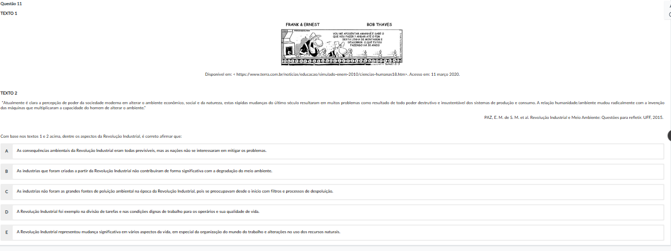 Questão 11 TEXTO 1 FRANK ERNEST BOB THAVES you ME APOSENTAR AMANHA Disponível em: 11 março TEXTO 2 "Atualmente clara percepção de da sociedade moderna em alterar ambiente social natureza estas rápidas mudanças do último século resultaram em muitos problemas como resultado de todo poder destrutivo c insustentável dos sistemas de produção A relação mudou radicalmente com a invenção das máquinas que multiplicaram a capacidade do homem de alterar ambiente." E.M. de et al. Revolução Industrial Questões para 2015. Com base nos textos 1 2 acima, aspectos da Revolução Industrial é correto afirmar que: A As consequências ambientais da Revolução Industrial eram todas mas as nações não se interessaram em mitigar B As industrias que foram criadas partir da Revolução Industrial não contribuiram de forma significativa com a degradação do meio As industrias não foram as grandes fontes de poluição ambiental na época da Revolução pois se preocupavam desde com filtros processos de despoluição. D A Revolução Industrial foi exemplo na divisão de tarefas nas condições dignas de trabalho para os operários sua qualidade de E A Revolução Industrial representou mudança significativa em vários aspectos da em especial da organização do mundo do trabalho alterações no uso dos recursos