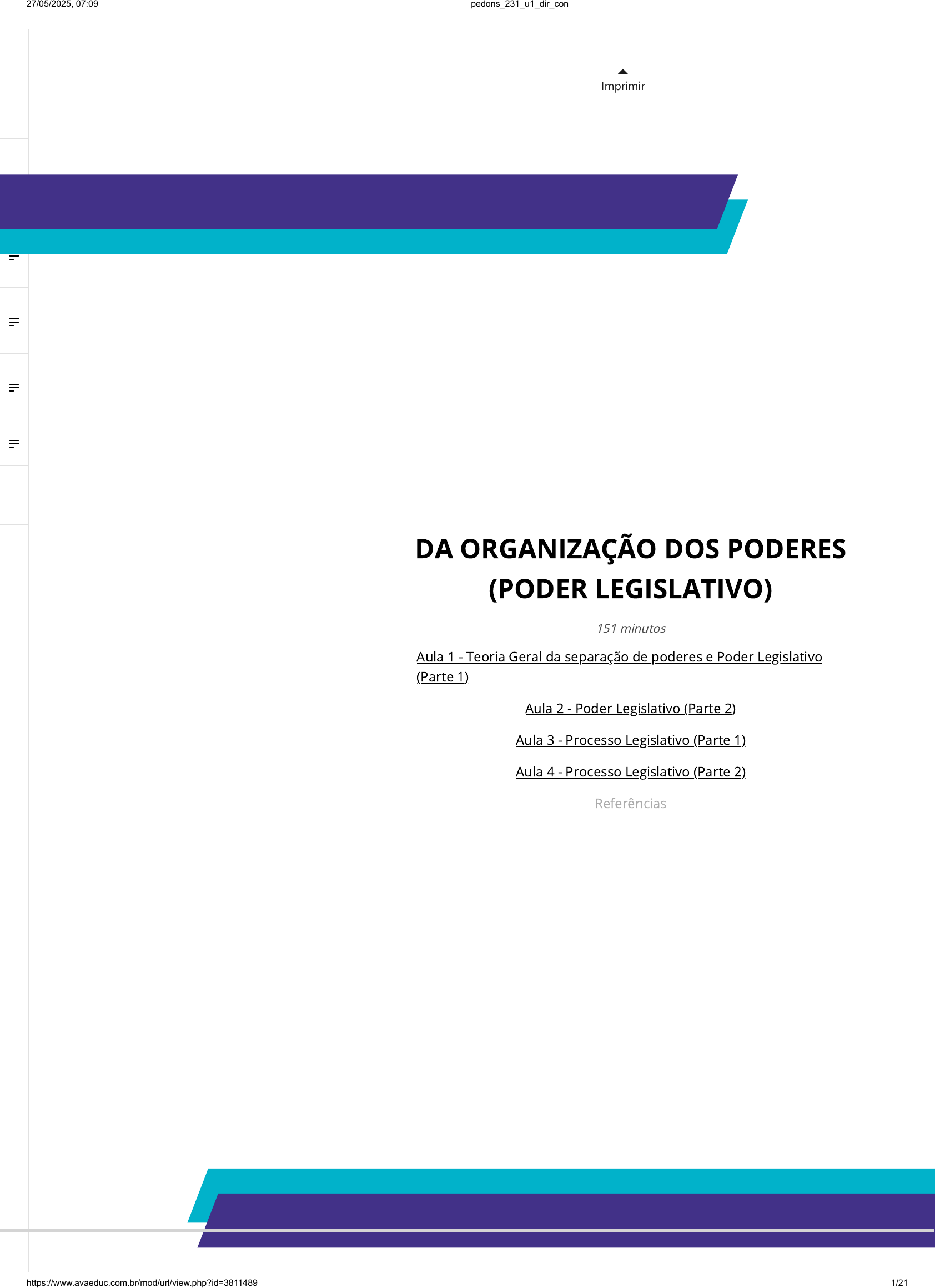 Imprimir DA ORGANIZAÇÃO DOS PODERES (PODER LEGISLATIVO) 151 minutos Aula 1 - Teoria Geral da separação de poderes e Poder Legislativo (Parte 1) Aula 2 - Poder Legislativo (Parte 2) Aula 3 - Processo Legislativo (Parte 1) Aula 4 - Processo Legislativo (Parte 2) Referências 27/05/2025, 07:09 pedons_231_u1_dir_con https://www.avaeduc.com.br/mod/url/view.php?id=3811489 1/21 INTRODUÇÃO Nesta aula, vamos aprender sobre o Poder Legislativo e sua organização. O Poder Legislativo, de acordo com a Constituição da República, tem como função legislar, isto é, elaborar leis e fiscalizar os atos do Poder Executivo. O Congresso Nacional, que representa o Poder Legislativo em âmbito federal, é dividido em duas casas: o Senado e a Câmara dos Deputados. Já o Poder Legislativo, em cada Estado da Federação é exercido nas Assembleias Legislativas. Na vida profissional, você utilizará os conhecimentos aprendidos nesta aula para a prática do Direito Constitucional. Ainda, você irá adquirir um conhecimento mais profundo sobre o sistema de elaboração de leis e sobre a relevância dos senadores e deputados para o Estado Democrático de Direito. COMO SE ESTRUTURA O PODER LEGISLATIVO? A estrutura dos Poderes da República, no Brasil, é promovida por meio da clássica tripartição de Poderes. Nessa, coexistem três Poderes, sendo eles o Poder Executivo, o Legislativo e o Judiciário, independentes e harmônicos entre si (artigo 2º da CRFB/88), cumprindo cada um deles funções típicas e atípicas, bem como controlando a ação dos seus pares em dinâmica de freios e contrapesos. Assim, a partir do limite das suas competências constitucionais e das suas funções típicas e atípicas, limita-se o poder de cada um deles, de modo a garantir o não domínio de qualquer um sobre o outro. As principais funções do Poder Legislativo consistem em legislar e fiscalizar as atividades dos demais Poderes, sendo essas suas funções típicas. Mas, para além dessas tarefas, ele também exerce funções de administração do próprio poder (executar – usualmente típica ao Poder Executivo) e de julgamento em casos de crimes de responsabilidade (julgar – usualmente típico ao Poder Judiciário), sendo essas suas funções atípicas. O Poder Legislativo funciona por meio do Congresso Nacional, que é bicameral, sendo composto pelo Senado Federal e pela Câmara dos Deputados, de acordo com o artigo 44 da CRFB/88. Trata-se de estrutura de câmara alta, com o Senado, e câmara baixa, com a Câmara. O Poder Legislativo é composto por parlamentares: no nível federal, por senadores e deputados; no estadual, Aula 1 TEORIA GERAL DA SEPARAÇÃO DE PODERES E PODER LEGISLATIVO (PARTE 1) O Poder Legislativo, de acordo com a Constituição da República, tem como função legislar, isto é, elaborar leis e fiscalizar os atos do Poder Executivo. 35 minutos 27/05/2025, 07:09 pedons_231_u1_dir_con https://www.avaeduc.com.br/mod/url/view.php?id=3811489 2/21 por deputados estaduais; e no municipal, pelos vereadores. No exercício de seus mandatos, os parlamentares estão submetidos a um conjunto de prerrogativas que têm como objetivo garantir a sua independência e o livre desempenho de seu mandato. Essas prerrogativas consistem nas imunidades materiais (que impedem o parlamentar de ser punido por determinados fatos) e processuais (que se referem à possibilidade de o parlamentar não ser preso, não permanecer preso, ou de sustar-se o processo penal contra ele, segundo o artigo 53, §§2º a 5º, da CRFB/88). O Senado representa os interesses dos estados-membros no Congresso Nacional, sendo composto por três representantes de cada estado-membro e do Distrito Federal, que são eleitos pelo sistema majoritário, para mandatos de oito anos. A Câmara dos Deputados representa os interesses da população no Congresso Nacional, sendo assim, em cada estado-membro e no Distrito Federal é eleito, por eleições proporcionais, para mandatos de quatro anos, um número de deputados federais proporcional ao da população local, respeitado o mínimo de oito e o máximo de setenta deputados por estado, de acordo com o artigo 4º da CRFB/88. A Câmara dos Deputados e o Senado Federal realizam suas funções por meio de sessões, que são as reuniões de seus membros. Ou seja, Os trabalhos legislativos são desenvolvidos em encontros no âmbito dos respectivos órgãos. Nestes encontros, os deputados ou senadores podem deliberar sobre projetos de lei, apresentar novos projetos, realizar debates, pronunciamentos, comunicações, ou mesmo realizar comemorações ou homenagens. Também ocorrem sessões conjuntas da Câmara e do Senado, ou seja, reuniões do Congresso Nacional como um todo. As que não tiverem data previamente estabelecida serão convocadas pelo Presidente do Senado, com prévia audiência da Mesa da Câmara. As sessões pré-datadas são as de posse do Presidente e do Vice-Presidente da República e a destinada a abrir os trabalhos da sessão legislativa ordinária. COMO FUNCIONA O PODER LEGISLATIVO? Como vimos, no Brasil há uma tripartição de poderes. Existem os poderes Executivo, Legislativo e Judiciário, independentes e harmônicos entre si. A independência dos poderes pode ser analisada a partir de uma perspectiva tríplice. Em primeiro lugar, como garantia de que a investidura e a permanência de qualquer pessoa em um dos órgãos ocorrem independentemente da vontade dos outros. Segundo, que não há necessidade de consulta ou autorização prévia aos demais órgãos quando os titulares das atribuições estejam exercendo-as. E, terceiro, que na organização das respectivas atividades, cada um é livre para fazê-lo, devendo apenas observar sempre o que está prescrito na Constituição ou em lei específica (SILVA, 2013). Tendo em vista que, no atual ordenamento constitucional brasileiro, a separação dos poderes é uma cláusula pétrea, disposta expressamente no artigo 60, § 4º, inciso II