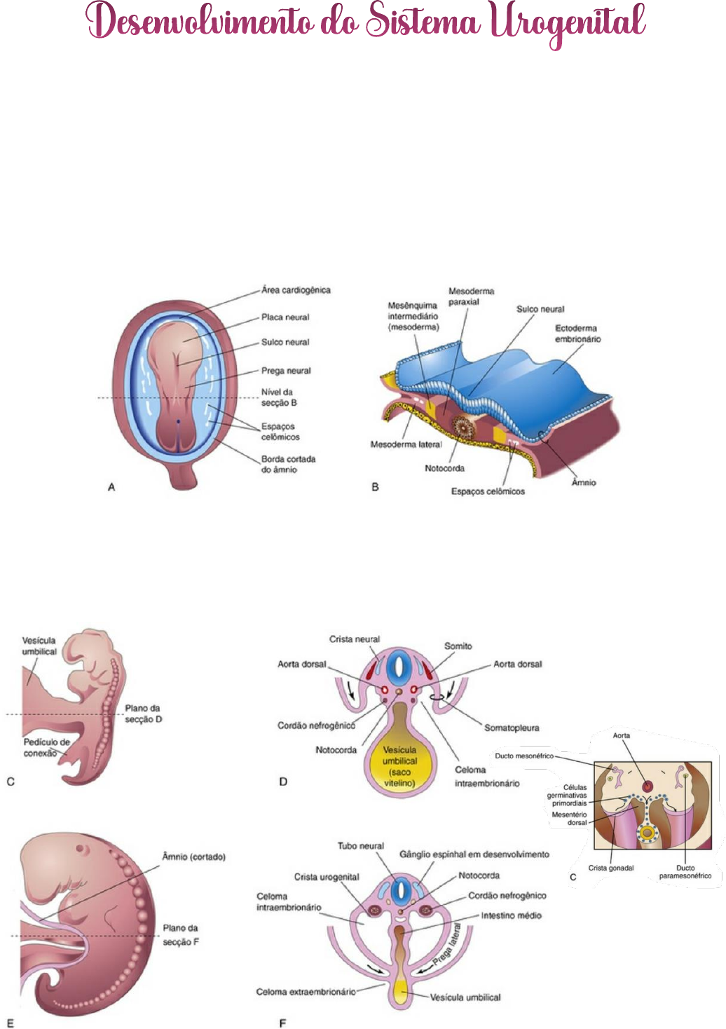 SCHEILA WILDNER EMBRIOLOGIA M3 – PR2 1 Desenvolvimento do Sistema Urogenital ✓ O sistema urogenital é dividido funcionalmente em duas partes embriologicamente diferentes: o sistema urinário e o sistema genital; entretanto, elas são estreitamente associadas. ✓ O sistema urogenital inclui todos os órgãos envolvidos na reprodução e na formação e eliminação da urina. ✓ Embriologicamente, os sistemas são intimamente associados, especialmente durante seus estádios iniciais de desenvolvimento. ✓ O sistema urogenital se desenvolve a partir do mesênquima (mesoderme) intermediário (tecido conjuntivo embrionário primordial que consiste em células mesenquimais) derivadas da parede corporal dorsal do embrião. O mesênquima é principalmente responsável pela formação do rim e da genitália interna e de seus ductos. ✓ Inicialmente, os ductos excretórios de ambos os sistemas entram em uma cavidade comum, a cloaca. ✓ Durante o dobramento do embrião no plano horizontal o mesênquima é movido ventralmente e perde sua conexão com os somitos (D). Uma elevação longitudinal do mesoderma, a crista urogenital, forma-se em cada lado da aorta dorsal (D e F). A parte da crista que dá origem ao sistema urinário é o cordão nefrogênico (D-F); a parte da crista que dá origem ao sistema genital é a crista gonadal. SCHEILA WILDNER EMBRIOLOGIA M3 – PR2 2 Desenvolvimento do Sistema Urinário DESENVOLVIMENTO DE RINS E URETERES ✓ Três conjuntos de rins sucessivos desenvolvem-se nos embriões. 1. O primeiro conjunto, os pronefros, é rudimentar. 2. O segundo conjunto, os mesonefros, funciona brevemente durante o período fetal inicial. 3. O terceiro conjunto, os metanefros, forma os rins permanentes. PRONEFRO Os pronefros são estruturas transitórias bilaterais que aparecem inicialmente na quarta semana. Eles são representados por algumas coleções de célu las e estruturas tubulares na região do pescoço em desenvolvimento. Eles se originam a partir de unidades excretórias vestigiais, os nefrótomos, que regridem antes que se formem outros mais caudais; Os ductos pronéfricos percorrem caudalmente e se abrem dentro da cloaca, a câmara dentro da qual o intestino posterior e o alantoide se esvaziavam. Os pronefros logo degeneram; no entanto, a maioria das partes dos ductos persiste e é usada pelo segundo conjunto de rins. SCHEILA WILDNER EMBRIOLOGIA M3 – PR2 3 MESONEFRO O mesonefro e os ductos mesonéfricos são derivados do mesoderma intermediário oriundo da região dos segmentos torácicos superiores até os lombares superiores (L3). Os mesonefros funcionam como rins temporários durante aproximadamente 4 semanas, até que os rins permanentes se desenvolvam e funcionem. No início da quarta semana durante a regressão do sistema pronéfrico, aparecem os primeiros túbulos excretores do mesonefro. Eles se alongam rapidamente, formam uma alça em feitio de “S” e envolvem o tufo de capilares que formará o glomérulo em sua extremidade medial. Ao redor do glomérulo, os túbulos formam a cápsula de Bowman, e, em conjunto, essas estruturas constituem o corpúsculo renal. Lateralmente, o túbulo desemboca no ducto coletor lateral, conhecido como ducto mesonéfrico ou wolffiano. Os rins mesonéfricos consistem em glomérulos (10-50 por rim) e túbulos mesonéfricos. Os túbulos se abrem para dentro de ductos mesonéfricos bilaterais, os quais eram originalmente os ductos pronéfricos. Os ductos mesonéfricos se abrem dentro da cloaca. Na metade do segundo mês, o mesonefro forma um grande órgão ovoide de cada lado da linha média. Pelo fato de a gônada em desenvolvimento se encontrar em seu lado medial, a crista formada por ambos os órgãos é conhecida como crista urogenital. Enquanto os túbulos caudais ainda estão se diferenciando, os túbulos craniais e os glomérulos apresentam alterações degenerativas; no final do segundo mês (12ª semana), a maioria deles desapareceu. No homem, alguns túbulos caudais e o ducto mesonéfrico persistem e participam na formação do sistema genital; nas mulheres, ao contrário, eles desaparecem. SCHEILA WILDNER EMBRIOLOGIA M3 – PR2 4 Desenvolvimento dos cálices e da pelve renal. A-C, A primeira bifurcação do botão uretérico forma a pelve renal, e a coalescência das quatro seguintes gerações de bifurcações produz os principais cálices. D, E, As próximas quatro gerações de bifurcações se Aglutinam para formar os cálices menores do sistema coletor renal. F, Brotos uretéricos continuam a bifurcar até a 32ª semana, produzindo 1 a 3 milhões de dutos coletores. SCHEILA WILDNER EMBRIOLOGIA M3 – PR2 5 SCHEILA WILDNER EMBRIOLOGIA M3 – PR2 6 METANEFRO Os metanefros, ou os primórdios dos rins permanentes, começam a se desenvolver na quinta semana e se tornam funcionais aproximadamente 4 semanas mais tarde. As unidades excretórias se desenvolvem a partir do mesoderma metanéfrico, semelhantemente à formação do sistema mesonéfrico A formação de urina continua durante toda a vida fetal; a urina é excretada para dentro da cavidade amniótica e forma um dos componentes do líquido amniótico. Os rins se desenvolvem a partir de duas fontes: 1) Broto uretérico (divertículo metanéfrico): ductos coletores dos rins se desenvolvem a partir dele. Dá origem ao ureter, à pelve renal, aos cálices maiores e menores e a aproximadamente 1 a 3 milhões de túbulos coletores. 2) Blastema metanefrogênico (massa metanéfrica de mesênquima). O broto uretérico é um divertículo (evaginação) do ducto mesonéfrico próximo da sua entrada na cloaca. O blastema metanefrogênico é derivado da parte caudal do cordão nefrogênico. À medida que o broto uretérico se alonga, ele penetra no blastema, uma massa de mesênquima metanéfrica. O pedículo do broto uretérico se torna o ureter. A parte cranial do broto sofre ramificação repetitiva, resultando na diferenciação do broto nos túbulos coletores. As qua