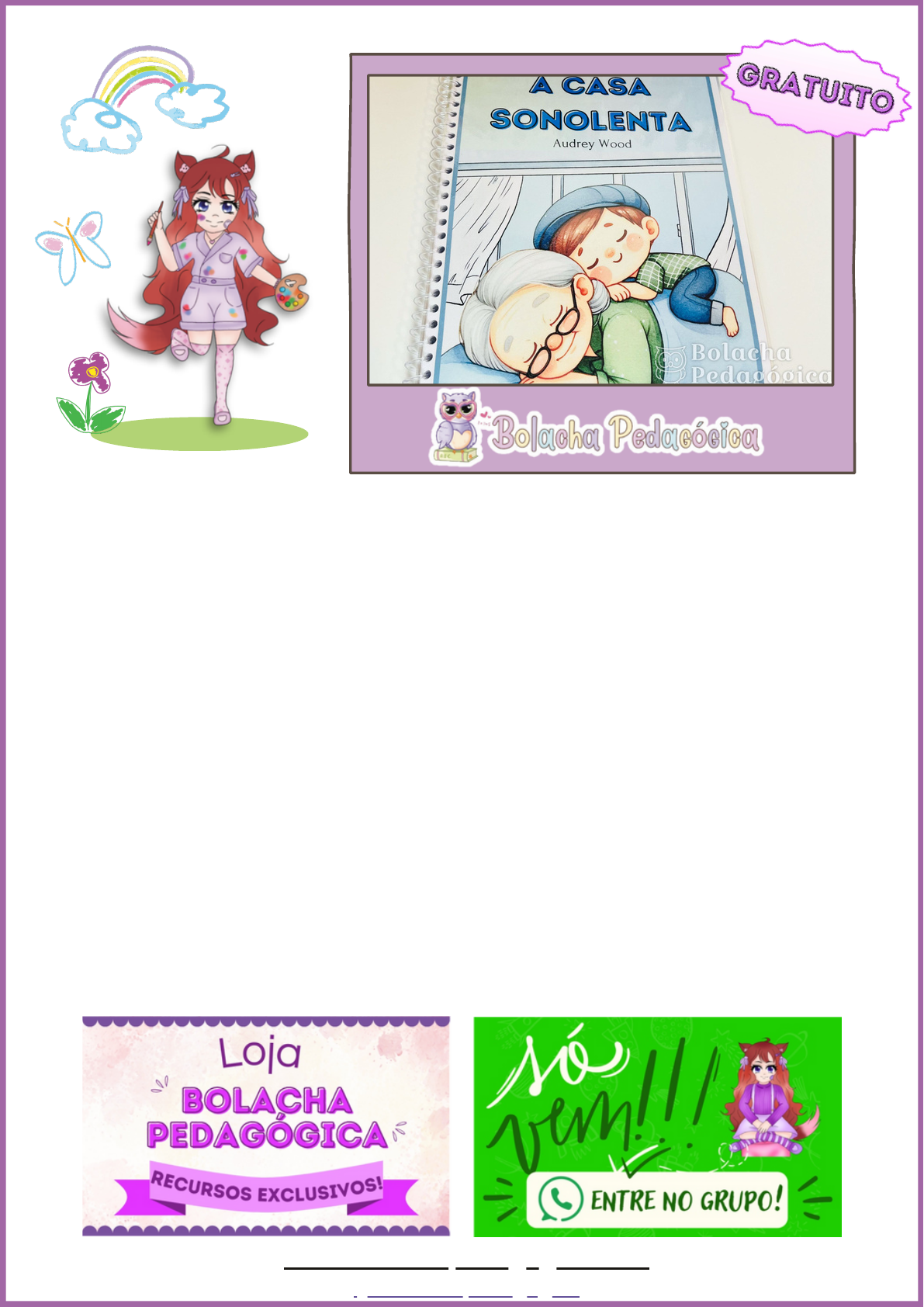 www.bolachapedagogica.com @bolacha_pedagogica Este arquivo é 100% GRATUITO e pode ser compartilhado à vontade. Pedimos que nos dê os créditos. É PROIBIDO A VENDA e qualquer alteração do arquivo. Clique na imagem para acessar A Casa Sonolenta Livro Interativo A história A Casa Sonolenta oferece uma excelente oportunidade para trabalhar a sequência narrativa, a contação oral e a escuta atenta, além de favorecer a ampliação do vocabulário e o reconhecimento de personagens e cenários. Por meio da leitura e recontagem da história, é possível explorar as habilidades da BNCC relacionadas à oralidade, leitura e interpretação de textos (como EI03EF04 e EF15LP05), promovendo também o desenvolvimento da criatividade e da expressão corporal em atividades de dramatização. Recorte as imagens e plastifique. as folhas pode plastificar ou utilizar aquelas bolsas plásticas para pasta arquivo, é mais econômico. Eu uso velcro para colar e retirar as imagens. http://www.bolachapedagogica.com/ https://bolachapedagogica.com/grupo-de-whatsapp/ https://lojabolachapedagogica.com/ http://www.bolachapedagogica.com/ https://www.instagram.com/bolacha_pedagogica/ A CASAA CASA SONOLENTASONOLENTA Audrey Wood ERA UMA VEZ UMA CASA SONOLENTA. ONDE TODOS VIVIAM DORMINDO. 11Bolacha PedagógicaBolacha Pedagógica NESSA CASA TINHA UMA CAMA, UMA CAMA ACONCHEGANTE, NUMA CASA SONOLENTA, ONDE TODOS VIVIAM DORMINDO. 22Bolacha PedagógicaBolacha Pedagógica NESSA CAMA TINHA UMA AVÓ, UMA AVÓ RONCANDO, NUMA CAMA ACONCHEGANTE, NUMA CASA SONOLENTA, ONDE TODOS VIVIAM DORMINDO. 33Bolacha PedagógicaBolacha Pedagógica EM CIMA DESSA AVÓ TINHA UM MENINO, UM MENINO SONHANDO, EM CIMA DE UMA AVÓ RONCANDO, NUMA CAMA ACONCHEGANTE, NUMA CASA SONOLENTA, ONDE TODOS VIVIAM DORMINDO. 44Bolacha PedagógicaBolacha Pedagógica EM CIMA DESSE MENINO TINHA UM CACHORRO, UM CACHORRO COCHILANDO, EM CIMA DE UM MENINO SONHANDO, EM CIMA DE UMA AVÓ RONCANDO, NUMA CAMA ACONCHEGANTE, NUMA CASA SONOLENTA, ONDE TODOS VIVIAM DORMINDO. 55Bolacha PedagógicaBolacha Pedagógica EM CIMA DESSE CACHORRO TINHA UM GATO, UM GATO RESSONANDO, EM CIMA DE UM CACHORRO COCHILANDO, EM CIMA DE UM MENINO SONHANDO, EM CIMA DE UMA AVÓ RONCANDO, NUMA CAMA ACONCHEGANTE, NUMA CASA SONOLENTA, ONDE TODOS VIVIAM DORMINDO. 66Bolacha PedagógicaBolacha Pedagógica EM CIMA DESSE GATO TINHA UM RATO, UM RATO DORMITANDO, EM CIMA DE UM GATO RESSONANDO, EM CIMA DE UM CACHORRO COCHILANDO, EM CIMA DE UM MENINO SONHANDO, EM CIMA DE UMA AVÓ RONCANDO, NUMA CAMA ACONCHEGANTE, NUMA CASA SONOLENTA, ONDE TODOS VIVIAM DORMINDO. 77Bolacha PedagógicaBolacha Pedagógica E EM CIMA DESSE RATO TINHA UMA PULGA... 88Bolacha PedagógicaBolacha Pedagógica SERÁ POSSÍVEL? UMA PULGA ACORDADA, EM CIMA DE UM RATO DORMITANDO, EM CIMA DE UM GATO RESSONANDO, EM CIMA DE UM CACHORRO COCHILANDO, EM CIMA DE UM MENINO SONHANDO, EM CIMA DE UMA AVÓ RONCANDO, NUMA CAMA ACONCHEGANTE, NUMA CASA SONOLENTA, ONDE TODOS VIVIAM DORMINDO. 99Bolacha PedagógicaBolacha Pedagógica UMA PULGA ACORDADA, QUE PICOU O RATO, 1010Bolacha PedagógicaBolacha Pedagógica QUE ASSUSTOU O GATO, 1111Bolacha PedagógicaBolacha Pedagógica 1212 QUE ARRANHOU O CACHORRO, Bolacha PedagógicaBolacha Pedagógica 1313 QUE CAIU SOBRE O MENINO, Bolacha PedagógicaBolacha Pedagógica 1414 QUE DEU UM SUSTO NA AVÓ, Bolacha PedagógicaBolacha Pedagógica QUE QUEBROU A CAMA, 1515Bolacha PedagógicaBolacha Pedagógica 1616 NUMA CASA SONOLENTA, ONDE NINGUÉM MAIS ESTAVA DORMINDO. Bolacha PedagógicaBolacha Pedagógica 11 A CASAA CASA SONOLENTASONOLENTA Audrey Wood 33Bolacha PedagógicaBolacha Pedagógica 33Bolacha PedagógicaBolacha Pedagógica Recomendamos Clique na imagem para acessar Conheça nossas outras redes www.bolachapedagogica.com @bolacha_pedagogica https://planejamentodeaulas.com.br/atividades/ https://planejamentodeaulas.com.br/ https://planejamentodeaulas.com.br/relatorios/ https://planejamentodeaulas.com.br/avaliacoes/ https://www.instagram.com/bolacha_pedagogica/ http://www.bolachapedagogica.com/ https://www.instagram.com/bolacha_pedagogica/ https://www.tiktok.com/@bolacha_pedagogica https://t.me/bolacha_pedagogica https://www.facebook.com/paginabolachapedagogica https://br.pinterest.com/bolacha_pedagogica/ https://www.youtube.com/c/BolachaPedag%C3%B3gica