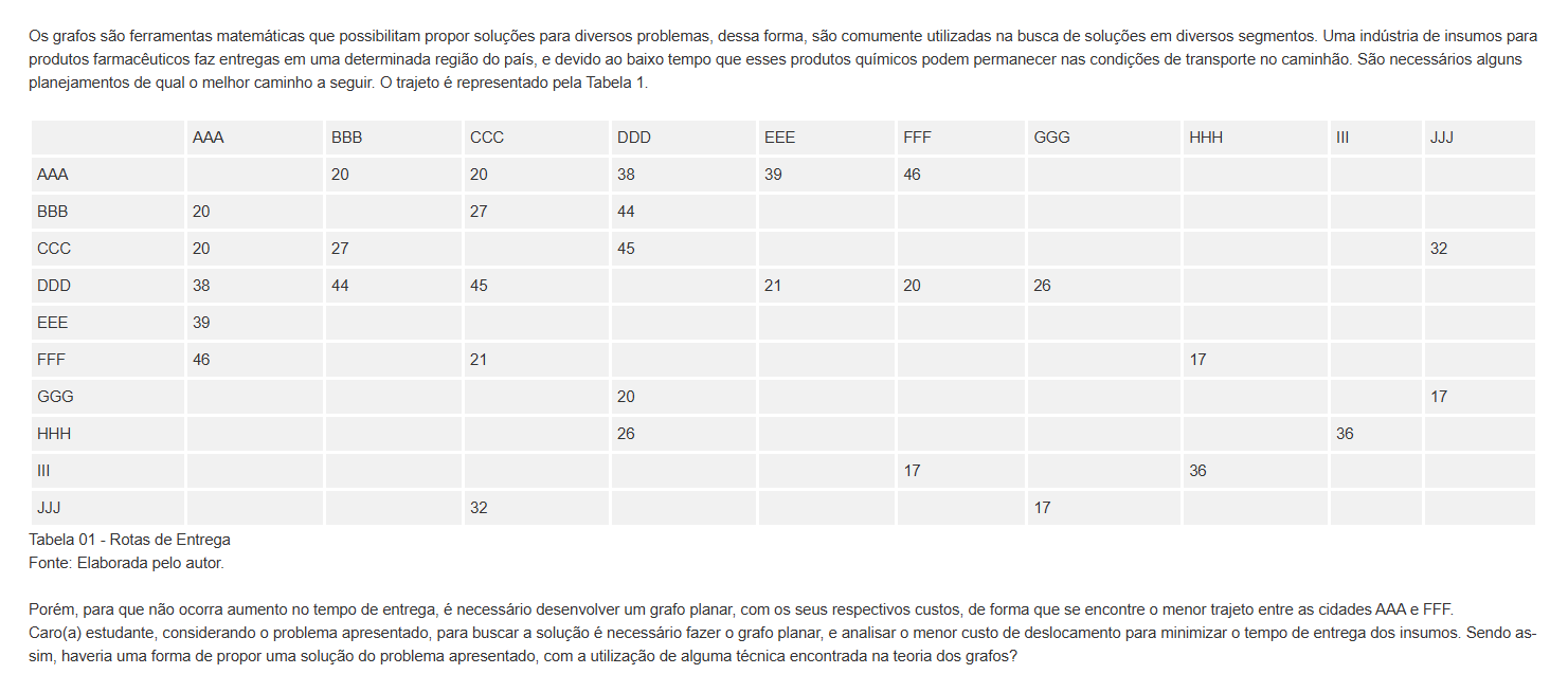 Os grafos são ferramentas matemáticas que possibilitam propor soluções para diversos problemas, dessa forma, são comumente utilizadas na busca de soluções em diversos segmentos. Uma indústria de insumos para produtos farmacêuticos faz entregas em uma determinada região do país, e devido ao baixo tempo que esses produtos químicos podem permanecer nas condições de transporte no São necessários alguns planejamentos de qual melhor caminho a seguir. trajeto é representado pela Tabela 1. AAA BBB CCC DDD EEE FFF GGG HHH III JJJ AAA 20 20 38 39 46 BBB 20 27 44 CCC 20 27 45 32 DDD 38 44 45 21 20 26 EEE 39 46 21 17 GGG 20 17 HHH 26 36 III 17 36 JJJ 32 17 Tabela 01 - Rotas de Entrega Fonte: Elaborada pelo autor. Porém, para que não ocorra aumento no tempo de entrega, é necessário desenvolver um grafo planar, com os seus respectivos custos, de forma que se encontre menor trajeto entre as cidades AAA e Caro(a) estudante, considerando o problema apresentado, para buscar a solução é necessário fazer o grafo planar, e analisar o menor custo de deslocamento para minimizar tempo de entrega dos insumos. Sendo as- sim, haveria uma forma de propor uma solução do problema apresentado, com a utilização de alguma técnica encontrada na teoria dos grafos?
