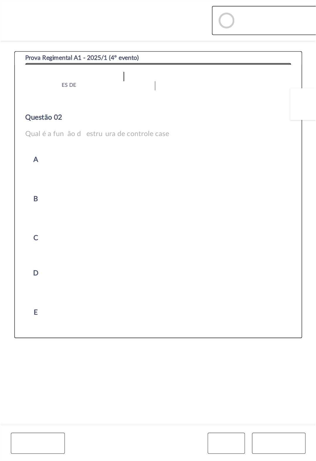 Prova Regimental A1 - 2025/1 (4º evento) Questão 02 Qual é a função da estrutura de controle case em Shell Script? A B C D E Curso: CST EM BANCO DE DADOS (61) Disciplina: REDES DE COMPUTADORES (1403); +1 Turma: Turma_005 (2078090_1403); +1 Iterar sobre uma lista de itens. Executar um bloco de código repetidamente enquanto uma condição for verdadeira. Forçar o término da iteração atual de um laço. Interromper a execução de um laço. Permitir a seleção de um bloco de código a ser executado com base em padrões que correspondem a uma variável ou expressão. BRUNO LUIZ COSTA DA SILVA 75_4439229003:52:43 BS Anterior 2/16 Próximo 01/06/2025, 18:58 AvaliA Online :: AvaliA Online https://graduacaocruzeirodosul.grupoa.education/avalia-online/ 1/1