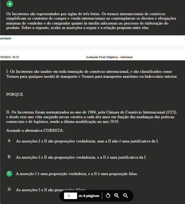 4 Os Incoterms são representados por siglas de três letras. Os termos internacionais de comércio simplificam os contratos de compra e venda internacionais ao contemplarem os direitos e obrigações mínimas do vendedor e do comprador quanto às tarefas adicionais ao processo de elaboração do produto. Sobre exposto, avalie as asserções a seguir e a relação proposta entre elas: but blank 10:31 Avaliação Final (Objetiva) - Individual I- Os Incoterms são usados em toda transação de comércio internacional, e são classificados como Termos para qualquer modal de transporte e Termos para transportes marítimo ou hidroviário interior. PORQUE Os Incoterms foram normatizados no ano de 1966, pela Câmara de Comércio Internacional (CCI), e desde esse ano vêm surgindo novas versões a cada dez anos em função das mudanças das práticas comerciais e de logística, sendo a última modificação no ano 2010. Assinale a alternativa CORRETA: A As asserções I e II são proposições verdadeiras, mas a II não é uma justificativa da I. B As asserções I e II são proposições verdadeiras, e a II é uma justificativa da I. C A asserção I é uma proposição verdadeira, e a II é uma proposição falsa. D As asserções I e II são 3 de 8 páginas