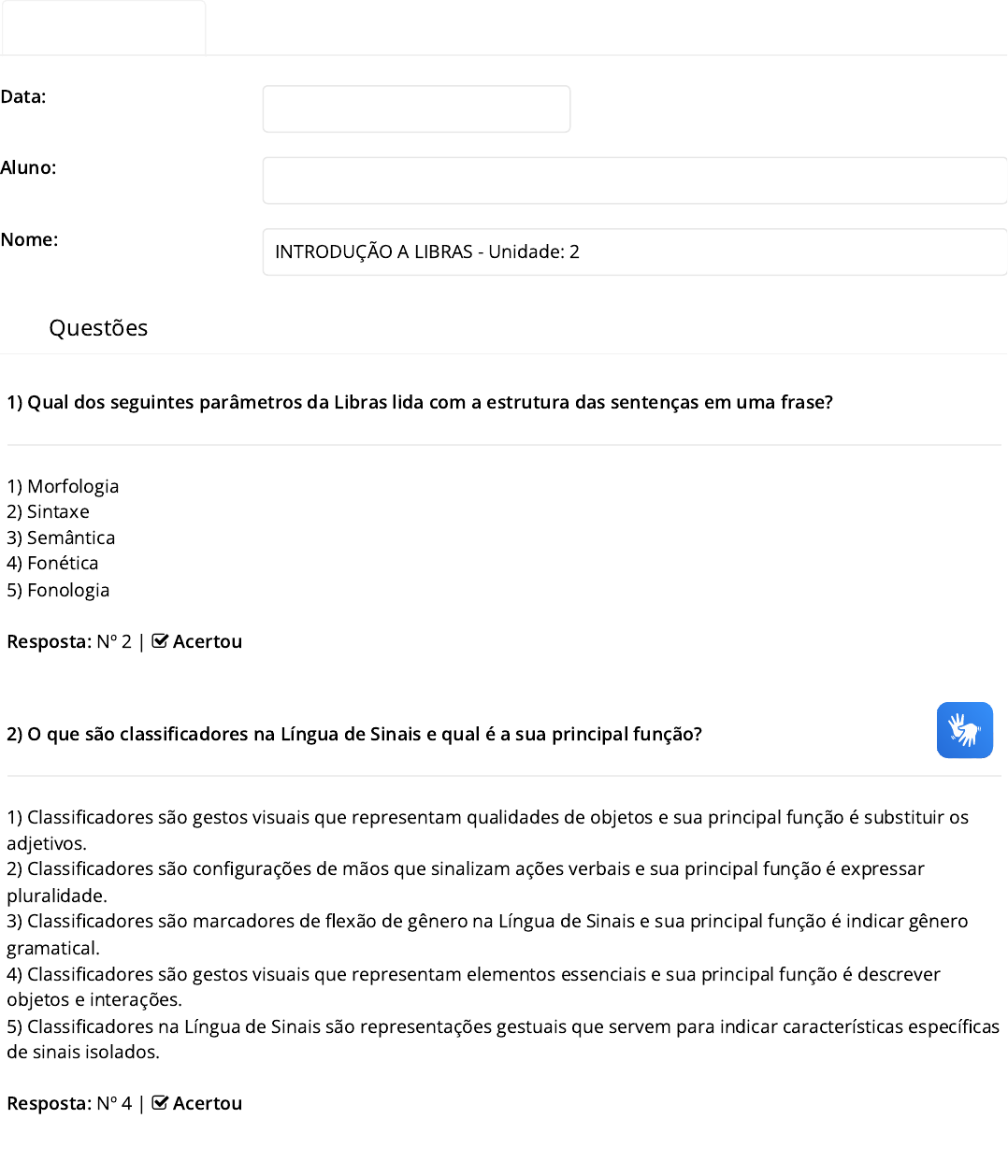 Questões 1) Qual dos seguintes parâmetros da Libras lida com a estrutura das sentenças em uma frase? 1) Morfologia 2) Sintaxe 3) Semântica 4) Fonética 5) Fonologia Resposta: Nº 2 | Acertou 2) O que são classificadores na Língua de Sinais e qual é a sua principal função? 1) Classificadores são gestos visuais que representam qualidades de objetos e sua principal função é substituir os adjetivos. 2) Classificadores são configurações de mãos que sinalizam ações verbais e sua principal função é expressar pluralidade. 3) Classificadores são marcadores de flexão de gênero na Língua de Sinais e sua principal função é indicar gênero gramatical. 4) Classificadores são gestos visuais que representam elementos essenciais e sua principal função é descrever objetos e interações. 5) Classificadores na Língua de Sinais são representações gestuais que servem para indicar características específicas de sinais isolados. Resposta: Nº 4 | Acertou Data: Aluno: Nome: INTRODUÇÃO A LIBRAS - Unidade: 2 2025 © Grupo UNICORP - Educação e Desenvolvimento Versão:2.3.0 3) A Língua de Sinais carrega variações em todos os seus aspectos. Ela tem uma estrutura inerente. É curioso pensar que podem existir variações linguísticas e significados distintos de inúmeros sinais, o que acrescenta conhecimento e complexidade à língua. Assinale a alternativa correta: 1) A Libras tem sinais estabelecidos em todos os lugares, mas o significado permanece sempre o mesmo. 2) A Língua Portuguesa e a Língua de Sinais contemplam todas as alterações e estruturas lexicais. 3) Não há parâmetro universal para comunicação na Libras. Ela sofre alterações regionais. 4) Os sotaques, os vocábulos e as gírias não existem na maioria das línguas orais. 5) Os surdos formam uma cultura em que podem oficializar sinais em todo o mundo. Resposta: Nº 3 | Acertou 4) Como os intensificadores em Libras diferem dos intensificadores na língua portuguesa? 1) Em Libras, os intensificadores são expressos apenas por meio de palavras adicionais, enquanto na língua portuguesa, eles envolvem modificações no movimento e na expressão facial. 2) Em Libras, os intensificadores são expressos principalmente por modificações no movimento, na expressão facial e na duração do sinal, enquanto na língua portuguesa, eles dependem principalmente da sonoridade. 3) Em Libras, os intensificadores são usados exclusivamente para enfraquecer o significado de uma palavra ou frase, ao contrário da língua portuguesa. 4) Em Libras, os intensificadores são representados por palavras adicionais, enquanto na língua portuguesa, eles envolvem modificações no tom de voz. 5) Em Libras, os intensificadores são representados apenas por meio de expressões faciais, enquanto na língua portuguesa, eles dependem de palavras adicionais. Resposta: Nº 2 | Acertou 5) Qual é a função da mão não dominante ao representar valores em Libras, conforme explicado no texto? 1) Representar a quantidade. 2) Representar a ideia de moeda. 3) Realizar um movimento específico de mão. 4) Expressar a convenção para valores decimais. 5) Indicar a diferença entre valores a partir de R$ 6,00. Resposta: Nº 2 | Acertou