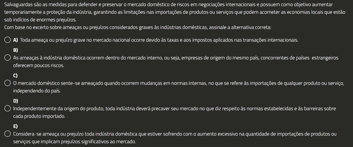 Salvaguardas são as medidas para defender e preservar mercado doméstico de riscos em negociações internacionais e possuem como objetivo aumentar temporariamente a proteção da indústria, garantindo as limitações nas importações de produtos ou serviços que podem acometer as economias locais que estão sob indícios de enormes prejuízos. Com base no excerto sobre ameaças ou prejuízos considerados graves às indústrias domésticas, assinale a alternativa correta: A) Toda ameaça ou prejuízo grave no mercado nacional ocorre devido às taxas e aos impostos aplicados nas transações internacionais. B) As ameaças à indústria doméstica ocorrem dentro do mercado interno, ou seja, empresas de origem do mesmo país, concorrentes de países estrangeiros oferecem poucos riscos. C) mercado doméstico sente-se ameaçado quando ocorrem mudanças em normas internas, no que se refere às importações de qualquer produto ou serviço, independendo do país D) Independentemente da origem do produto, toda indústria deverá precaver seu mercado no que diz respeito às normas estabelecidas e às barreiras sobre cada produto importado. E) Considera-se ameaça ou prejuízo toda indústria doméstica que estiver sofrendo com aumento excessivo na quantidade de importações de produtos ou serviços que implicam prejuízos significativos ao mercado.