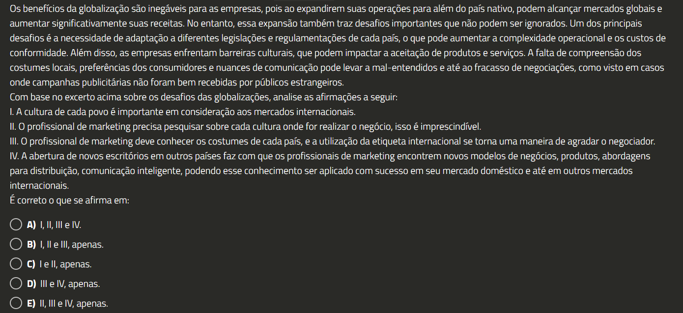 Os benefícios da globalização são inegáveis para as empresas, pois ao expandirem suas operações para além do país nativo, podem alcançar mercados globais e aumentar significativamente suas receitas. No entanto, essa expansão também traz desafios importantes que não podem ser ignorados. Um dos principais desafios é a necessidade de adaptação a diferentes legislações e regulamentações de cada país, que pode aumentar a complexidade operacional e os custos de conformidade. Além disso, as empresas enfrentam barreiras culturais, que podem impactar a aceitação de produtos e serviços. A falta de compreensão dos costumes locais, preferências dos consumidores e nuances de comunicação pode levar a mal-entendidos e até ao fracasso de negociações, como visto em casos onde campanhas publicitárias não foram bem recebidas por públicos estrangeiros. Com base no excerto acima sobre os desafios das globalizações, analise as afirmações a I. A cultura de cada povo é importante em consideração aos mercados internacionais. II. profissional de marketing precisa pesquisar sobre cada cultura onde for realizar negócio, isso é imprescindível. III. profissional de marketing deve conhecer os costumes de cada país, e a utilização da etiqueta internacional se torna uma maneira de agradar negociador. IV. A abertura de novos escritórios em outros países faz com que os profissionais de marketing encontrem novos modelos de negócios, produtos, abordagens para distribuição, comunicação inteligente, podendo esse conhecimento ser aplicado com sucesso em seu mercado doméstico e até em outros mercados internacionais. É correto que se afirma em: A) I, II, III e IV. B) I, II e III, apenas. C) I e II, apenas. D) III e IV, apenas. E) II, III e IV, apenas.
