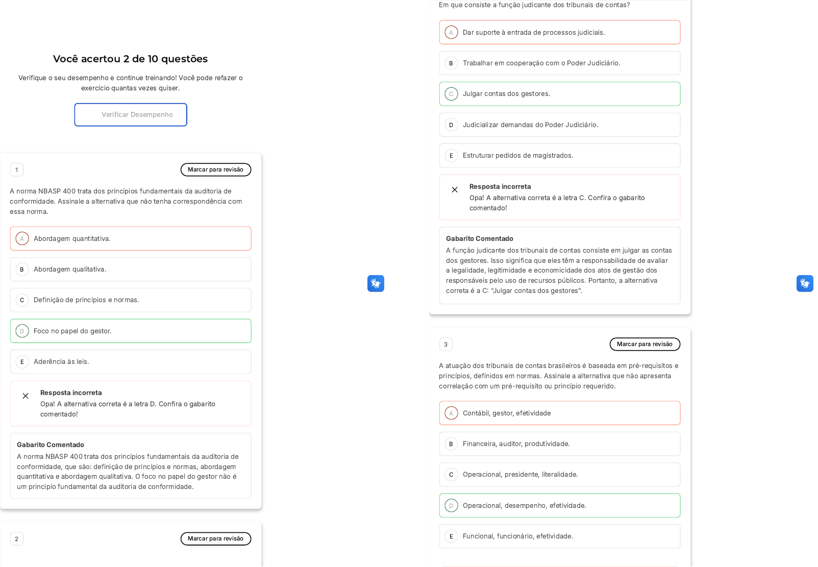 Você acertou 2 de 10 questões Verifique o seu desempenho e continue treinando! Você pode refazer o exercício quantas vezes quiser. Verificar Desempenho A B C D E 1 Marcar para revisão A norma NBASP 400 trata dos princípios fundamentais da auditoria de conformidade. Assinale a alternativa que não tenha correspondência com essa norma. Abordagem quantitativa. Abordagem qualitativa. Definição de princípios e normas. Foco no papel do gestor. Aderência às leis. Resposta incorreta Opa! A alternativa correta é a letra D. Confira o gabarito comentado! Gabarito Comentado A norma NBASP 400 trata dos princípios fundamentais da auditoria de conformidade, que são: definição de princípios e normas, abordagem quantitativa e abordagem qualitativa. O foco no papel do gestor não é um princípio fundamental da auditoria de conformidade. 2 Marcar para revisão A B C D E A B C D E Em que consiste a função judicante dos tribunais de contas? Dar suporte à entrada de processos judiciais. Trabalhar em cooperação com o Poder Judiciário. Julgar contas dos gestores. Judicializar demandas do Poder Judiciário. Estruturar pedidos de magistrados. Resposta incorreta Opa! A alternativa correta é a letra C. Confira o gabarito comentado! Gabarito Comentado A função judicante dos tribunais de contas consiste em julgar as contas dos gestores. Isso significa que eles têm a responsabilidade de avaliar a legalidade, legitimidade e economicidade dos atos de gestão dos responsáveis pelo uso de recursos públicos. Portanto, a alternativa correta é a C: "Julgar contas dos gestores". 3 Marcar para revisão A atuação dos tribunais de contas brasileiros é baseada em pré-requisitos e princípios, definidos em normas. Assinale a alternativa que não apresenta correlação com um pré-requisito ou princípio requerido. Contábil, gestor, efetividade Financeira, auditor, produtividade. Operacional, presidente, literalidade. Operacional, desempenho, efetividade. Funcional, funcionário, efetividade. A B C D E Resposta incorreta Opa! A alternativa correta é a letra D. Confira o gabarito comentado! Gabarito Comentado A alternativa correta é "Operacional, desempenho, efetividade". Esta alternativa não apresenta correlação com um pré-requisito ou princípio requerido para a atuação dos tribunais de contas brasileiros. Enquanto as demais alternativas apresentam uma combinação de elementos que se relacionam com as normas e princípios que regem a atuação desses tribunais, a alternativa D não faz essa correlação de maneira adequada. Portanto, ela é a resposta correta para a questão. 4 Marcar para revisão O nível 2 das Normas Brasileiras de Auditoria do Setor Público define os objetivos, marcos e princípios que devem ser seguidos nas fases de planejamento, execução e elaboração do relatório de auditoria. Assinale a alternativa que não corresponde à descrição de uma dessas normas. Princípios fundamentais da estratégia de auditoria. Princípios fundamentais de auditoria do setor público. Princípios fundamentais de auditoria financeira. Princípios fundamentais de auditoria operacional. Princípios fundamentais de auditoria de conformidade. Resposta correta Parabéns, você selecionou a alternativa correta. Confira o gabarito comentado! Gabarito Comentado A alternativa que não corresponde à descrição de uma das normas do nível 2 das Normas Brasileiras de Auditoria do Setor Público é a "Princípios fundamentais da estratégia de auditoria". As normas desse nível são focadas em princípios de auditoria específicos para o setor público, auditoria financeira, auditoria operacional e auditoria de conformidade, não abrangendo estratégias de auditoria de forma geral. A B C D E A B C 5 Marcar para revisão As Normas Brasileiras de Auditoria do Setor Público foram divididas em três níveis. Assinale a alternativa incorreta quanto aos pontos abordados nessas normas. Independência dos Tribunais de Contas. Transparência e accountability. Controle de qualidade das auditorias. Conjuntura econômica em tempos de crise. Princípios fundamentais de auditoria financeira. Resposta incorreta Opa! A alternativa correta é a letra D. Confira o gabarito comentado! Gabarito Comentado A alternativa D é a incorreta. As Normas Brasileiras de Auditoria do Setor Público não abordam a conjuntura econômica em tempos de crise. Elas focam em aspectos como a independência dos Tribunais de Contas, a transparência e a accountability, o controle de qualidade das auditorias e os princípios fundamentais de auditoria financeira. A conjuntura econômica em tempos de crise é um tema que, embora importante, não é diretamente tratado nessas normas. 6 Marcar para revisão Os agentes públicos devem atuar sem discriminação ou opção por razões pessoais. Todos são iguais perante a lei. Assinale a alternativa correta que corresponda a este princípio: Impessoalidade. Legalidade. Moralidade. D E A B C D E Publicidade. Eficiência. Resposta correta Parabéns, você selecionou a alternativa correta. Confira o gabarito comentado! Gabarito Comentado O princípio da Impessoalidade, que é a alternativa correta, refere-se à obrigação dos agentes públicos de agirem de acordo com a lei, sem favorecimentos ou discriminações por razões pessoais. Este princípio é fundamental para garantir a igualdade de todos perante a lei, assegurando que as ações e decisões tomadas pelos agentes públicos sejam justas e imparciais. 7 Marcar para revisão Além dos princípios constitucionais expressos no art. 37 da Constituição Federal, temos outros princípios éticos que delineiam a atuação dos agentes públicos, que são: Governança, gestão, estratégia. Gestão, estratégia, eficiência. Estratégia, eficiência, motivação. Motivação, probidade, autotutela. Eficácia, eficiência e probidade. Resposta incorreta Opa! A alternativa correta é a letra D. Confira o gabarito comentado! Gabarito Coment