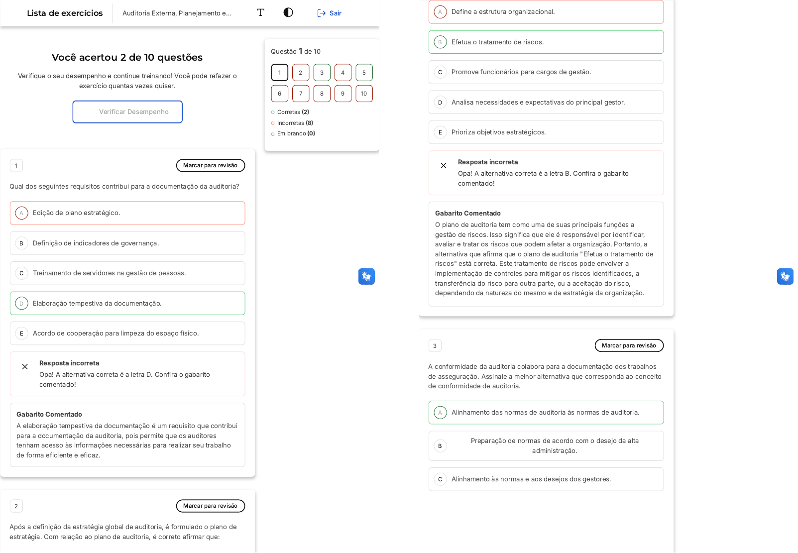 Você acertou 2 de 10 questões Verifique o seu desempenho e continue treinando! Você pode refazer o exercício quantas vezes quiser. Verificar Desempenho A B C D E 1 Marcar para revisão Qual dos seguintes requisitos contribui para a documentação da auditoria? Edição de plano estratégico. Definição de indicadores de governança. Treinamento de servidores na gestão de pessoas. Elaboração tempestiva da documentação. Acordo de cooperação para limpeza do espaço físico. Resposta incorreta Opa! A alternativa correta é a letra D. Confira o gabarito comentado! Gabarito Comentado A elaboração tempestiva da documentação é um requisito que contribui para a documentação da auditoria, pois permite que os auditores tenham acesso às informações necessárias para realizar seu trabalho de forma eficiente e eficaz. 2 Marcar para revisão Após a definição da estratégia global de auditoria, é formulado o plano de estratégia. Com relação ao plano de auditoria, é correto afirmar que: Questão 1 de 10 Corretas (2) Incorretas (8) Em branco (0) 1 2 3 4 5 6 7 8 9 10 Lista de exercícios Auditoria Externa, Planejamento e… Sair A B C D E A B C Define a estrutura organizacional. Efetua o tratamento de riscos. Promove funcionários para cargos de gestão. Analisa necessidades e expectativas do principal gestor. Prioriza objetivos estratégicos. Resposta incorreta Opa! A alternativa correta é a letra B. Confira o gabarito comentado! Gabarito Comentado O plano de auditoria tem como uma de suas principais funções a gestão de riscos. Isso significa que ele é responsável por identificar, avaliar e tratar os riscos que podem afetar a organização. Portanto, a alternativa que afirma que o plano de auditoria "Efetua o tratamento de riscos" está correta. Este tratamento de riscos pode envolver a implementação de controles para mitigar os riscos identificados, a transferência do risco para outra parte, ou a aceitação do risco, dependendo da natureza do mesmo e da estratégia da organização. 3 Marcar para revisão A conformidade da auditoria colabora para a documentação dos trabalhos de asseguração. Assinale a melhor alternativa que corresponda ao conceito de conformidade de auditoria. Alinhamento das normas de auditoria às normas de auditoria. Preparação de normas de acordo com o desejo da alta administração. Alinhamento às normas e aos desejos dos gestores. D E A B C D E Formação de requisitos de auditoria. Abordagem por evidências. Resposta correta Parabéns, você selecionou a alternativa correta. Confira o gabarito comentado! Gabarito Comentado O conceito de conformidade de auditoria está diretamente relacionado ao alinhamento das normas de auditoria às normas de auditoria. Isso significa que as práticas de auditoria devem estar em conformidade com as normas estabelecidas para a auditoria, garantindo assim a qualidade e a eficácia do processo de auditoria. Portanto, a alternativa correta é: "Alinhamento das normas de auditoria às normas de auditoria". 4 Marcar para revisão Ao longo do desenvolvimento de uma auditoria, é realizada sua documentação. Indique a alternativa que melhor corresponda a um dos pontos relevantes dessa documentação. Monitoramento de processos organizacionais. Impactos e resultados alcançados na entrega de produtos e serviços. Responsabilização de trabalhos. Análise da estrutura organizacional. Gerenciamento de oportunidades do cenário externo. Resposta incorreta Opa! A alternativa correta é a letra C. Confira o gabarito comentado! Gabarito Comentado A alternativa correta é a "C", que se refere à "Responsabilização de trabalhos". Isso significa que, durante a documentação de uma A B C D E auditoria, é crucial registrar quem é responsável por cada tarefa. Isso é importante para garantir a responsabilidade e a transparência durante o processo de auditoria. As outras alternativas, embora possam ser relevantes em outros contextos, não são tão diretamente relacionadas à documentação de uma auditoria quanto a alternativa correta. 5 Marcar para revisão O trabalho de asseguração depende de elementos específicos para que seja realizado. Assinale a alternativa correta quanto a um desses elementos: Relação de três partes Dualidade de atuação Relação de quatro partes Segregação de funções Gestão Resposta correta Parabéns, você selecionou a alternativa correta. Confira o gabarito comentado! Gabarito Comentado O trabalho de asseguração, em sua essência, envolve uma relação de três partes: a organização que fornece a asseguração, a parte que recebe a asseguração e a parte que se beneficia da asseguração. Portanto, a alternativa correta é "Relação de três partes". As outras opções não se aplicam diretamente ao conceito de trabalho de asseguração. 6 Marcar para revisão A documentação de auditoria depende de vários fatores organizacionais. Assinale a alternativa que não corresponda a um desses fatores. A B C D E A B C Tamanho da organização. Natureza dos procedimentos. Riscos de distorção relevante. Relevância das evidências. Índices de governança de auditoria. Resposta incorreta Opa! A alternativa correta é a letra E. Confira o gabarito comentado! Gabarito Comentado A alternativa correta é a letra E: "Índices de governança de auditoria". Isso ocorre porque, embora os índices de governança de auditoria possam ser importantes para a gestão de uma organização, eles não são um fator que influencia diretamente a documentação de auditoria. A documentação de auditoria é influenciada por fatores como o tamanho da organização, a natureza dos procedimentos, os riscos de distorção relevante e a relevância das evidências. Esses fatores podem afetar a quantidade e o tipo de documentação necessária, bem como a forma como a documentação é organizada e gerenciada. 7 Marcar para revisão O trabalho de asseguração depende de evidências, que são colet
