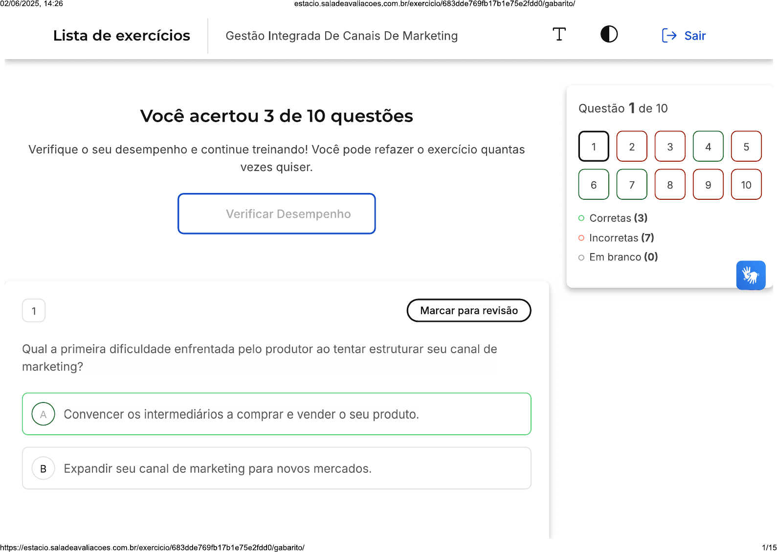 02/06/2025, 14:26 Lista de exercícios Gestão Integrada De Canais De Marketing T Sair Questão 1 de 10 Você acertou 3 de 10 questões Verifique o seu desempenho e continue treinando! Você pode refazer o exercício quantas 1 2 3 4 5 vezes quiser. 6 7 8 9 10 Verificar Desempenho Corretas (3) Incorretas (7) Em branco (0) 1 Marcar para revisão Qual a primeira dificuldade enfrentada pelo produtor ao tentar estruturar seu canal de marketing? A Convencer os intermediários a comprar e vender o seu produto. B Expandir seu canal de marketing para novos mercados. 1/1502/06/2025, 14:26 C Decidir sobre quais canais utilizar. D Decidir quais intermediários usar em cada nível do canal. E Nenhuma das afirmações. X Resposta incorreta Opa! A alternativa correta é a letra A. Confira o gabarito comentado! Gabarito Comentado A alternativa correta é a "Convencer os intermediários a comprar e vender o seu produto". Isso ocorre porque, ao estruturar um canal de marketing, o primeiro desafio do produtor é garantir que os intermediários estejam dispostos a comprar e vender seu produto. Sem essa etapa inicial, as demais dificuldades, como a expansão para novos mercados ou a decisão sobre quais canais utilizar, tornam-se irrelevantes, pois sem a cooperação dos intermediários, o canal de marketing não pode funcionar efetivamente. 2 Marcar para revisão 2/1502/06/2025, 14:26 Para projetar e gerenciar um canal de marketing de forma eficaz, é necessário analisar as necessidades dos clientes, definir os objetivos do canal e identificar e avaliar as principais alternativas de canal disponíveis. A matriz de estratégias de distribuição por canais pode ser útil nesse processo. Essa matriz relaciona A tipos com quantidade de pontos de venda B tipos com quantidade de produtos C linhas com tipos de produtos D níveis com tamanho do canal E localização com profundidade do ponto de venda X Resposta incorreta Opa! A alternativa correta é a letra A. Confira o gabarito comentado! Gabarito Comentado 3/1502/06/2025, 14:26 TIPOS DE PONTOS DE VENDA Uma única Várias categoria categorias Distribuição Distribuição exclusiva ou DE Poucos limitada seletiva Distribuição Muitos intensiva dentro de Distribuição uma categoria de intensiva estabelecimento 3 Marcar para revisão Entre as decisões a serem tomadas ao arquitetar os canais do produtor, qual questão não precisa ser considerada? A Quantidade de produtos perdidos. B Intensidade de distribuição desejada. C Apoio de serviços. https://estacio.saladeavaliacoes.com.br/exercicio/683dde769fb17b1e75e2fdd0/gabarito/ 4/1502/06/2025, 14:26 D Quantidade de níveis do canal. E Tamanho do lote do produto. X Resposta incorreta Opa! A alternativa correta é a letra A. Confira o gabarito comentado! Gabarito Comentado A alternativa correta é a "Quantidade de produtos perdidos". Isso porque, ao arquitetar os canais do produtor, as considerações principais envolvem a intensidade de distribuição desejada, o apoio de serviços, a quantidade de níveis do canal e o tamanho do lote do produto. A quantidade de produtos perdidos não é uma consideração direta na arquitetura dos canais, pois está mais relacionada à gestão de estoque e logística do que à estruturação dos canais de distribuição. 4 Marcar para revisão Para o sucesso do desenho de uma estratégia de canal é preciso gerenciar o canal de marketing. O gerenciamento do canal nada mais é do que a administração da relação entre todos os intermediários do canal. Esse processo engloba: I. seleção dos intermediários II. liderança do canal https://estacio.saladeavaliacoes.com.br/exercicio/683dde769fb17b1e75e2fdd0/gabarito/ 5/1502/06/2025, 14:26 III. cooperação entre os intermediários do canal IV. treinamento e a avaliação dos intermediários V. alterações na estrutura do canal Assinale a alternativa que indica os itens corretos. A I, II, III, IV e V B I, II, III e IV, apenas C I, II, IV e V, apenas D I, III, IV e V, apenas E II, III, IV e V, apenas Resposta correta Parabéns, você selecionou a alternativa correta. Confira o gabarito comentado! Gabarito Comentado gerenciamento do canal de marketing é a administração da relação entre os intermediários do canal. Envolve a seleção dos intermediários, a liderança do canal, a 6/1502/06/2025, 14:26 cooperação entre os intermediários do canal, o treinamento e a avaliação dos intermediários e as alterações na estrutura do canal. 5 Marcar para revisão fabricante deve determinar como será a estrutura do canal de vendas para distribuição do seu produto para o consumidor final. Nesse contexto, existem diversos formatos e organizações possíveis para o canal. Um canal múltiplo é quando A o fabricante distribui diretamente seu produto ao consumidor final o produtor decide contratar terceiros para distribuir seus produtos até o B consumidor final C o produtor opta por utilizar dois tipos de canais: o canal direto e o indireto D o produtor utiliza no mesmo canal características dos canais direto e indireto E o fabricante distribui seu produto diretamente para o varejista 7/1502/06/2025, 14:26 X Resposta incorreta Opa! A alternativa correta é a letra C. Confira o gabarito comentado! Gabarito Comentado Chamamos de canal múltiplo quando o produtor opta por utilizar os dois tipos de canais anteriores: o canal direto e o indireto. Os canais mais utilizados neste tipo são o e-commerce (canal direto) e o varejo (canal indireto). A principal característica deste canal é a tentativa de alcançar consumidores com diferentes hábitos de compra. O exemplo mais conhecido de empresa que utiliza este tipo de canal é a fabricante de computadores e produtos eletrônicos, Dell, que utiliza e-commerce, televendas e consultores de venda como canais diretos, e varejistas, tanto físicos quanto virtuais, como canais indiretos. 6 Marcar para revisão Um produtor de pães integrais vende seus produtos frescos, diariamente, para lojas d