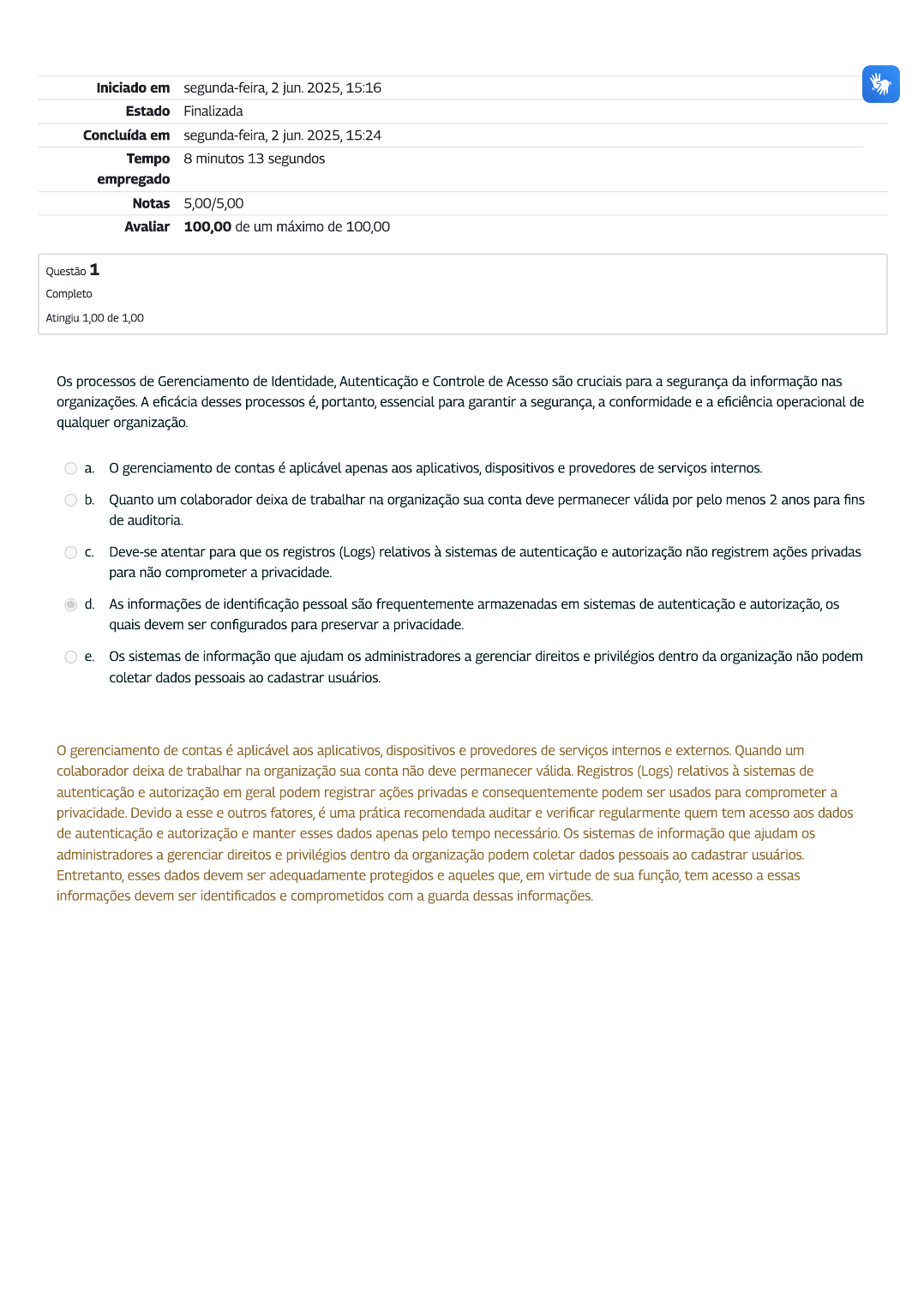Iniciado em segunda-feira, 2 jun. 2025, 15:16 Estado Finalizada Concluída em segunda-feira, 2 jun. 2025, 15:24 Tempo 8 minutos 13 segundos empregado Notas 5,00/5,00 Avaliar 100,00 de um máximo de 100,00 Questão 1 Completo Atingiu 1,00 de 1,00 Os processos de Gerenciamento de Identidade, Autenticação e Controle de Acesso são cruciais para a segurança da informação nas organizações. A eficácia desses processos é, portanto, essencial para garantir a segurança, a conformidade e a eficiência operacional de qualquer organização. a. o gerenciamento de contas é aplicável apenas aos aplicativos, dispositivos e provedores de serviços internos. b. Quanto um colaborador deixa de trabalhar na organização sua conta deve permanecer válida por pelo menos 2 anos para fins de auditoria. C. Deve-se atentar para que os registros (Logs) relativos à sistemas de autenticação e autorização não registrem ações privadas para não comprometer a privacidade. d. As informações de identificação pessoal são frequentemente armazenadas em sistemas de autenticação e autorização, os quais devem ser configurados para preservar a privacidade. e. Os sistemas de informação que ajudam os administradores a gerenciar direitos e privilégios dentro da organização não podem coletar dados pessoais ao usuários. o gerenciamento de contas é aplicável aos aplicativos, dispositivos e provedores de serviços internos e externos. Quando um colaborador deixa de trabalhar na organização sua conta não deve permanecer válida. Registros (Logs) relativos à sistemas de autenticação e autorização em geral podem registrar ações privadas e consequentemente podem ser usados para comprometer a privacidade. Devido a esse e outros fatores, é uma prática recomendada auditar e verificar regularmente quem tem acesso aos dados de autenticação e autorização e manter esses dados apenas pelo tempo necessário. Os sistemas de informação que ajudam os administradores a gerenciar direitos e privilégios dentro da organização podem coletar dados pessoais ao usuários. Entretanto, esses dados devem ser adequadamente protegidos e aqueles que, em virtude de sua função, tem acesso a essas informações devem ser identificados e comprometidos com a guarda dessas informações.Questão 2 Completo Atingiu 1,00 de 1,00 As organizações possuem uma série de dados, que são importantes para o negócio, dentre eles os dados pessoais. o tratamento desses dados deve estar de acordo com as regulamentações de proteção de dados e privacidade, pois a não conformidade pode afetar os direitos e garantias dos titulares de dados, além de prejuízos financeiros e reputacionais. Além disso, a perda de controle da organização sobre os dados protegidos ou sensíveis é um sério e frequente impacto relatado no negócio. Sobre a proteção de dados, ativos e infraestrutura tecnológica, escolha a opção correta: a. Um esquema de classificação de dados precisa necessariamente ser realizado de forma automatizada por meio de software, mas os administradores de e os responsáveis pela privacidade devem ter um conhecimento geral dos tipos de dados coletados. b. A restauração de backups durante o teste deve ser feita com cuidado. Se os dados confidenciais forem restaurados, esse sistema deve ser devidamente protegido e excluído com segurança após a conclusão do exercício. C. S logs são muito úteis, tanto para desenvolvedores quanto para equipe de TI, na melhoria e na solução de problemas, porém não devem armazenar informações pessoais, para que não tragam implicações para privacidade. d. Os servidores de e-mail devem informações por muito tempo para fins de auditoria. e. o uso de HTTP pode fornecer confidencialidade de dados pessoais no transporte quando um conjunto de cifras apropriado é necessário. Isso deve ser feito para informações pessoais sensíveis, a menos que a confidencialidade possa ser garantida por outros meios. Um esquema de classificação de dados não precisa necessariamente ser realizado de forma automatizada por meio de software. Os logs são muito úteis, tanto para desenvolvedores quanto para equipe de TI, na melhoria e na solução de problemas, podem armazenar informações pessoais e trazer implicações para privacidade. Por isso é necessária sua adequada proteção. Os servidores de e-mail não devem reter informações por muito tempo pois podem agravar o risco de violação de dados. HTTP não fornece um serviço de transporte de dados com confiabilidade, devendo ser adotada sua versão segura HTTPS.Questão 3 Completo Atingiu 1,00 de 1,00 Não podemos confiar que as defesas da rede sejam perfeitas. Os adversários continuam a evoluir e amadurecer à medida que compartilham ou vendem informações. As ferramentas de segurança somente são eficazes se oferecerem suporte a um processo de monitoramento contínuo que permita à equipe ser alertada e rapidamente a incidentes de segurança. Ter uma consciência situacional abrangente aumenta a velocidade de detecção e resposta, que é fundamental para minimizar um possível impacto negativo para o órgão, por exemplo, ao responder rapidamente quando um malware é descoberto, credenciais são roubadas ou quando dados sensíveis são comprometidos. Sobre os processos de monitoramento contínuo do ambiente tecnológico da organização, selecione a opção INCORRETA: a. As informações de tráfego de rede coletadas pelo IDS Intrusion Detection System (Sistema de Detecção de Intrusão), IPS Intrusion Prevention System (Sistema de Prevenção de Intrusão) e softwares de filtragem de aplicativos devem ser armazenadas e protegidas adequadamente para evitar um vazamento de dados que possam dados pessoais b. A organização deve monitorar os sistemas de informação, de forma a poder detectar ataques e recolher indicadores potenciais de incidentes, de acordo com a estratégia definida. C. A organização deve ajus