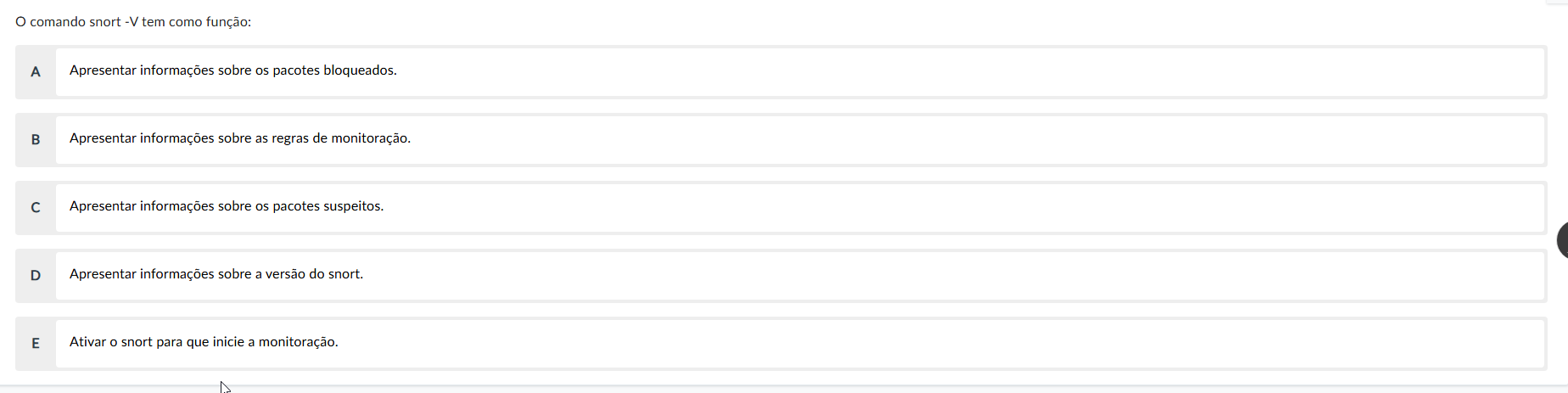 comando snort -V tem como função: A Apresentar informações sobre os pacotes bloqueados. B Apresentar informações sobre as regras de monitoração. C Apresentar informações sobre os pacotes suspeitos. D Apresentar informações sobre a versão do snort. E Ativar o snort para que inicie a monitoração.