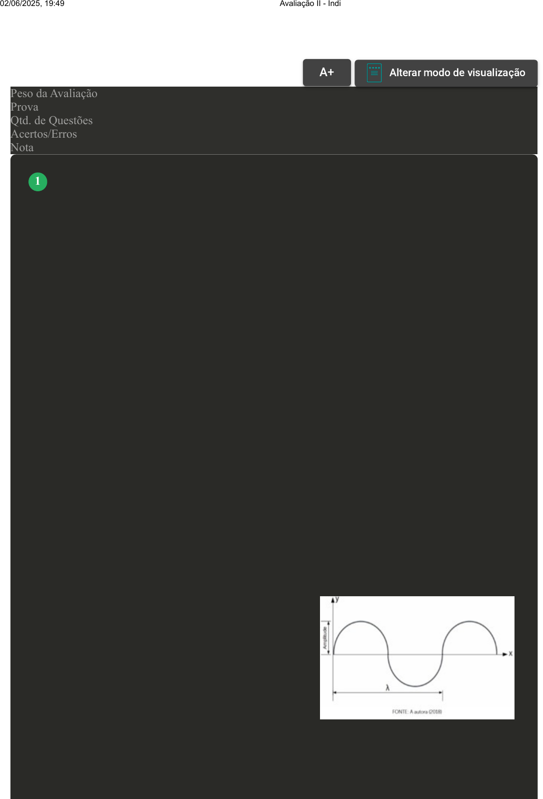 Prova Impressa GABARITO | Avaliação II - Individual (Cod.:828302) Peso da Avaliação 1,50 Prova 67292006 Qtd. de Questões 10 Acertos/Erros 8/2 Nota 8,00 As ondas mecânicas estão divididas em dois outros subtipos: longitudinais e transversais. As ondas longitudinais são aquelas em que "o movimento das moléculas é paralelo à direção de propagação da onda" (HALLIDAY; RESNICK; WALKER, 2016, p. 120). As ondas sonoras são consideradas ondas longitudinais. As ondas transversais são aquelas nas quais o movimento das moléculas é perpendicular a sua propagação. Considerando apenas as ondas sonoras, temos como características de sua propagação as frentes de onda, que são definidas como "superfícies nas quais as oscilações produzidas pelas ondas sonoras têm o mesmo valor" (HALLIDAY; RESNICK; WALKER, 2016, p. 154). Por outro lado, raios são vetores perpendiculares às frentes de onda, que mostram a direção de propagação da onda. Perto de uma fonte pontual de ondas sonoras, as frentes de onda são sempre esféricas. Dessa forma percebemos que o som tem uma propagação tridimensional. Quanto mais longe da fonte, mais distorções são acrescentadas a essa frente de onda, de forma que, se considerarmos a fonte muito longe, as frentes de onda podem ser consideradas planas e paralelas. Uma onda sonora pode ser determina conforme imagem abaixo. Sendo assim, classifique V para as sentenças verdadeiras e F para as falsas: ( ) Comprimento de onda (Lambda): é o tamanho do comprimento de um ciclo da onda sonora, ou seja, a distância entre dois pontos de oscilação que estão no mesmo ponto da onda. Ou seja, onde o padrão de compressões e expansões relacionados à onda sonora se repete. ( ) Frequência (f): a frequência é a quantidade de ciclos que a onda sonora faz em um segundo. Esse parâmetro é comumente utilizado no cotidiano, principalmente quando se fala de som, pois ligamos sons agudos a altas frequências e sons graves, às baixas frequências. ( ) Intensidade: também chamada de amplitude, essa característica está relacionada ao volume do som, ou seja, o quão intenso é a onda sonora. Na análise da forma da onda, a amplitude pode ser entendida como a maior diferença entre a posição da onda ( ) Ruído: perturbações indesejadas acrescentadas a onda sonora, entre a sua emissão e sua captação. Há vários métodos matemáticos desenvolvidos para tentar minimizar o efeito do ruído. É considerado uma forma de incerteza. ( ) Período (T): é o tempo que leva para uma onda fazer o seu ciclo completo. Ou seja, é o tempo que leva para que haja o deslocamento referente a um comprimento de onda. Matematicamente, o período é o inverso da frequência. Assinale a alternativa que apresenta a sequência CORRETA: A F - F - F - F - F. B F - F - V - V - V. VOLTAR A+ Alterar modo de visualização 1 02/06/2025, 19:49 Avaliação II - Individual about:blank 1/8 C V - V - F - F - F. D V - V - V - V - V. Os corpos que absorvem ou emitem calor passam por transformações drásticas em suas propriedades, principalmente naquelas que definem a equação de estado (P,V,T). Considerando também os efeitos desses processos sobre a energia interna, os trabalhos realizados e o calores envolvidos, podemos conceber uma separação entre os tipos de capacidades térmicas ao volume ou à pressão constantes. Sobre os processos termodinâmicos, classifique V para as sentenças verdadeiras e F para as falsas: ( ) Em um processo adiabático as grandezas físicas como pressão, volume e temperatura se alteram. A expansão livre é um tipo específico de processo adiabático em que não há trabalho realizado sobre o gás. ( ) Tomando o mesmo número de mols de dois gases ideais distintos, aquele que apresentar uma menor capacidade térmica, a pressão constante será aquele cuja energia interna terá o maior intervalo de variação, considerando-se a mesma variação de temperatura. ( ) Tomando o mesmo número de mols de dois gases ideais distintos, aquele que apresentar uma maior capacidade térmica a volume constante será aquele cuja energia interna terá o maior intervalo de variação, considerando-se a mesma variação de temperatura. ( ) O trabalho realizado por um sistema, para movê-lo por uma determinada variação positiva de temperatura é equivalente à diferença entre os calores absorvidos pela pressão e o volume constantes. Assinale a alternativa que apresenta a sequência CORRETA: A F - F - V - F. B V - V - F - V. C V - F - V - V. D F - V - V - V. O estudo da ondulatória são os efeitos característicos das ondas. No caso das ondas mecânicas e em especial das ondas sonoras, temos pelo menos quatro efeitos importantes. Sobre estes efeitos, analise as sentenças a seguir: I- Refração: o fenômeno é mais conhecido na óptica geométrica com a presença de espelhos. Entretanto, também é possível observar tal fenômeno com ondas mecânicas, como as ondas sonoras. O efeito acontece quando a onda incide em uma superfície refletora, o que faz com que a onda mude de sentido. II- Reflexão: o fenômeno é caracterizado pela alteração da direção da onda quando essa passa entre meios com características diferentes. É o caso, por exemplo, da alteração do som ao passar por uma parede. Durante a refração apenas a frequência da onda é mantida constante e alterações também na sua velocidade de deslocamento e comprimento de onda são comuns. Na passagem entre meios diferentes também pode ocorrer a atenuação da amplitude da onda, princípio base utilizado no planejamento isolação sonora de ambientes. III- Ressonância: todas as estruturas mecânicas têm uma ou mais frequências naturais de oscilação. Quando a estrutura recebe uma onda sonora com frequência igual a uma das frequências naturais de 2 Revisar Conteúdo do Livro 3 02/06/2025, 19:49 Avaliação II - Individual about:blank 2/8 oscilação, a amplitude aumenta consideravelmente. Há casos, c