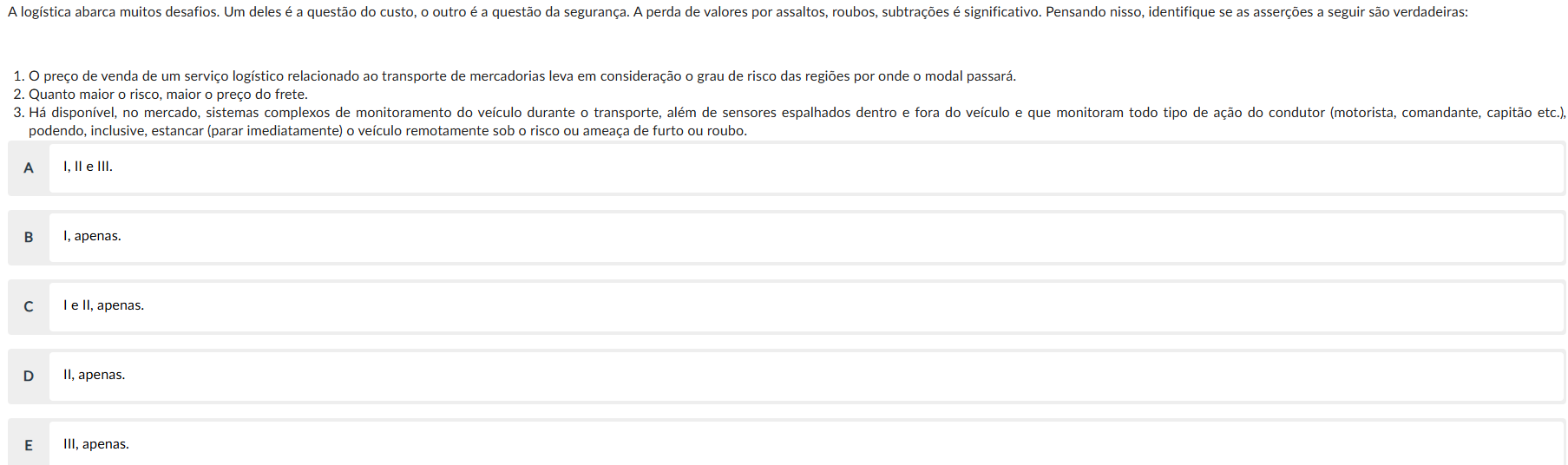 A logística abarca muitos desafios. Um deles é a questão do custo, o outro é a questão da segurança. A perda de valores por assaltos, roubos, subtrações é significativo. Pensando nisso, identifique se as asserções a seguir são verdadeiras: 1. preço de venda de um serviço logístico relacionado ao transporte de mercadorias leva em consideração grau de risco das regiões por onde modal passará. 2. Quanto maior risco, maior preço do frete. 3. Há disponível, no mercado, sistemas complexos de monitoramento do veículo durante o transporte, além de sensores espalhados dentro e fora do veículo e que monitoram todo tipo de ação do condutor (motorista, comandante, capitão podendo, inclusive, estancar imediatamente) veículo remotamente sob risco ou ameaça de furto ou roubo. A II e III. B apenas. C I e II, apenas. D II, apenas. E III. apenas.