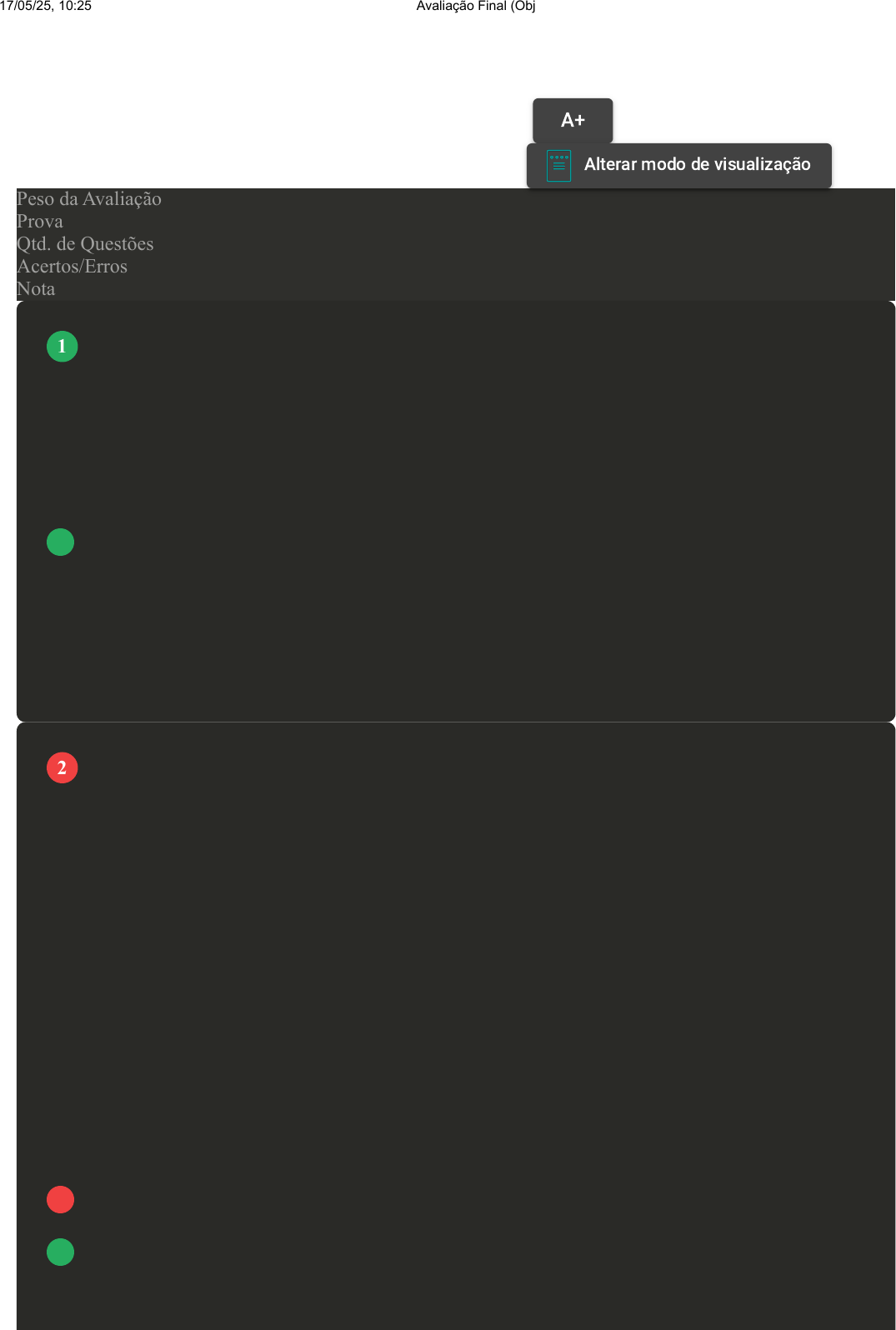 Prova Impressa GABARITO | Avaliação Final (Objetiva) - Individual (Cod.:691757) Peso da Avaliação 3,00 Prova 37820013 Qtd. de Questões 10 Acertos/Erros 9/1 Nota 9,00 A Comissão Interna de Prevenção de Acidentes tem suas disposições descritas nas NR 05 da Portaria n° 3214/78. Considerando o disposto para a realização do treinamento dos membros de CIPA, assinale a alternativa INCORRETA: FONTE: http://www.guiatrabalhista.com.br/legislacao/nr/nr5.htm. Acesso em: 1° jun. 2021. A Noções sobre as legislações trabalhistas e previdenciária relativas à segurança e saúde no trabalho é um componente curricular obrigatório do treinamento para membros de CIPA. B O treinamento deverá ser ministrado obrigatoriamente pelos profissionais do SESMT da empresa. C O estudo do ambiente, das condições de trabalho, bem como dos riscos originados do processo produtivo é um componente curricular obrigatório do treinamento para membros de CIPA. D O treinamento deverá ter carga horária de vinte horas, sendo no máximo em 8 horas diárias, e realizado durante o expediente normal da empresa. A higiene do trabalho permite estabelecer métodos de mitigação dos agentes ambientais e de seus efeitos na saúde dos trabalhadores. Considerando os aspectos relacionados à higiene do trabalho, analise as sentenças a seguir: I- O gerenciamento do tempo de exposição é uma medida de controle que permite a redução do perigo dos ambientes ocupacionais. II- Os limites de tolerância referem-se à concentração ou à intensidade máxima, relacionada com a natureza e o tempo de exposição ao agente, que não causará dano à saúde do trabalhador, durante a sua vida laboral. III- A distribuição dos trabalhadores em grupos homogêneos de exposição é utilizada para otimizar as avaliações ambientais. IV- As medidas de caráter administrativo e os Equipamentos de Proteção Individual (EPIs) deverão ser adotados quando comprovada a inviabilidade técnica ou insuficiência das medidas de proteção coletiva. Assinale a alternativa CORRETA: A Somente a sentença III está correta. B As sentenças I, II e IV estão corretas. C As sentenças II, III e IV estão corretas. D As sentenças I e IV estão corretas. VOLTAR A+ Alterar modo de visualização 1 2 17/05/25, 10:25 Avaliação Final (Objetiva) - Individual about:blank 1/6 O objetivo da Comissão Interna de Prevenção de Acidentes - CIPA - é prevenir que o trabalhador se acidente ou adquira uma doença no decorrer de seu trabalho, tornando o ambiente de trabalho favorável para o trabalhador. Com relação às atribuições do presidente da CIPA, analise as sentenças a seguir: I- O presidente é responsável por fazer a ata das reuniões. II- O presidente é encarregado por passar os afazeres ao vice-presidente. III- Cabe ao presidente da CIPA deixar o empregador ciente sobre as atividades da CIPA. IV- Cabe ao presidente da CIPA convocar os integrantes da CIPA para participar das reuniões. Assinale a alternativa CORRETA: A As sentenças I e IV estão corretas. B As sentenças II, III e IV estão corretas. C Somente a sentença I está correta. D As sentenças I, III e IV estão corretas. O mapeamento de risco é um levantamento dos locais de trabalho, apontando os riscos que são sentidos e observados pelos próprios trabalhadores, de acordo com a sua sensibilidade. O mapa de riscos é a representação gráfica do mapeamento de riscos ambientais. O mapa de riscos, os círculos de cores e os tamanhos diferentes mostram os locais e os fatores que podem gerar situações de perigo pela presença de agentes físicos, químicos, biológicos, ergonômicos e mecânicos. Como tecnólogo em segurança do trabalho, você deve ser capaz de identificar os riscos através das cores. Sobre o risco envolvido nos trabalhos e a cor que este deve ser representado no mapa de riscos, associe os itens, utilizando o código a seguir: I- Azul. II- Amarelo. III- Verde. IV- Vermelho. ( ) Contato com solventes orgânicos em uma indústria de galvanoplastia. ( ) Trabalho com exposição à eletricidade. ( ) Linha de produção com trabalho em turnos e repetitividade. ( ) Soldador exposto a radiações ionizantes. Assinale a alternativa que apresenta a sequência CORRETA: A I - II - IV - III. B III - IV - I - II. C IV - I - II - III. Revisar Conteúdo do Livro 3 4 17/05/25, 10:25 Avaliação Final (Objetiva) - Individual about:blank 2/6 D II - III - IV - I. O acidente de trabalho é um fato que pode ocorrer em qualquer empresa, independentemente de seu grau de risco ou de sua organização e estrutura com relação à Segurança e Medicina do Trabalho. Leia o relato a seguir: Num dia normal de trabalho, Osmar, chefe do setor de máquinas da indústria ABC, recebe a visita de Carlos, funcionário que viera a seu encontro com braço e cabeça enfaixados. Osmar: O que houve com você, Carlos? Carlos: Estou com uma luxação no meu braço e fiz um corte na cabeça ontem, um acidente. Osmar: Mas como foi acontecer isto? Carlos: Eu sofri um acidente de motocicleta enquanto voltava para casa depois do expediente de trabalho de ontem. Classifique V para as sentenças verdadeiras e F para as falsas: ( ) Neste caso, o chefe de setor não precisa providenciar a CAT, pois o acidente de Carlos não ficou caraterizado como acidente de trabalho. ( ) Já que Carlos sofreu um acidente de trabalho, e caso o chefe do setor negue-se a emitir a CAT, Carlos pode proceder ao seu preenchimento e dirigir-se a uma agência da Previdência para protocolar a comunicação. ( ) Neste caso, não se tem a necessidade de emissão da CAT, pois apesar de ser caracterizado como acidente de trabalho, o funcionário não ficará afastado do trabalho por período superior a 15 dias, dispensando, assim, sua emissão. ( ) O chefe do setor identifica que o que Carlos sofreu é considerado um acidente de trabalho, segundo a legislação, e procede o encaminhamento do funcionário ao setor responsável par