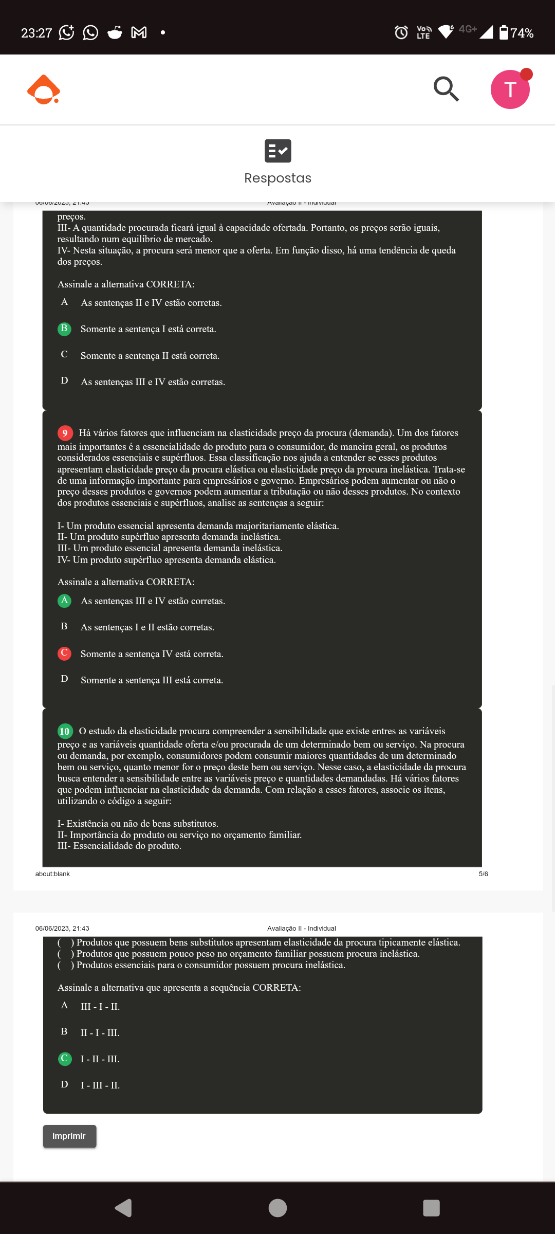 23:27 M 6 4G+ LTE 74% T Respostas preços. A quantidade procurada ficará igual à capacidade Portanto, os preços serão iguais, resultando num equilíbrio de mercado. IV- Nesta situação. a procura será menor que a oferta. Em função disso, há uma tendência de queda dos preços Assinale a alternativa CORRETA: A As sentenças e IV estão corretas. B Somente a sentença I está correta. C Somente a sentença II está correta. D As sentenças III e IV estão corretas. 9 Há vários fatores que influenciam na elasticidade preço da procura (demanda). Um dos fatores mais importantes é a essencialidade do produto para consumidor, de maneira geral, os produtos considerados essenciais e supérfluos. Essa classificação nos ajuda a entender se esses produtos apresentam elasticidade preço da procura elástica ou elasticidade preço da procura inelástica. Trata-se de uma informação importante para empresários e governo. Empresários podem aumentar ou não preço desses produtos e governos podem aumentar a tributação ou não desses produtos. No contexto dos produtos essenciais e supérfluos, analise as sentenças a seguir: Um produto essencial apresenta demanda majoritariamente elástica. Um produto supérfluo apresenta demanda inelástica. III- Um produto essencial apresenta demanda inelástica. IV- Um produto supérfluo apresenta demanda elástica. Assinale a alternativa CORRETA: A As sentenças III e IV estão corretas. B As sentenças I e II estão corretas. C Somente a sentença IV está correta. D Somente a sentença III está correta. 10 O estudo da elasticidade procura compreender a sensibilidade que existe entres as variáveis preço e as variáveis quantidade oferta e/ou procurada de um determinado bem ou serviço. Na procura ou demanda. por exemplo, consumidores podem consumir maiores quantidades de um determinado bem ou serviço. quanto menor for preço deste bem ou serviço. Nesse caso. a elasticidade da procura busca entender a sensibilidade entre as variáveis preço e quantidades demandadas. Há vários fatores que podem influenciar na elasticidade da demanda. Com relação a esses fatores. associe os itens, utilizando código a seguir: I- Existência ou não de bens substitutos. II- Importância do produto ou serviço no orçamento familiar. Essencialidade do produto. about:blank 5/6 21:43 Avaliação Individual ( ) Produtos que possuem bens substitutos apresentam elasticidade da procura tipicamente elástica. ) Produtos que possuem pouco peso no orçamento familiar possuem procura inelástica. ( ) Produtos essenciais para consumidor possuem procura inelástica Assinale a alternativa que apresenta a sequência CORRETA: A III II. B II C III. D I III II. Imprimir